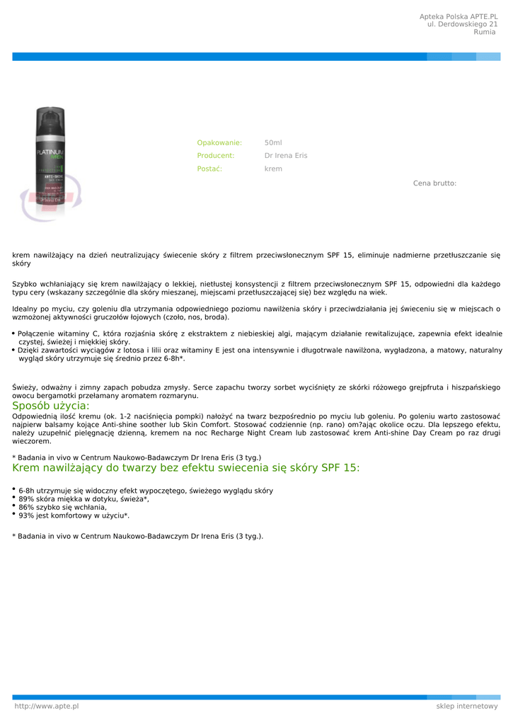 Apteka Polska APTE.PL ul. Derdowskiego 21 Rumia Opakowanie: 50ml Producent: Dr Irena Eris Postać: krem Cena brutto: krem nawilżający na dzień neutralizujący świecenie skóry z filtrem przeciwsłonecznym SPF 15, eliminuje nadmierne przetłuszczanie się skóry Szybko wchłaniający się krem nawilżający o lekkiej, nietłustej konsystencji z filtrem przeciwsłonecznym SPF 15, odpowiedni dla każdego typu cery (wskazany szczególnie dla skóry mieszanej, miejscami przetłuszczającej się) bez względu na wiek. Idealny po myciu, czy goleniu dla utrzymania odpowiedniego poziomu nawilżenia skóry i przeciwdziałania jej świeceniu się w miejscach o wzmożonej aktywności gruczołów łojowych (czoło, nos, broda). Połączenie witaminy C, która rozjaśnia skórę z ekstraktem z niebieskiej algi, mającym działanie rewitalizujące, zapewnia efekt idealnie czystej, świeżej i miękkiej skóry. Dzięki zawartości wyciągów z lotosa i lilii oraz witaminy E jest ona intensywnie i długotrwale nawilżona, wygładzona, a matowy, naturalny wygląd skóry utrzymuje się średnio przez 6-8h*. Świeży, odważny i zimny zapach pobudza zmysły. Serce zapachu tworzy sorbet wyciśnięty ze skórki różowego grejpfruta i hiszpańskiego owocu bergamotki przełamany aromatem rozmarynu. Sposób użycia: Odpowiednią ilość kremu (ok. 1-2 naciśnięcia pompki) nałożyć na twarz bezpośrednio po myciu lub goleniu. Po goleniu warto zastosować najpierw balsamy kojące Anti-shine soother lub Skin Comfort. Stosować codziennie (np. rano) om?ając okolice oczu. Dla lepszego efektu, należy uzupełnić pielęgnację dzienną, kremem na noc Recharge Night Cream lub zastosować krem Anti-shine Day Cream po raz drugi wieczorem. * Badania in vivo w Centrum Naukowo-Badawczym Dr Irena Eris (3 tyg.) Krem nawilżający do twarzy bez efektu swiecenia się skóry SPF 15: 6-8h utrzymuje się widoczny efekt wypoczętego, świeżego wyglądu skóry 89% skóra miękka w dotyku, świeża*, 86% szybko się wchłania, 93% jest komfortowy w użyciu*. * Badania in vivo w Centrum Naukowo-Badawczym Dr Irena Eris (3 tyg.). http://www.apte.pl sklep internetowy