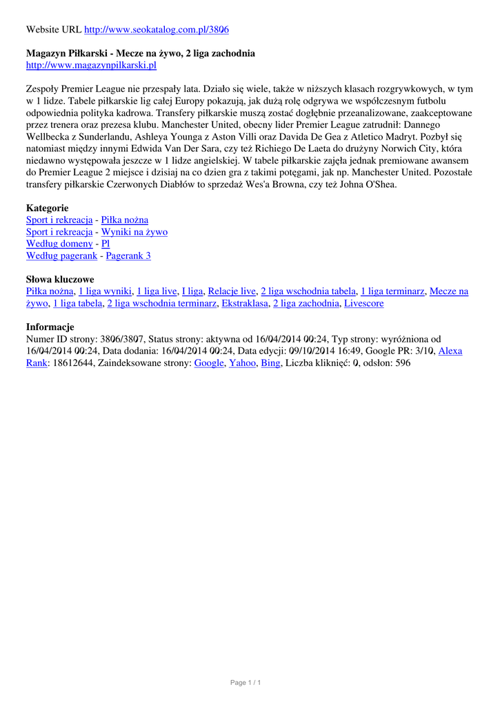 Website URL http://www.seokatalog.com.pl/3806 Magazyn Piłkarski - Mecze na żywo, 2 liga zachodnia http://www.magazynpilkarski.pl Zespoły Premier League nie przespały lata. Działo się wiele, także w niższych klasach rozgrywkowych, w tym w 1 lidze. Tabele piłkarskie lig całej Europy pokazują, jak dużą rolę odgrywa we współczesnym futbolu odpowiednia polityka kadrowa. Transfery piłkarskie muszą zostać dogłębnie przeanalizowane, zaakceptowane przez trenera oraz prezesa klubu. Manchester United, obecny lider Premier League zatrudnił: Dannego Wellbecka z Sunderlandu, Ashleya Younga z Aston Villi oraz Davida De Gea z Atletico Madryt. Pozbył się natomiast między innymi Edwida Van Der Sara, czy też Richiego De Laeta do drużyny Norwich City, która niedawno występowała jeszcze w 1 lidze angielskiej. W tabele piłkarskie zajęła jednak premiowane awansem do Premier League 2 miejsce i dzisiaj na co dzien gra z takimi potęgami, jak np. Manchester United. Pozostałe transfery piłkarskie Czerwonych Diabłów to sprzedaż Wes'a Browna, czy też Johna O'Shea. Kategorie Sport i rekreacja - Piłka nożna Sport i rekreacja - Wyniki na żywo Według domeny - Pl Według pagerank - Pagerank 3 Słowa kluczowe Piłka nożna, 1 liga wyniki, 1 liga live, I liga, Relacje live, 2 liga wschodnia tabela, 1 liga terminarz, Mecze na żywo, 1 liga tabela, 2 liga wschodnia terminarz, Ekstraklasa, 2 liga zachodnia, Livescore Informacje Numer ID strony: 3806/3807, Status strony: aktywna od 16/04/2014 00:24, Typ strony: wyróżniona od 16/04/2014 00:24, Data dodania: 16/04/2014 00:24, Data edycji: 09/10/2014 16:49, Google PR: 3/10, Alexa Rank: 18612644, Zaindeksowane strony: Google, Yahoo, Bing, Liczba kliknięć: 0, odsłon: 596 Page 1 / 1