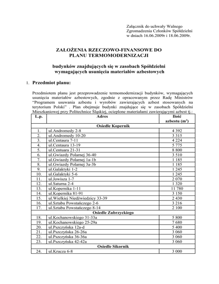 Załącznik do uchwały Walnego Zgromadzenia Członków Spółdzielni w dniach 16.06.2009r i 18.06.2009r. ZAŁOŻENIA RZECZOWO-FINANSOWE DO PLANU TERMOMODERNIZACJI budynków znajdujących się w zasobach Spółdzielni wymagających usunięcia materiałów azbestowych 1. Przedmiot planu: Przedmiotem planu jest przeprowadzenie termomodernizacji budynków, wymagających usunięcia materiałów azbestowych, zgodnie z opracowanym przez Radę Ministrów “Programem usuwania azbestu i wyrobów zawierających azbest stosowanych na terytorium Polski” . Plan obejmuje budynki znajdujące się w zasobach Spółdzielni Mieszkaniowej przy Politechnice Śląskiej, ocieplone materiałami zawierającymi azbest tj.: L.p. Adres Ilość azbestu (m2) Osiedle Kopernik 1. ul.Andromedy 2-8 4 392 2. ul.Andromedy 10-20 3 315 3. ul.Centaura 7-11 4 224 4. ul.Centaura 13-19 5 775 5. ul.Centuara 21-31 8 800 6. ul.Gwiazdy Polarnej 36-40 3 510 7. ul.Gwiazdy Polarnej 1a-1b 1 185 8. ul.Gwiazdy Polarnej 3a-3b 1 185 9. ul.Galaktyki 1-2 1 245 10. ul.Galaktyki 5-6 1 245 11. ul.Jowisza 1-7 2 070 12. ul.Saturna 2-4 1 320 13. ul.Kopernika 1-11 11 780 14. ul.Kopernika 81-91 3 150 15. ul.Wielkiej Niedźwiedzicy 33-39 2 430 16. ul.Sztabu Powstańczego 2-6 3 216 17. ul.Sztabu Powstańczego 8-14 2 100 Osiedle Zubrzyckiego 18. ul.Kochanowskiego 31-33a 5 800 19. ul.Kochanowskiego 25-29a 7 680 20. ul.Pszczyńska 12a-d 5 400 21. ul.Pszczyńska 26-26a 3 060 22. ul.Pszczyńska 36-36a 3 060 23. ul.Pszczyńska 42-42a 3 060 Osiedle Sikornik 24. ul.Krucza 6-8 3 000 2. Zakres rzeczowy termomodernizacji: Szczegółowy zakres rzeczowy termomodernizacji określony zostanie w sporządzonych dla każdego budynku audytach energetycznych oraz dokumentacji technicznej. Podstawowy zakres obejmuje wykonanie następujących robót: a) zdjęcie ocieplenia z materiałów azbestowych wraz z utylizacją azbestu, b) wykonanie ocieplenia ścian zewnętrznych budynków materiałami nie zawierającymi azbestu, według metody określonej w audycie energetycznym i dokumentacji technicznej, c) ocieplenie stropodachów i wymiana okien w częściach wspólnych budynków – w przypadku takiej konieczności, d) wykonanie robót dodatkowych, nie wchodzących w zakres termomodernizacji lecz związanych bezpośrednio z ich wykonywaniem tj. remont obróbek blacharskich, remont części konstrukcyjnej balkonów, remont (elewacji) części budynków nie ocieplonych materiałami azbestowymi, itp. 3. Zakres finansowy termomodernizacji: Zakres finansowy termomodernizacji obejmuje: a) koszty pośrednie: - koszty sporządzenia audytów energetycznych, - koszty sporządzenia dokumentacji projektowo-kosztorysowej, - koszty wykonania studium wykonalności, - koszty nadzoru autorskiego i obsługi inwestycyjnej, - koszty pozyskania kredytu, b) koszty bezpośrednie, które obejmują całość robót budowlanych. 4. System finansowania termomodernizacji: Finansowanie termomodernizacji budynków może odbywać się z następujących środków: a) dotacji pochodzącej ze środków Unii Europejskiej na sfinansowanie części kosztów termomodernizacji – maksymalna wysokość dotacji do 80% poniesionych kwalifikowanych kosztów przedsięwzięcia, b) kredytu z Banku Gospodarstwa Krajowego - maksymalna wysokość kredytu do 80% wartości przedsięwzięcia ( kredyt z premią termomodernizacją tj. umorzeniem 20% kredytu po zakończeniu realizacji), c) środków własnych, pochodzących ze zgromadzonego funduszu remontowego budynku który podlega termomodernizacji, przeznaczonych na sfinansowanie kosztów nie objętych dotacją ze środków Unii Europejskiej lub kredytem bankowym. Finansowanie termomodernizacji ze środków Unii Europejskiej możliwe będzie tylko w przypadku uzyskania tej dotacji i obejmuje wszystkie wyszczególnione w pkt.1 budynki za wyjątkiem budynku przy ul.Kruczej 6-8, ze względu na jego lokalizację na terenie nie objętym planem rewitalizacji miasta Gliwice. Finansowanie termomodernizacji kredytem bankowym następować będzie w przypadku nie uzyskania dotacji z Unii Europejskiej lub uzyskania jej w wysokości znacznie mniejszej od planowanego kosztu przedsięwzięcia. 5. Szacunkowe koszty termomodernizacji: Szacunkowe koszty termomodernizacji dla poszczególnych budynków określone zostały w oparciu o kosztorysy inwestorskie, sporządzone w poziomie cen IV kwartału 2008r. Koszty te będą podlegać aktualizacji w zależności od terminu przeprowadzana robót. L.p. Adres Szacunkowy koszt robót Osiedle Kopernik 1. 2. 3. 4. 5. 6. 7. 8. 9. 10. 11. 12. 13. 14. 15. 16. 17. 18. 19. 20. 21. 22. 23. 24. ul.Andromedy 2-8 ul.Andromedy 10-20 ul.Centaura 7-11 ul.Centaura 13-19 ul.Centuara 21-31 ul.Gwiazdy Polarnej 36-40 ul.Gwiazdy Polarnej 1a-1b ul.Gwiazdy Polarnej 3a-3b ul.Galaktyki 1-2 ul.Galaktyki 5-6 ul.Jowisza 1-7 ul.Saturna 2-4 ul.Kopernika 1-11 ul.Kopernika 81-91 ul.Wielkiej Niedźwiedzicy 33-39 ul.Sztabu Powstańczego 2-6 ul.Sztabu Powstańczego 8-14 Osiedle Zubrzyckiego ul.Kochanowskiego 31-33a ul.Kochanowskiego 25-29a ul.Pszczyńska 12a-d ul.Pszczyńska 26-26a ul.Pszczyńska 36-36a ul.Pszczyńska 42-42a Osiedle Sikornik ul.Krucza 6-8 1.230.000,00 1.100.000,00 1.030.000,00 1.890.000,00 3.000.000,00 930.000,00 340.000,00 330.000,00 390.000,00 390.000,00 650.000,00 460.000,00 3.520.000,00 980.000,00 730.000,00 1.020.000,00 650.000,00 1.700.000,00 3.600.000,00 840.000,00 1.300.000,00 1.280.000,00 1.300.000,00 1.000.000,00 6. Terminy realizacji: Termomodernizacja poszczególnych budynków przeprowadzana będzie sukcesywnie w kolejnych latach, przy czym termin ocieplania poszczególnych budynków ustalany będzie na podstawie posiadanych środków finansowych, zgromadzonych na funduszu remontowym oraz zdolności kredytowej danego budynku. Zakładane terminy oraz sposób finansowania nie powodują konieczności wzrostu wnoszonych wpłat na fundusz remontowy z tego tytułu.