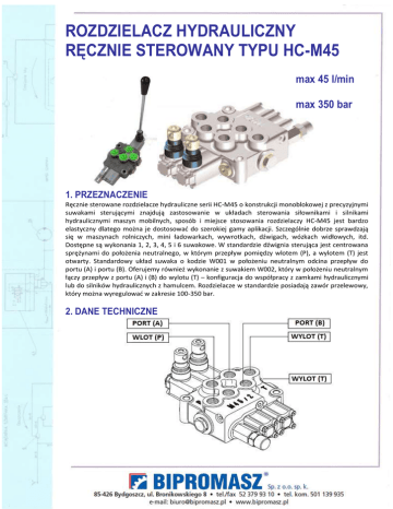 ROZDZIELACZ HYDRAULICZNY RĘCZNIE STEROWANY TYPU HC-M45 max 45 l/min max 350 bar 1. PRZEZNACZENIE Ręcznie sterowane rozdzielacze hydrauliczne serii HC-M45 o konstrukcji monoblokowej z precyzyjnymi suwakami sterującymi znajdują zastosowanie w układach sterowania siłownikami i silnikami hydraulicznymi maszyn mobilnych, sposób i miejsce stosowania rozdzielaczy HC-M45 jest bardzo elastyczny dlatego można je dostosować do szerokiej gamy aplikacji. Szczególnie dobrze sprawdzają się w maszynach rolniczych, mini ładowarkach, wywrotkach, dźwigach, wózkach widłowych, itd. Dostępne są wykonania 1, 2, 3, 4, 5 i 6 suwakowe. W standardzie dźwignia sterująca jest centrowana sprężynami do położenia neutralnego, w którym przepływ pomiędzy wlotem (P), a wylotem (T) jest otwarty. Standardowy układ suwaka o kodzie W001 w położeniu neutralnym odcina przepływ do portu (A) i portu (B). Oferujemy również wykonanie z suwakiem W002, który w położeniu neutralnym łączy przepływ z portu (A) i (B) do wylotu (T) – konfiguracja do współpracy z zamkami hydraulicznymi lub do silników hydraulicznych z hamulcem. Rozdzielacze w standardzie posiadają zawór przelewowy, który można wyregulować w zakresie 100-350 bar. 2. DANE TECHNICZNE Max przepływ: 45 l/min Max ciśnienie na portach P, A, B, HPCO: 350 bar Max ciśnienie na porcie T: 20 bar Ilość suwaków: 1 - 2 - 3 – 4 - 5 - 6 Masa rozdzielacza [kg]: 1/2,70 – 2/4,10 – 3/5,50 – 4/6,90 – 5/8,30 – 6/9,70 Porty przyłączeniowe G3/8 wg ISO 228 Ciecz robocza: olej hydrauliczny o lepkości 10-460 cSt Klasa czystości oleju: 19/16 wg ISO 4406 Przesuw suwaka: 5 mm do przodu - 5 mm do tyłu Rozstaw między suwakami: 35 mm 3. WYMIARY 4. TYPY SUWAKÓW W001 – 3 pozycyjny podwójnego działania, porty A i B odcięte w położeniu neutralnym W002 – 3 pozycyjny podwójnego działania, porty A i B połączone do wylotu T w położeniu neutralnym W012 – 4 pozycyjny podwójnego działania z czteroma położeniami pływającymi 5. SCHEMATY ROZDZIELACZA (na przykładzie rozdzielacza 3 sekcyjnego) - standard - z wyjściem wysokociśnieniowym HPCO do szeregowego podłączenia kolejnego rozdzielacza 6. STEROWANIE Sterowanie ręczne - dźwigniowe Możliwość ustawienia dźwigni sterującej w różnych płaszczyznach: H001 – dźwignia z ochroną, H002 – dźwignia z ochroną obrócona o 180o Standardowa dźwigania ZA-M8-210 (L=210 mm) Wybór tylnej kopułki do sterowania dźwigniowego: F001 - z mechanizmem centrującym do neutralnego położenia za pomocą sprężyn (standard) F002 – z mechanizmem centrującym do neutralnego położenia za pomocą sprężyn i z zatrzaskami w skrajnych położeniach F005 – z mechanizmem centrującym do neutralnego położenia za pomocą sprężyn i z zatrzaskiem w położeniu 4 (tylko dla suwaka W012) F020 – sterowanie pneumatyczne ON-OF Sterowanie elektromagnetyczne H036 - sterowanie elektryczne 12Vdc (45W-3,75 A) H037 - sterowanie elektryczne 24Vdc (45W-1,88 A) Ograniczenia wydajności w stosunku do przyrostu ciśnienia 7. OZNACZENIE Przykład HCM45/3-W001.F001-W001.F002-W002.F001-HPCO 1 sekcja: suwak W001, sterowanie F001 2 sekcja: suwak W001, sterowanie F002 3 sekcja: suwak W002, sterowanie F001 z wyjściem wysokociśnieniowym HPCO - dźwignie należy zamawiać oddzielnie Np. Dźwignia ZA-M8-210 – szt. 3