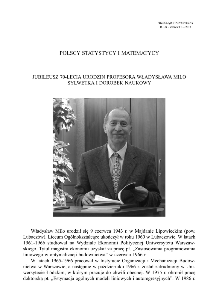 PRZEGLĄD STATYSTYCZNY R. LX – ZESZYT 3 – 2013 POLSCY STATYSTYCY I MATEMATYCY JUBILEUSZ 70-LECIA URODZIN PROFESORA WŁADYSŁAWA MILO SYLWETKA I DOROBEK NAUKOWY Władysław Milo urodził się 9 czerwca 1943 r. w Majdanie Lipowieckim (pow. Lubaczów). Liceum Ogólnokształcące ukończył w roku 1960 w Lubaczowie. W latach 1961-1966 studiował na Wydziale Ekonomii Politycznej Uniwersytetu Warszawskiego. Tytuł magistra ekonomii uzyskał za pracę pt. „Zastosowania programowania liniowego w optymalizacji budownictwa” w czerwcu 1966 r. W latach 1965-1966 pracował w Instytucie Organizacji i Mechanizacji Budownictwa w Warszawie, a następnie w październiku 1966 r. został zatrudniony w Uniwersytecie Łódzkim, w którym pracuje do chwili obecnej. W 1975 r. obronił pracę doktorską pt. „Estymacja ogólnych modeli liniowych i autoregresyjnych”. W 1986 r. 418 Jubileusz 70-lecia urodzin Profesora Władysława Milo obronił rozprawę habilitacyjną pt. „Liniowe modele statystyczne” i otrzymał stopień doktora habilitowanego nauk ekonomicznych. W 1995 r. otrzymał tytuł naukowy profesora oraz stanowisko profesora nadzwyczajnego Uniwersytetu Łódzkiego. W 1998 r. uzyskał stanowisko profesora zwyczajnego, na którym pracuje do dziś. Jest autorem, współautorem oraz redaktorem 14 książek opublikowanych m.in. w wydawnictwach naukowych: PWN, PWE oraz Wydawnictwie Uniwersytetu Łódzkiego. Najważniejsze z nich to: „Nieliniowe modele ekonometryczne”, PWN, Warszawa 1990, „Stabilność i wrażliwość modeli i metod ekonometrycznych”, Wydawnictwo Uniwersytetu Łódzkiego, Łódź 1995, „Stabilność rynków finansowych a wzrost gospodarczy”, Wydawnictwo Uniwersytetu Łódzkiego, Łódź 2002. Jest również autorem lub współautorem ponad 100 artykułów naukowych, rozdziałów monografii, recenzji i not bibliograficznych, opublikowanych m.in. w Palgrave Macmillan, „Publications Econometriques”, „Ekonomiście”, „Przeglądzie Statystycznym”, „Folia Oeconomica” oraz „Wiadomościach Statystycznych”. Przedstawił ponad 100 referatów na konferencjach krajowych i zagranicznych. Zainteresowania naukowe prof. W. Milo początkowo były skoncentrowane na modelach liniowych i autoregresyjnych, którym poświęcił pracę doktorską. Następnie zajmował się analizą szeregów czasowych, a w książce habilitacyjnej własnościami liniowych modeli statystycznych. Po habilitacji badał stabilność, odporność oraz wrażliwość modeli i metod ekonometrycznych. Analizował własności estymacyjno-predykcyjne, zarówno klasycznych jak i nieklasycznych predyktorów, tworzonych na podstawie liniowych i nieliniowych modeli ekonometrycznych. Od połowy lat dziewięćdziesiątych widoczne jest poszerzenie badań o wątki aplikacyjne dotyczące modelowania i prognozowania rynków pracy, rynków finansowych oraz ich powiązań ze wzrostem gospodarczym. Do najciekawszych należą m.in. te wyniki, które weryfikują prognostyczne własności modeli opartych na teorii Smitha, Ricardo, Marshalla i Keynesa. Potwierdził empirycznie, że modele te nie są prognostycznie gorsze od współcześnie występujących w teorii ekonomii. W badaniach uwzględniał procesy transformacji gospodarczej i integracji z Unią Europejską. W swych publikacjach dużo uwagi poświęcił również wyborom optymalnych portfeli inwestycyjnych, prognozowaniu kursów walutowych, stóp procentowych, inflacji oraz wzrostowi gospodarczemu. W ostatnim okresie rozpoczął analizę fundamentalnych zasad wnioskowania, dotyczących przyczynowości i prawdy, a także istoty losowości, chaosu, entropii i ergodyczności w kontekście analiz zjawisk ekonomicznych i finansowych. Profesor Władysław Milo jest promotorem 12 prac doktorskich, autorem 14 recenzji prac w przewodach doktorskich, 6 recenzji w przewodach habilitacyjnych i 10 recenzji w postępowaniach o tytuł profesora. Od 1976 r. kierował tematami badań w problemach resortowych, centralnych, a w latach 90. XX w. projektami KBN oraz był głównym wykonawcą w dwóch projektach ACE (Action for Co-operation in the field of Economics) Komisji Europejskiej w Brukseli. Jubileusz 70-lecia urodzin Profesora Władysława Milo 419 Przebywał na wielu stażach, stypendiach i studiach zagranicznych, m.in. na: –stypendium Fulbrighta, studia podyplomowe w Duke University, USA (1971/1972), – stypendiach British Council, University of Bangor, Liverpool, Cambridge (1983, 1986, 1988), – stypendium DAAD w University of Hagen, Niemcy, 1985. W ramach współpracy zagranicznej przebywał w l’Université Paris 1, 1986, Manchester University, Oxford University, 1990, University of Amsterdam, 1993 i w European University Institute, Florence, 1996. Był lub jest członkiem następujących towarzystw naukowych i organizacji naukowych: American Association for the Advancement of Science, Bernoulli Society, Econometric Society, European Economic Association, Komitetu Statystyki i Ekonometrii PAN, Łódzkiego Towarzystwa Naukowego (był sekretarzem oraz przewodniczącym II Wydziału), New York Academy of Science, Polskiego Towarzystwa Ekonomicznego, Polskiego Towarzystwa Filologicznego oraz Polskiego Towarzystwa Matematycznego. Był redaktorem w dwóch czasopismach: – „Przegląd Statystyczny” (w latach 1987–2001), – „Prace Instytutu Ekonometrii i Statystyki” UŁ. Aktualnie jest Przewodniczącym Rady Redakcyjnej „Przeglądu Statystycznego”. Jest inicjatorem i redaktorem naczelnym serii wydawniczej „Financial Markets. Principles of Modelling, Forecasting and Decision-Making (FindEcon)”. W czasie studiów był członkiem ZSP. W latach 1966–1981 był członkiem ZNP. Od 1981 r. jest członkiem NSZZ „Solidarność”. W latach 1989–1990 był konsultantem Zarządu Regionalnego „Solidarność” w Łodzi. Nie był członkiem żadnej partii politycznej. Za działalność naukowo-dydaktyczną i organizatorską w środowisku akademickim został