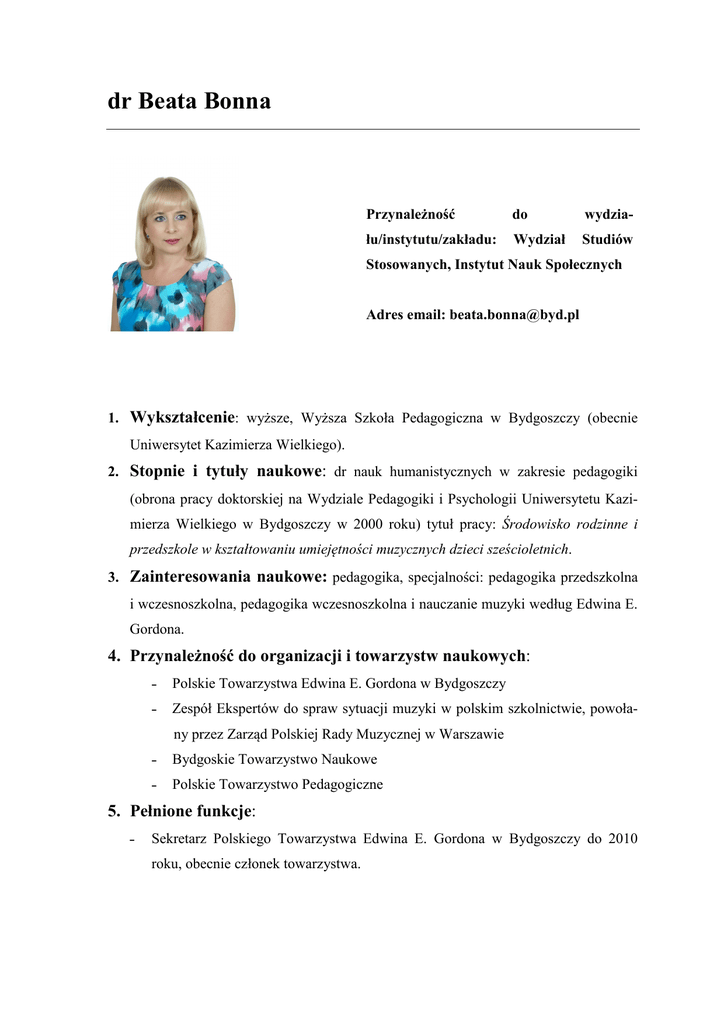 dr Beata Bonna Przynależność do wydzia- łu/instytutu/zakładu: Wydział Studiów Stosowanych, Instytut Nauk Społecznych Adres email: [email protected] 1. Wykształcenie: wyższe, Wyższa Szkoła Pedagogiczna w Bydgoszczy (obecnie Uniwersytet Kazimierza Wielkiego). 2. Stopnie i tytuły naukowe: dr nauk humanistycznych w zakresie pedagogiki (obrona pracy doktorskiej na Wydziale Pedagogiki i Psychologii Uniwersytetu Kazimierza Wielkiego w Bydgoszczy w 2000 roku) tytuł pracy: Środowisko rodzinne i przedszkole w kształtowaniu umiejętności muzycznych dzieci sześcioletnich. 3. Zainteresowania naukowe: pedagogika, specjalności: pedagogika przedszkolna i wczesnoszkolna, pedagogika wczesnoszkolna i nauczanie muzyki według Edwina E. Gordona. 4. Przynależność do organizacji i towarzystw naukowych: ˗ Polskie Towarzystwa Edwina E. Gordona w Bydgoszczy ˗ Zespół Ekspertów do spraw sytuacji muzyki w polskim szkolnictwie, powołany przez Zarząd Polskiej Rady Muzycznej w Warszawie ˗ Bydgoskie Towarzystwo Naukowe ˗ Polskie Towarzystwo Pedagogiczne 5. Pełnione funkcje: ˗ Sekretarz Polskiego Towarzystwa Edwina E. Gordona w Bydgoszczy do 2010 roku, obecnie członek towarzystwa. ˗ od 2012 roku Sekretarz Naukowy Rady Naukowej Bydgoskiego Towarzystwa Naukowego – wydawanego cyklicznie periodyku w ramach Prac Wydziału Nauk Humanistycznych. 6. Kształcenie kadry naukowej: promotor 217 prac, w tym 116 licencjackich oraz 101 magisterskich, głównie na kierunkach: pedagogika przedszkolna i wczesnoszkolna, pedagogika wczesnoszkolna i nauczanie muzyki według E.E. Gordona. 7. Tematyka naukowo-badawcza (prowadzone badania): rozwój muzyczny dzieci w okresie prenatalnym; wczesne okresy rozwoju muzycznego dzieci – poszukiwanie sposobów i metod optymalizujących ten proces; zdolności i kompetencje muzyczne dzieci w wieku przedszkolnym i wczesnoszkolnym; teoria uczenia się muzyki E.E. Gordona i możliwość wielowymiarowego adaptowania jej do polskiego systemu powszechnej edukacji muzycznej; efektywność edukacji muzycznej na różnych poziomach kształcenia; kompetencje muzyczne nauczycieli przedszkola i klas początkowych; środowisko rodzinne w procesie wspierania rozwoju muzycznego niemowląt i małych dzieci. 8. Aktywny udział w międzynarodowych i krajowych konferencjach naukowych: ˗ Ogólnopolskiej Konferencji Naukowej nt: Profil kształcenia nauczycieli muzyki dla potrzeb szkoły ogólnokształcącej (Bydgoszcz 1996). ˗ I Ogólnopolskiej Konferencji naukowo-konsultacyjnej Polskiego Towarzystwa Edwina E. Gordona nt: Sposoby kierowania rozwojem muzycznym dziecka w wieku przedszkolnym i wczesnoszkolnym (Bydgoszcz 1997). ˗ Międzynarodowej Konferencji Naukowej nt: Powszechne wychowanie muzyczne wobec przemian edukacyjnych w Europie (Bydgoszcz 1998). ˗ Ogólnopolskiej Konferencji nt: Powszechna edukacja muzyczna – obowiązek czy szansa? (Mazowieckie Centrum Kultury i Sztuki, AMFC, Fundacja „Muzyka jest dla wszystkich”, Warszawa 21-22. 04. 2006). ˗ II Ogólnopolskiej Konferencji Polskiego Towarzystwa Edwina E. Gordona nt. Rola muzyki w nauczaniu zintegrowanym (Bydgoszcz 2000). ˗ Międzynarodowej Konferencji Naukowej nt: Edukacja artystyczna dzieci i młodzieży (26-27 marzec 2001, Zielona Góra). ˗ III Ogólnopolskiej Konferencji Naukowej Polskiego Towarzystwa Edwina E. Gordona nt: Kreatywność w procesie edukacji (Bydgoszcz 2002). ˗ Ogólnopolskiej Konferencji Naukowej nt: Edukacja – Szkoła – Nauczyciele. Promowanie rozwoju dziecka (Kraków, 16-17 stycznia 2004). ˗ I Ogólnopolskiej Konferencji Naukowej nt. Człowiek u progu trzeciego tysiąclecia: wyzwania i zagrożenia (Elbląg, 11-12 maj 2004). ˗ III Ogólnopolskiej Konferencji z udziałem gości zagranicznych nt. Teoretyczne i praktyczne aspekty edukacji uczniów zdolnych. Kształcenie ucznia zdolnego – konieczność czy wybór? (Toruń, 15-16 październik 2004). ˗ IV Ogólnopolskiej Konferencji Naukowej Polskiego Towarzystwa Edwina E. Gordona nt: Twórcze aspekty edukacji dziecka (Bydgoszcz, 09-10 maj 2005). ˗ Ogólnopolskiej Konferencji Naukowej nt: Zaniedbane i zaniechane obszary edukacji w szkole (Olsztyn 6-8 czerwca 2005). ˗ Ogólnopolskiej Konferencji nt: Psychologia rozwoju muzycznego a kształcenie nauczycieli (AMFC Warszawa, 25-26 listopad 2005). ˗ Ogólnopolskiej Konferencji Naukowej nt: Europejska tradycja wychowania estetycznego wobec liberalizmu kulturowego (Katedra Edukacji Artystycznej, Uniwersytet Łódzki, 18-19 kwietnia 2008). ˗ Międzynarodowej Konferencji Naukowej nt: Edukacja artystyczna jako edukacja kreatywna (Uniwersytet im. Adama Mickiewicza w Poznaniu, Wydział PedagogicznoArtystyczny w Kaliszu, Zakład Edukacji Muzycznej, Kalisz 20-21. 11. 2008). ˗ Ogólnopolskiej Konferencji Naukowej w Bydgoszczy nt: Medyczne, psychologiczne i pedagogiczne uwarunkowania prawidłowego rozwoju dziecka w okresie niemowlęcym i poniemowlęcym na przykładzie zintegrowanych działań bydgoskich żłobków (Sala sesyjna Rady Miasta w Bydgoszczy, 9-10.06.2010). ˗ Ogólnopolskiej Konferencji nt: Słuchanie i tworzenie muzyki jako formy aktywności muzycznej (Uniwersytet Kazimierza Wielkiego w Bydgoszczy, Instytut Edukacji Muzycznej, Zakład Edukacji Muzycznej Szkolnej, Bydgoszcz 05.04. 2011). ˗ Konferencji naukowo – artystycznej nt: Współczesna Edukacja estetyczna. Teoria i praktyka (Uniwersytet Humanistyczno-Przyrodniczy Jana Kochanowskiego w Kielcach, Wydział Pedagogiczny i Artystyczny, Instytut Sztuk Pięknych, Instytut Edukacji Muzycznej, Kielce 17-18. 09. 2010). ˗ Ogólnopolskiej Konferencji Naukowej nt: Wspieranie potencjału dydaktycznego nauczycieli muzyki. Edukacja – wiedza – wykonawstwo – praktyka (Państwowa Wyższa Szkoła Zawodowa w Koninie, Instytut Edukacji Artystycznej, Konin 30.01. 2012). ˗ Ogólnopolskiej Konferencji Naukowej, I Konwencji Pedagogiki Muzyki, nt: Cechy – Aksjologia – Systematyka (Zakład Teoretycznych Podstaw Pedagogiki Muzyki Wydziału Dyrygentury