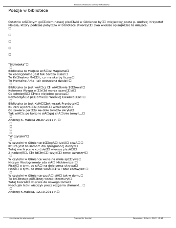 Biblioteka Publiczna Gminy WiÄ…zowna Poezja w bibliotece Ostatnio czÄ™stym goÅ›ciem naszej placÃłwki w Gliniance byÅ‚ miejscowy poeta p. Andrzej Krzysztof Malesa, ktÃłry podczas pobytÃłw w bibliotece stworzyÅ‚ dwa wiersze opisujÄ…ce to miejsce. "Biblioteka" Biblioteka to Miejsce wrÄ™cz Magiczne Tu esencjonalna jest tak bardzo cisza! To KrÃłlestwo MyÅ›li, co ma skarby liczne To Mentalna Arka, tak potrzebna dzisiaj! Biblioteka to jest wrÄ™cz ÅšwiÄ…tynia SÅ‚owa! Kolorowa Wyspa wÅ›rÃłd morza szaroÅ›ci Co odmienić Åźycie niejedno gotowa RozniecajÄ…c pÅ‚omieÅ„ Wielkiej CiekawoÅ›ci! Biblioteka to jest KsiÄ…Åźek wszak Przybytek Ku czci wyobraźni pokoleÅ„ wzniesiony! Co zawiera perÅ‚y na dnie tomÃłw skryte Tak wiÄ™c po kolejne siÄ™gaj chÄ™tnie tomy!... Andrzej K. Malesa 28.07.2011 r. "W czytelni" W czytelni w Gliniance bÅ‚ogÄ… lubiÄ™ ciszÄ™ KtÃłra jest balsamem dla spragnionej duszy! Tutaj me liryczne co dzieÅ„ wiersze piszÄ™ Z nadziejÄ…, Åźe ktÃłryÅ› czyjeÅ› serce wzruszy! W czytelni w Gliniance wena na mnie spÅ‚ywa Niczym Wodogrzmoty zda siÄ™ Mickiewicza! PiszÄ™ o tym, co siÄ™ na dnie serca skrywa PiszÄ™ o tym, co mnie wciÄ…Åź w Tobie zachwyca! W czytelni w Gliniance czujÄ™ siÄ™ jak w domu To krÃłlestwo piÄ™knej wszak literatury! Tutaj tworzÄ™ wiersze do nowego tomu Niech jak letni wietrzyk precz rozgania chmury!... Andrzej K.Malesa, 12.10.2011 r. http://www.bp-wiazowna.pl Powered by Joomla! Generated: 3 March, 2017, 12:42