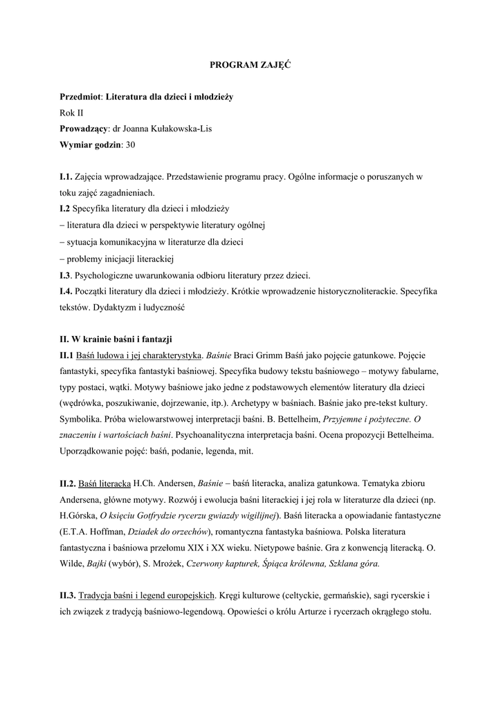 PROGRAM ZAJĘĆ Przedmiot: Literatura dla dzieci i młodzieży Rok II Prowadzący: dr Joanna Kułakowska-Lis Wymiar godzin: 30 I.1. Zajęcia wprowadzające. Przedstawienie programu pracy. Ogólne informacje o poruszanych w toku zajęć zagadnieniach. I.2 Specyfika literatury dla dzieci i młodzieży − literatura dla dzieci w perspektywie literatury ogólnej − sytuacja komunikacyjna w literaturze dla dzieci − problemy inicjacji literackiej I.3. Psychologiczne uwarunkowania odbioru literatury przez dzieci. I.4. Początki literatury dla dzieci i młodzieży. Krótkie wprowadzenie historycznoliterackie. Specyfika tekstów. Dydaktyzm i ludyczność II. W krainie baśni i fantazji II.1 Baśń ludowa i jej charakterystyka. Baśnie Braci Grimm Baśń jako pojęcie gatunkowe. Pojęcie fantastyki, specyfika fantastyki baśniowej. Specyfika budowy tekstu baśniowego – motywy fabularne, typy postaci, wątki. Motywy baśniowe jako jedne z podstawowych elementów literatury dla dzieci (wędrówka, poszukiwanie, dojrzewanie, itp.). Archetypy w baśniach. Baśnie jako pre-tekst kultury. Symbolika. Próba wielowarstwowej interpretacji baśni. B. Bettelheim, Przyjemne i pożyteczne. O znaczeniu i wartościach baśni. Psychoanalityczna interpretacja baśni. Ocena propozycji Bettelheima. Uporządkowanie pojęć: baśń, podanie, legenda, mit. II.2. Baśń literacka H.Ch. Andersen, Baśnie − baśń literacka, analiza gatunkowa. Tematyka zbioru Andersena, główne motywy. Rozwój i ewolucja baśni literackiej i jej rola w literaturze dla dzieci (np. H.Górska, O księciu Gotfrydzie rycerzu gwiazdy wigilijnej). Baśń literacka a opowiadanie fantastyczne (E.T.A. Hoffman, Dziadek do orzechów), romantyczna fantastyka baśniowa. Polska literatura fantastyczna i baśniowa przełomu XIX i XX wieku. Nietypowe baśnie. Gra z konwencją literacką. O. Wilde, Bajki (wybór), S. Mrożek, Czerwony kapturek, Śpiąca królewna, Szklana góra. II.3. Tradycja baśni i legend europejskich. Kręgi kulturowe (celtyckie, germańskie), sagi rycerskie i ich związek z tradycją baśniowo-legendową. Opowieści o królu Arturze i rycerzach okrągłego stołu. A. Sapkowski, Maladie. Świat króla Artura. Baśnie innych narodów: Baśnie z tysiąca i jednaj nocy. Wprowadzenie do literatury fantasy II.4 Fantasy – baśń współczesna. J.R.R. Tolkien, Władca pierścieni, Hobbit fantastyka synkretyczna. D. Terakowska, Córka czarownic i inne wybrane przykłady gatunku. Główne motywy i tematy. II.5 Teksty realistyczno-magiczne w literaturze dla dzieci. Powieść dwuplanu: Opowieści z Narni. Świat wartości w cyklu C.S. Lewisa, wybrane przykłady powieści dwuplanu. M. Ende – Niekończąca się opowieść – fantasy, baśń literacka i powieść dwuplanu we współczesnej literaturze dla dzieci. Światy magiczne L. Carrol, Alicja w krainie czarów. Alicja po drugiej stronie lustra. J. Barrie Piotruś Pan; i inne przykłady w literaturze dla dzieci i młodzieży (wybór). Kreacja baśniowego świata w literaturze dla dzieci. Podsumowanie. Przykłady współczesnej prozy dla młodzieży, zacieranie granic między gatunkami (powieść dwuplanu, magic realism, fantasy, baśń literacka) – analiza wybranych tekstów. II.6 Baśń filozoficzna Antoine de Saint-Exupery, Mały książę. III. Przygoda, podróże i egzotyka III.1 Powieść podróżniczo-przygodowa. Wybrana powieść np. J. Verna, A. Szklarskiego itp. Analiza wątków fabularnych i kreacji bohaterów. III.2 Wątki sensacyjne w literaturze dla dzieci i młodzieży. Wybrana powieść np. Z. Nienackiego. III.3 Przygoda czeka tuż za progiem III.3 Bohater zwierzęcy i świat przyrody w literaturze dla dzieci. J.O. Curwood, Władca skalnej doliny, albo inna pozycja, R. Kipling, Księga dżungli, M. Rodziewiczówna, Lato leśnych ludzi IV. Dziecko wobec trudnych pytań i problemów IV.1 Pytania egzystencjalne, dziecko w zderzeniu ze światem dorosłych A. Lindgren, Bracia Lwie serce, Ronja, córka zbójnika, J. Korczak, Król Maciuś Pierwszy IV.2 Powieść obyczajowa – trudne problemy dorastania Wybrana powieść M. Musierowicz, K. Siesickiej, E. Nowackiej, I. Jurgielewiczowej, F.H. Burnett, Tajemniczy ogród IV.3 Powieść inicjacyjna dla młodzieży: T. Tryzna, Panna nikt, Salinger, Buszujący w zbożu. IV.4. Dziecko w świecie filozofii – J. Gaarder, Świat Zofii V. Najważniejsze motywy literatury dla dzieci i młodzieży VI. Świat dziecka w poezji dla dzieci VII Książka na lekcjach języka polskiego Problematyka czytelnictwa i lektur szkolnych. VIII. Książka a inne media Ekranizacje lektur i literatury dziecięcej.