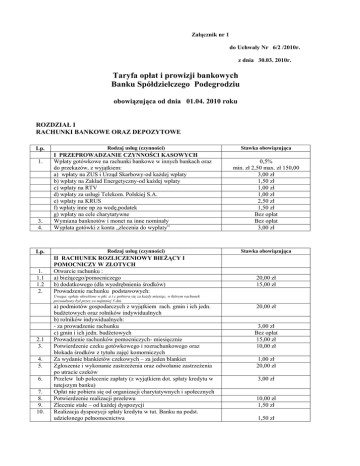 Załącznik nr 1 do Uchwały Nr 6/2 /2010r. z dnia 30.03. 2010r. Taryfa opłat i prowizji bankowych Banku Spółdzielczego Podegrodziu obowiązująca od dnia 01.04. 2010 roku ROZDZIAŁ I RACHUNKI BANKOWE ORAZ DEPOZYTOWE Lp. 1. 3. 4. Lp. 1. 1.1 1.2 2. Rodzaj usług (czynności) I PRZEPROWADZANIE CZYNNOŚCI KASOWYCH Wpłaty gotówkowe na rachunki bankowe w innych bankach oraz do przekazów, z wyjątkiem: a) wpłaty na ZUS i Urząd Skarbowy-od każdej wpłaty b) wpłaty na Zakład Energetyczny-od każdej wpłaty c) wpłaty na RTV d) wpłaty za usługi Telekom. Polskiej S.A. e) wpłaty na KRUS f) wpłaty inne np za wodę,podatek g) wpłaty na cele charytatywne Wymiana banknotów i monet na inne nominały Wypłata gotówki z konta „zlecenia do wypłaty” Rodzaj usług (czynności) II RACHUNEK ROZLICZENIOWY BIEŻĄCY I POMOCNICZY W ZŁOTYCH Otwarcie rachunku : a) bieżącego/pomocniczego b) dodatkowego (dla wyodrębnienia środków) Prowadzenie rachunku podstawowych: Stawka obowiązująca 0,5% min. zł 2,50 max. zł 150,00 3,00 zł 1,50 zł 1,00 zł 1,00 zł 2,50 zł 1,50 zł Bez opłat Bez opłat 3,00 zł Stawka obowiązująca 20,00 zł 15,00 zł Uwaga: opłaty określone w pkt. a i c pobiera się za każdy miesiąc, w którym rachunek prowadzony był przez co najmniej 5 dni. 2.1 3. 4. 5. 6. 7. 8. 9. 10. a) podmiotów gospodarczych z wyjątkiem rach. gmin i ich jedn. budżetowych oraz rolników indywidualnych b) rolników indywidualnych: - za prowadzenie rachunku c) gmin i ich jedn. budżetowych Prowadzenie rachunków pomocniczych- miesięcznie Potwierdzenie czeku gotówkowego i rozrachunkowego oraz blokada środków z tytułu zajęć komorniczych Za wydanie blankietów czekowych – za jeden blankiet Zgłoszenie i wykonanie zastrzeżenia oraz odwołanie zastrzeżenia po utracie czeków Przelew lub polecenie zapłaty (z wyjątkiem dot. spłaty kredytu w tutejszym banku) Opłat nie pobiera się od organizacji charytatywnych i społecznych Potwierdzenie realizacji przelewu Zlecenie stałe – od każdej dyspozycji Realizacja dyspozycji spłaty kredytu w tut. Banku na podst. udzielonego pełnomocnictwa 20,00 zł 3,00 zł Bez opłat 15,00 zł 10,00 zł 1,00 zł 20,00 zł 3,00 zł 10,00 zł 1,50 zł 1,50 zł 11. 11.1. 11.2. 11.3 11.4 11.5 12. 12.1 12.2 System bankowości internetowej: Aktywacja usługi bankowości internetowej Korzystanie z systemu bankowości internetowej- miesięcznie Realizacja przelewu Wydanie listy haseł jednorazowych Zablokowanie/odblokowanie dostępu do rachunku Udzielenie informacji o wysokości salda na rachunku Telefoniczne na hasło przekazywane w formie komunikatu SMS – opłata za każdy wysłany SMS 10,00 zł. Bez opłat 1,00 zł. 5,00 zł. 5,00 zł. 5,00 zł 0,30 zł Uwaga: opłatę pobiera się od każdego rachunku, do którego aktywowana jest usługa. 13. 14. 15. 15.1 16. 17. 18. 19. 20. 21. 22. 23. 24. Lp. 1. 2. 3. 4. Lp. 1. 2. Za sporządzenie: Odpisu obrotów na jednym rachunku w roku bieżącym a) odpisu wyciągu bankowego b) jednego dowodu do wyciągu Uwaga: Za każdy poprzedni rok opłatę podwyższa się o 50 % stawki podstawowej Przyjęcie listy inkasowej Realizacja tytułu wykonawczego oraz dokumentu mającego moc takiego dokumentu (opłatę pobiera się z rach. bankowego dłużnika) Za administrowanie tytułu wykonawczego oraz dokumentu mającego moc takiego dokumentu (opłatę pobiera się z rachunku bankowego dłużnika) Wydanie zaświadczenia o posiadaniu i numerze rachunku bankowego Poświadczenie zgodności dokumentu z oryginałem w czasie trwania umowy rachunku Zmiana Karty wzorów podpisów Karty bankowe Visa Business Electron Przyjęcie lub odwołanie zastrzeżenia dokumentu tożsamości Przelewy bankowe i wypłaty z bieżących wpływów Wydanie na wniosek posiadacza rachunku opinii i zaświadczeń bankowych Wypłaty gotówkowe z rachunków bieżących ( z wyjątkiem rolników) Za usługi nietypowe w zależności od złożoności czynności Rodzaj usług (czynności) III. FUNKCJONOWANIE SYSTEMU HomeNet Opłata za klucze Opłata za instalację Abonament za korzystanie z systemu – opłata miesięczna pobierana po 2 m-cach funkcjonowania Za przyjęcie jednego przelewu (nie dotyczy podmiotów z którymi zawarto indywidualne umowy o prowadzenie r-ku) IV. KORZYSTANIE Z WRZUTNI Wydanie klucza do wrzutni Za każda wpłatę prowizja w wysokości 10,00 zł. 5,00 zł 3,00 zł 10,00 zł 0,5% kwoty zajętej min. 15,00 zł max. 100,00 zł 40,00 zł. 10,00 zł 3,00 zł 10,00 zł zgodnie z załącznikiem nr 1 i 2 do niniejszej taryfy 10,00 zł. 5.00 zł 20,00 zł 5,00 zł 10,00 - 20,00 zł Stawka obowiązująca według ceny zakupu 200.00 zł. 50,00 zł 1,50 zł 10,00 zł 5,00 zł Lp. 1. 2. Rodzaj usług (czynności) IV RACHUNEK OSZCZĘDNOŚCIOWOROZLICZENIOWY Otwarcie rachunku Prowadzenie rachunku – miesięcznie Stawka obowiązująca ROR 10,00 zł. 3,00 zł ROR dla młodz. uczącej się Bez opłat bez opłat Uwaga: opłatę pobiera się za miesiąc, w którym rachunek prowadzony był przez co najmniej 5 dni 3. 4. 4.1. 5. 5.1. 5.2. 5.3. 5.4. 6. 6.1 7. 7.1. Wpłata gotówki na rachunek Wypłata gotówki z rachunku w placówce BS: sporządzenie zastępczego dowodu wypłaty (zamiast czeku) Przelew na rachunek: w placówkach własnych w innych bankach, z wyjątkiem ZUS ZUS w systemie bankowości elektronicznej (e-banknet) Zlecenie stałe na rachunek: a) w placówkach własnych b) w innych bankach Realizacja dyspozycji spłaty kredytu w tutejszym banku na podstawie udzielonego pełnomocnictwa i stałego zlecenia Polecenie zapłaty: realizacja z rachunku dłużnika bez opłat bez opłat bez opłat 1,50 zł 1,50 zł 3,00 zł 1,00 zł bez opłat 1,50 zł 1,50 zł 1,50 zł bez opłat uwaga: opłata pobierana z rachunku dłużnika 8. 8.1. 8.2. 8.3. 8.4 9. 9.1. 9.2. 9.3. 10. 10.1. 10.2. System bankowości Internetowej. aktywacja usługi Bankowości Internetowej korzystanie z Systemu Bankowości Internetowej - miesięcznie wydanie listy haseł jednorazowych Zablokow