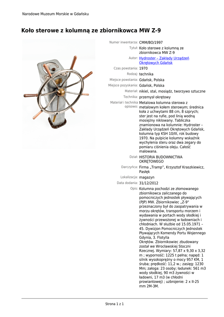 Narodowe Muzeum Morskie w Gdańsku Koło sterowe z kolumną ze zbiornikowca MW Z-9 Numer inwentarza: CMM/BO/1997 Tytuł: Koło sterowe z kolumną ze zbiornikowca MW Z-9 Autor: Hydroster – Zakłady Urządzeń Okrętowych Gdańsk Czas powstania: 1970 Rodzaj: technika Miejsce powstania: Gdańsk, Polska Miejsce pozyskania: Gdańsk, Polska Materiał: nikiel, stal, mosiądz, tworzywo sztuczne Technika: przemysł okrętowy Materiał i technika Metalowa kolumna sterowa z opisowo: metalowym kołem sterowym; średnica koła z uchwytami 88 cm, 8 szprych; ster jest na rufie, pod linią wodną mosiężny niklowany. Tabliczka znamionowa na kolumnie: Hydroster – Zakłady Urządzeń Okrętowych Gdańsk, kolumna typ KSH 10/III, rok budowy 1970. Na pulpicie kolumny wskaźnik wychylenia steru oraz dwa zegary do pomiaru ciśnienia oleju. Całość malowana. Dział: HISTORIA BUDOWNICTWA OKRĘTOWEGO Darczyńca: Firma „Tramp”, Krzysztof Kraszkiewicz, Pasłęk Lokalizacja: magazyn Data dodania: 31/12/2012 Opis: Kolumna pochodzi ze złomowanego zbiornikowca zaliczanego do pomocniczych jednostek pływających (PJP) MW. Zbiornikowiec „Z-9" przeznaczony był do zaopatrywania w morzu okrętów, transportu morzem i wydawania w portach wody słodkiej i żywności przewożonej w ładowniach i chłodniach. W służbie od 15.05.1971 – 45. Dywizjon Pomocniczych Jednostek Pływających Komendy Portu Wojennego Gdynia, 3. Flotylla Okrętów. Zbiornikowiec zbudowany został we Wrocławskiej Stoczni Rzecznej. Wymiary: 57,87 x 9,30 x 3,32 m ; wyporność: 1225 t pełna; napęd: 1 silnik wysokoprężny o mocy 957 KM, 1 śruba; prędkość: 11,2 w.; zasięg: 1230 Mm; załoga: 23 osoby; ładunek: 561 m3 wody słodkiej, 90 m3 żywności w ładowni, 17 m3 (w chłodni prowiantowej) ; uzbrojenie: 2 x II-25 mm 2M-3M. Strona 1 z 1