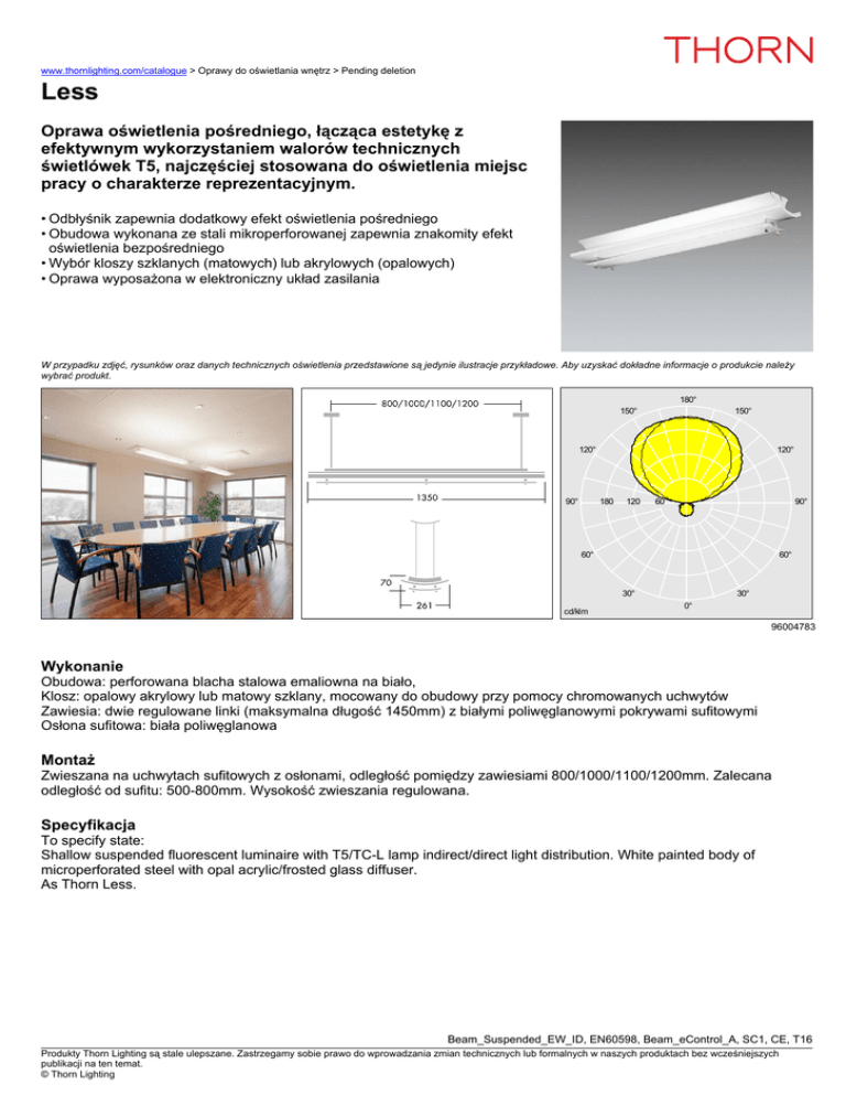 www.thornlighting.com/catalogue > Oprawy do oświetlania wnętrz > Pending deletion Less Oprawa oświetlenia pośredniego, łącząca estetykę z efektywnym wykorzystaniem walorów technicznych świetlówek T5, najczęściej stosowana do oświetlenia miejsc pracy o charakterze reprezentacyjnym. • Odbłyśnik zapewnia dodatkowy efekt oświetlenia pośredniego • Obudowa wykonana ze stali mikroperforowanej zapewnia znakomity efekt oświetlenia bezpośredniego • Wybór kloszy szklanych (matowych) lub akrylowych (opalowych) • Oprawa wyposażona w elektroniczny układ zasilania W przypadku zdjęć, rysunków oraz danych technicznych oświetlenia przedstawione są jedynie ilustracje przykładowe. Aby uzyskać dokładne informacje o produkcie należy wybrać produkt. 180° 150° 150° 120° 90° 120° 180 120 60 90° 60° 60° 30° cd/klm 30° 0° 96004783 Wykonanie Obudowa: perforowana blacha stalowa emaliowna na biało, Klosz: opalowy akrylowy lub matowy szklany, mocowany do obudowy przy pomocy chromowanych uchwytów Zawiesia: dwie regulowane linki (maksymalna długość 1450mm) z białymi poliwęglanowymi pokrywami sufitowymi Osłona sufitowa: biała poliwęglanowa Montaż Zwieszana na uchwytach sufitowych z osłonami, odległość pomiędzy zawiesiami 800/1000/1100/1200mm. Zalecana odległość od sufitu: 500-800mm. Wysokość zwieszania regulowana. Specyfikacja To specify state: Shallow suspended fluorescent luminaire with T5/TC-L lamp indirect/direct light distribution. White painted body of microperforated steel with opal acrylic/frosted glass diffuser. As Thorn Less. Beam_Suspended_EW_ID, EN60598, Beam_eControl_A, SC1, CE, T16 Produkty Thorn Lighting są stale ulepszane. Zastrzegamy sobie prawo do wprowadzania zmian technicznych lub formalnych w naszych produktach bez wcześniejszych publikacji na ten temat. © Thorn Lighting