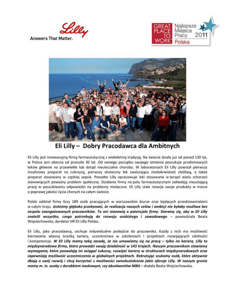 Eli Lilly – Dobry Pracodawca dla Ambitnych Eli Lilly jest innowacyjną firmą farmaceutyczną z wieloletnią tradycją. Na świecie działa już od ponad 130 lat, w Polsce jest obecna od przeszło 30 lat. Od samego początku swojego istnienia poszukuje przełomowych leków głównie na przewlekłe lub dotąd nieuleczalne choroby. W laboratoriach Eli Lilly powstał pierwszy insulinowy preparat na cukrzycę, pierwszy skuteczny lek zwalczający niedokrwistośd złośliwą, a także preparat stosowany w ciężkiej sepsie. Ponadto Lilly opracowuje leki stosowane w terapii wielu schorzeo stanowiących poważny problem społeczny. Działania firmy na polu farmaceutycznym zakładają nieustającą pracę w poszukiwaniu odpowiedzi na problemy medyczne. Eli Lilly stale rozwija swoje produkty w trosce o poprawę jakości życia chorych na całym świecie. Polski oddział firmy liczy 189 osób pracujących w warszawskim biurze oraz będących przedstawicielami w całym kraju. Jesteśmy głęboko przekonani, że realizacja naszych celów i ambicji nie byłaby możliwa bez zespołu zaangażowanych pracowników. To oni stanowią o potencjale firmy. Staramy się, aby w Eli Lilly znaleźli wszystko, czego potrzebują do rozwoju osobistego i zawodowego – powiedziała Beata Wojciechowska, dyrektor HR Eli Lilly Polska. Eli Lilly, jako pracodawcę, cechuje indywidualne podejście do pracownika. Każdy z nich ma możliwośd kierowania własną ścieżką kariery, uczestnictwa w szkoleniach i projektach rozwijających zdolności i kompetencje. W Eli Lilly mamy taką zasadę, że nie umawiamy się na pracę – tylko na karierę. Lilly to międzynarodowa firma, która prowadzi swoją działalnośd w 143 krajach. Naszym pracownikom stawiamy wymagania, które pozwalają im osiągad sukcesy, rozwijad karierę w strukturach międzynarodowych oraz zapewniają możliwośd uczestniczenia w globalnych projektach. Rekrutując szukamy osób, które aktywnie dbają o swój rozwój i chcą korzystad z możliwości samokształcenia jakie oferuje Lilly. W naszym gronie mamy m. in. osoby z dorobkiem naukowym, czy absolwentów MBA – dodała Beata Wojciechowska. Firma kładzie ogromny nacisk również na stworzenie dobrego środowiska pracy. Osoby zatrudnione w koncernie wysoko oceniają panującą tam atmosferę. Bardzo miło wspominam mój pierwszy dzieo w pracy. Początkowy stres szybko minął, kiedy okazało się, że współpracownicy są niezwykle życzliwi i chętni do pomocy – powiedziała Magdalena Raczyoska z działu medycznego. Jasno określone zasady etyczne sprawiają, że czuję się dumna pracując dla Eli Lilly. Ponadto w Eli Lilly panuje miła i koleżeoska atmosfera, co jest dla mnie niezwykle ważne – podkreśliła Aldona Kłobska, pracująca w Lilly Polska od 10 lat, obecnie w dziale szkoleo. Eli Lilly bardzo poważnie podchodzi do respektowania zasady równych szans. O awansie decyduje wiedza, doświadczenie, umiejętności oraz zaangażowanie pracownika. Na tle innych firm Eli Lilly wyróżnia się pod względem dużej liczby kobiet zajmujących stanowiska menedżerskie oraz zasiadających w zarządzie. Kilkakrotnie została wyróżniona, jako pracodawca prowadzący politykę przyjazną kobietom w ciąży i młodym matkom. Badania przeprowadzone w ostatnim czasie przez Great Place to Work® Institute Polska jednoznacznie wykazały, że osoby zatrudnione w Eli Lilly są zadowolone ze swojego miejsca pracy. Doceniają one przede wszystkim wysokie standardy etyczne, w oparciu o które firma prowadzi swoją działalnośd. Pracownicy Lilly są niezwykle zadowoleni również ze swoich kontaktów z przełożonymi. Znaczna większośd ankietowanych bardzo pozytywnie wypowiedziała się na temat obiektywizmu cechującego ocenę pracowników. Niemal jednomyślnie przyznali, że na ich traktowanie nie wpływają takie czynniki, jak płed, wiek, niepełnosprawnośd czy orientacja seksualna. Ponad 80% pracowników Eli Lilly, którzy brali udział w badaniu uznało, że z dumą mówią innym ludziom, gdzie pracują. Ponadto większośd poleciłaby pracę w Eli Lilly znajomej osobie poszukującej pracy. Eli Lilly jest także firmą otwartą na młodych ludzi, którzy stoją na progu kariery. Szansą dla absolwentów szkół wyższych na zatrudnienie w tym koncernie jest udział w programie stażowym „Krok do Kariery”. Firma zdecydowała się na przystąpienie do projektu, aby pomóc młodym, zdolnym ludziom w zdobyciu ciekawego doświadczenia, a także pozwolid im na sprawdzenie w praktyce swojej wiedzy i umiejętności. Osoby z dużym potencjałem, które sprawdzą się w czasie stażu, są otwarte na zmiany i nowe zadania oraz chcą pracowad w branży farmaceutycznej mogą liczyd na rozwijanie swojej kariery w Eli Lilly. Dobre Praktyki DIALOG Z PRACOWNIKAMI Badania opinii pracowników i grupy fokusowe W Eli Lilly przeprowadzamy regularne badania opinii pracowników. Są one cennym źródłem informacji na temat tego, co się dzieje firmie, jak czują się nasi pracownicy, co uważają za mocne strony firmy, a gdzie znajdują obszary do poprawy. Badania dają pracownikom poczucie wpływu na kształtowanie swojego miejsca pracy. Pracownicy Lilly Polska biorą udział w dwóch rodzajach badao: - Globalne badania korporacyjne do których zapraszani są pracownicy z różnych krajów. Badania te są prowadzone zazwyczaj w odstępach kwartalnych lub półrocznych. - Lokalne badania, wykonywane zazwyczaj raz w roku. W analizie wyników koncentrujemy się na takich kwestiach jak: - silne strony (co jest oceniane najlepiej przez pracowników) - obszary do rozwoju (słabsze oceny) - ustalenie, jakie zagadnienia najsilniej wpływają na zaangażowanie pracowników (ustalenie korelacji) Jako follow-up po każdym badaniu podejmujemy następujące kroki: 1. Przede wszystkim informujemy pracowników co zostało zrobione po ostatnim badaniu. To bardzo ważny aspekt każdego badania. Dzięki niemu pracownicy mają poczuc