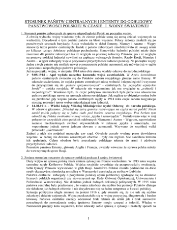 STOSUNEK PAŃSTW CENTRALNYCH I ENTENTY DO ODBUDOWY PAŃSTWOWOŚCI POLSKIEJ W CZASIE I WOJNY ŚWIATOWEJ 1. Stosunek państw zaborczych do sprawy niepodległości Polski na początku wojny. Z chwilą wybuchu wojny wiadomo było, że ziemie polskie staną się areną działań wojennych na wschodzie. Decydował o tym podział państw na bloki wojenne. Polscy zaborcy znaleźli się po przeciwnych stronach barykady: Rosja wchodziła w skład Ententy, Niemcy i Austro – Węgry stanowiły trzon państw centralnych. Każde z państw zaborczych zmobilizowało do swojej armii po kilkaset tysięcy żołnierzy polskiego pochodzenia. Stanowisko ludności polskiej miało duże znaczenie dla państw zaborczych tak ze względu na postawę żołnierzy Polaków, jak i ze względu na postawę polskiej ludności cywilnej na zapleczu walczących frontów. Rządy Rosji, Niemiec i Austro – Węgier zabiegały więc o pozyskanie przychylności ludności polskiej. Na początku wojny żadne z tych państw nie myślało nawet o poszerzeniu polskiej autonomii, nie mówiąc już w ogóle o powstaniu niepodległego państwa polskiego. Już na początku wojny, w sierpniu 1914 roku obie strony wydały odezwy do narodu polskiego 9.08.1914 – Apel wydała naczelna komenda wojsk austriackich. W Apelu dowództwo państw centralnych zwracało się do Polaków zaboru rosyjskiego głosząc same frazesy. W odezwie stwierdzano, że wojska państw centralnych niosą wolność i niepodległość i wzywano do przyłączenia się do „państw sprzymierzonych” – centralnych, by „wypędzić azjatyckie hordy” – wojska rosyjskie. W odezwie nie wspomniano jak ma wyglądać ta „wolność i niepodległość”. Wiadomo było, że część polityków niemieckich była przeciwna utworzeniu państwa polskiego nawet na terenach zaboru rosyjskiego. Jak mgliste to obietnice można było się przekonać gdy wojska państw centralnych zajęły w 1914 roku część zaboru rosyjskiego stosując represje i terror wobec mieszkającej tam ludności. 14.08.1914 – Wielki książę Mikołaj Mikołajewicz wydał Odezwę do narodu polskiego. W odezwie głoszono: „Niechaj się zatrą granice rozrywające na części naród polski! Niech naród polski połączy się w jedno ciało pod berłem cesarza rosyjskiego! Pod berłem tym odrodzi się Polska swobodna w swej wierze, języku i samorządzie”. Postulowano więc w niej połączenie wszystkich ziem polskich odebranych Niemcom i Austro – Węgrom, zapowiadano nadanie nieokreślonych swobód obywatelskich w zakresie języka i samorządu, nie wspominano jednak nawet jednym słowem o autonomii. Wzywano do wspólnej walki przeciwko „Germanom” Żadnej z nich nie podpisał monarcha czy rząd. Obydwie zostały wydane przez dowództwa wojenne. W żadnej nie dawano konkretnych obietnic – były one mgliste. Nie określano terminu ich spełnienia. Celem obydwu było pozyskanie polskiego rekruta do armii i zdobycie przychylności ludności. Pozostałe państwa Ententy, głównie Anglia i Francja, uważały wówczas że sprawa polska należy do wewnętrznych spraw Rosji. 2. Zmiana stosunku mocarstw do sprawy polskiej podczas I wojny światowej Duży wpływ na sprawę polską miała zmiana sytuacji na froncie wschodnim. W 1915 roku wojska centralne zajęły Królestwo Polskie. Wojska rosyjskie wycofując się przeprowadziły ewakuację. Setki tysięcy Polaków wywieziono w głąb Rosji. Królestwo Polskie zostało podzielone na dwie strefy okupacyjne: niemiecką ze stolicą w Warszawie i austriacką ze stolicą w Lublinie. Państwa centralne zabiegały o pozyskanie polskiej opinii publicznej zgadzając się na działanie licznych polskich organizacji czy stowarzyszeń np. Rady Głównej Opiekuńczej, Uniwersytetu i Politechniki Warszawskiej. Nie składano jednak żadnych deklaracji politycznych. W 1915 roku państwa centralne były przekonane , że wojna zakończy się szybko bez pomocy Polaków dlatego nie składano już żadnych obietnic i nie decydowano się na żadne ustępstwa w kwestii polskiej. Sytuacja polityczna uległa zmianie na jesieni 1916 r. gdy okazało się, że nie uda się szybko zakończyć działań wojennych. Wojna przekształciła się w wojnę pozycyjną, długotrwałą i bardzo krwawą. Państwa centralne zaczęły odczuwać brak rekruta do armii jak i brak surowców potrzebnych do prowadzenia wojny (państwa Ententy mogły czerpać z kolonii). Władzę w Niemczech przejęły koła wojskowe, które zdawały sobie sprawę z sytuacji i znalazły sposób na 1 rozwiązanie braku uzupełnień. Na ziemiach Królestwa Polskiego znajdowało się wielu mężczyzn zdolnych do służby wojskowej, których nie można było wezwać pod broń gdyż byli obywatelami Rosji. Wobec braku konkretnych działań na rzecz sprawy polskiej Polacy nie chcieli wstępować do armii państw centralnych jako ochotnicy. W tych okolicznościach ogłoszono Akt 5 listopada 1916 r. Najpierw 4.11.1916 cesarz Franciszek Józef zapowiedział nadanie odrębności Galicji w ramach monarchii austro – węgierskiej. Dzień później 5.11.1916 roku ogłoszono Akt 5 Listopada 1916 r.. Cesarze Niemiec i Austro – Węgier proklamowali w nim powstanie Królestwa Polskiego z ziem zaboru rosyjskiego. Nie określono jego granic, miały zostać sprecyzowane w terminie późniejszym. Państwo polskie miało być monarchią konstytucyjną, w której władza monarsza była by dziedziczna. Akt nie precyzował terminu i organizacji władz polskich. Powoływał jednak Polskie Siły Zbrojne, które miały współdziałać z armią niemiecką. Już trzy dni później wydano odezwę, w której wzywano Polaków do wstępowania do polskiej armii. Mimo prawdziwych intencji znaczenie Aktu było olbrzymie. Po raz pierwszy państwa zaborcze zapowiedziały powstanie pastwa polskiego. Nawet jeżeli miał to być twór enigmatyczny i mglisty sprawa odzyskania niepodległości przez Polskę nabrała innego wymiaru. Została umiędzynar