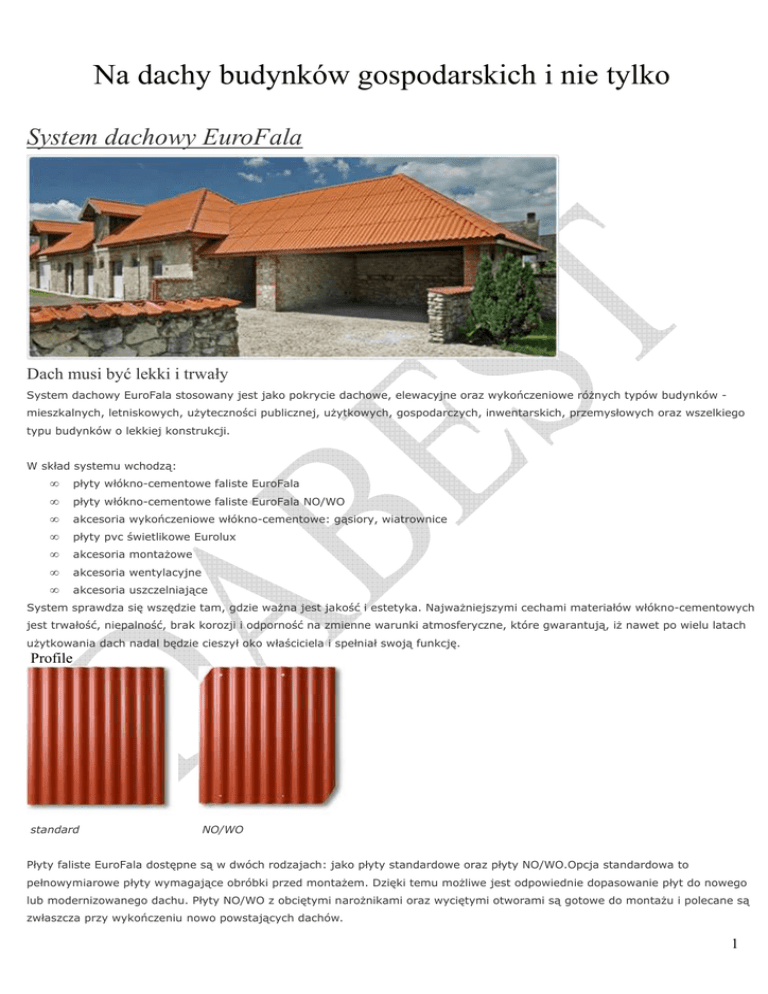 Na dachy budynków gospodarskich i nie tylko System dachowy EuroFala Dach musi być lekki i trwały System dachowy EuroFala stosowany jest jako pokrycie dachowe, elewacyjne oraz wykończeniowe różnych typów budynków mieszkalnych, letniskowych, użyteczności publicznej, użytkowych, gospodarczych, inwentarskich, przemysłowych oraz wszelkiego typu budynków o lekkiej konstrukcji. W skład systemu wchodzą: • płyty włókno-cementowe faliste EuroFala • płyty włókno-cementowe faliste EuroFala NO/WO • akcesoria wykończeniowe włókno-cementowe: gąsiory, wiatrownice • płyty pvc świetlikowe Eurolux • akcesoria montażowe • akcesoria wentylacyjne • akcesoria uszczelniające System sprawdza się wszędzie tam, gdzie ważna jest jakość i estetyka. Najważniejszymi cechami materiałów włókno-cementowych jest trwałość, niepalność, brak korozji i odporność na zmienne warunki atmosferyczne, które gwarantują, iż nawet po wielu latach użytkowania dach nadal będzie cieszył oko właściciela i spełniał swoją funkcję. Profile standard NO/WO Płyty faliste EuroFala dostępne są w dwóch rodzajach: jako płyty standardowe oraz płyty NO/WO.Opcja standardowa to pełnowymiarowe płyty wymagające obróbki przed montażem. Dzięki temu możliwe jest odpowiednie dopasowanie płyt do nowego lub modernizowanego dachu. Płyty NO/WO z obciętymi narożnikami oraz wyciętymi otworami są gotowe do montażu i polecane są zwłaszcza przy wykończeniu nowo powstających dachów. 1 Dostępne kolory Szary Czarny Czerwono Brązowy brązowy Grafitowy Niebieski Czerwony Ceglasty Zielony Naturalny szary cementowy Dane techniczne płyt EuroFala Grubość Waga Waga mm kg/m2 płyty kg 625 x 1150 6 ok. 11,7 1250 x 1150 6 1875 x 1150 2500 x 1150 Wymiary Profil mm standard PowierzchniaPowierzchnia płyty m2 efkt. m2 ok. 8,5 0,72 0,49 ok. 11,7 ok. 16,9 1,44 1,14 6 ok. 11,7 ok. 25,3 2,16 1,79 6 ok. 11,7 ok. 33,7 2,44 2,44 standard NO/WO standard NO/WO standard NO/WO UWAGA ! Na stanie magazynowym cały czas występuje Eurofala w kolorze naturalnym szarym (cementowym) o wymiarach 1,25mx1,15m IK 4142 2 Płyta Guttanit W – płyta bitumiczna na dach i ścianę o największej powierzchni krycia. Produkt ekonomiczny i ekologiczny. Technologia wielowarstwowa, niewielki ciężar, maksymalna stabilność. Zalety • • • • • • • Zastosowanie ekonomiczność wysoka wydajność układania trwałość i łatwy montaż brak konieczności konserwacji naturalne kolory produkt nadający się do wtórnej przeróbki brak zawartości azbestu • • • pokrycia dachowe powierzchnie ścian renowacja istniejących dachów Bitumiczne płyty faliste guttanit to jedno z najbardziej opłacalnych rozwiązań, stosowane od dziesięcioleci na całym świecie do pokryć dachowych i okładzin elewacyjnych. Układane miliony razy płyty guttanit w znaczący sposób potwierdzają trwałość tego produktu we wszystkich warunkach klimatycznych. Także w tropikalnych i arktycznych szerokościach klimatycznych. Dojrzała z technicznego punktu widzenia płyta warstwowa, o małej wysokości fali, jest bardzo elastyczna i odporna na działanie czynników zewnętrznych jak np. atmosfery środowiska przemysłowego, ługów, kwasów, wysokich i niskich temperatur. Podłużne ułożenie większości włókien powoduje wysoką elastyczność materiału, przy pokryciach dopuszczalne są promienie krzywizn od wartości 8m. Nadzwyczajna jest wytrzymałość, maksymalne dopuszczalne obciążenie wynosi 650 kg/m2 i leży znacznie powyżej wartości wymaganych przez odpowiednie przepisy. Wynika to z opatentowanej technologii wielowarstwowej i małej wysokości fali. Jedyną w swoim rodzaju zaletą jest oszczędność 4% materiału, związana z niewielkimi stratami wynikającymi z wielkości zakładów a wynikająca z charakterystycznej, niewielkiej wysokości fali 76 / 30 mmi formatu płyty. Główne zakresy stosowania: Uprzemysłowione budownictwo hal magazynowych i przemysłowych, obiekty użytkowe i funkcjonalne w dziedzinach: przemysłu, usług, rolnictwa, budowy altan i letnich domków. Wysoka trwałość Bitumiczne płyty faliste guttanit charakteryzują się trwałością, przekraczającą wymagania normatywne. Opatentowana technologia wielowarstwowa (laminowanie) i charakterystyczne, niewielkie fale (14 lub 12 fal / arkusz) umożliwiają znaczne wielkości obciążeń statystycznych. Płyty są odporne na działanie wysokich i niskich temperatur. Niewielki ciężar Niewielki ciężar płyt umożliwia stosowanie lekkich konstrukcji nośnych. Elastyczność 3 Najwyższa elastyczność płyt guttanit pozwala na dopasowanie ich do wygiętych konstrukcji nośnych (bez zwichrowania). Bez trudności można pokrywać nimi zaokrąglenia o promieniu 8m. Płyty guttanit są idealnym rozwiązaniem w przypadku prac renowacyjnych. Wysoka jakość Wysoka jakość jest podstawą powszechnego stosowania bitumicznych płyt falistych guttanit - obowiązuje okres 15 lat gwarancji, dotyczący wodoszczelności płyt (wyłączywszy skutek wystąpienia siły wyższej, spowodowany czynnikami atmosferycznymi lub mechanicznymi) guttanit W Długość 2000 mm Szerokość 910 mm Pow. krycia brutto 1,82 m2 Pow. krycia netto 1,56 m2 Szerokość fali 76 mm Wysokość fali 30 mm Ilość fal 12 Klasa ogniowa B2 Powierzchnia strukturalna Ciężar 5,0 kg/płyta, 2,75 kg/m2 Opakowanie zbiorcze paleta = 150szt. ciężar brutto = 750 kg Produkowane kolory: czarny zielony czerwony brąz 4 DODATKI DO MONTAŻU Gwóźdź guttanit S z płaską, odporną na działanie czynników atmosferycznych uszczelką i ocynkowanym ogniowo trzpieniem ma nadzwyczaj wysoką wytrzymałość na wyciąganie. Dostępne 4 kolory. Gąsior ze wzmocnieniem krawędzi stalową blachą ocynkowaną. Dostępne 4 kolory. Długość 1000 mm Długość krycia 9000 mm Długość ramienia 150 mm Szerokość 450 mm Uszczelka do płyt guttanit Długość: 1000 mm Szerokość: 20 mm Profil 