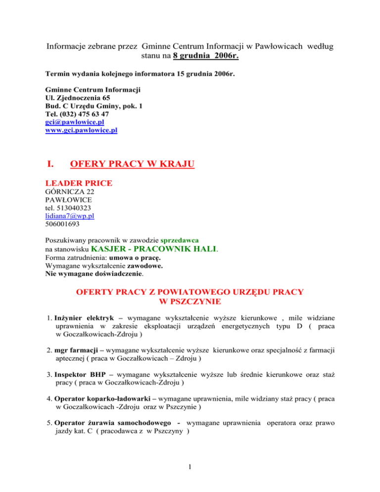 Informacje zebrane przez Gminne Centrum Informacji w Pawłowicach według stanu na 8 grudnia 2006r. Termin wydania kolejnego informatora 15 grudnia 2006r. Gminne Centrum Informacji Ul. Zjednoczenia 65 Bud. C Urzędu Gminy, pok. 1 Tel. (032) 475 63 47 [email protected] www.gci.pawlowice.pl I. OFERY PRACY W KRAJU LEADER PRICE GÓRNICZA 22 PAWŁOWICE tel. 513040323 [email protected] 506001693 Poszukiwany pracownik w zawodzie sprzedawca na stanowisku KASJER - PRACOWNIK HALI. Forma zatrudnienia: umowa o pracę. Wymagane wykształcenie zawodowe. Nie wymagane doświadczenie. OFERTY PRACY Z POWIATOWEGO URZĘDU PRACY W PSZCZYNIE 1. InŜynier elektryk – wymagane wykształcenie wyŜsze kierunkowe , mile widziane uprawnienia w zakresie eksploatacji urządzeń energetycznych typu D ( praca w Goczałkowicach-Zdroju ) 2. mgr farmacji – wymagane wykształcenie wyŜsze kierunkowe oraz specjalność z farmacji aptecznej ( praca w Goczałkowicach – Zdroju ) 3. Inspektor BHP – wymagane wykształcenie wyŜsze lub średnie kierunkowe oraz staŜ pracy ( praca w Goczałkowicach-Zdroju ) 4. Operator koparko-ładowarki – wymagane uprawnienia, mile widziany staŜ pracy ( praca w Goczałkowicach -Zdroju oraz w Pszczynie ) 5. Operator Ŝurawia samochodowego - wymagane uprawnienia operatora oraz prawo jazdy kat. C ( pracodawca z w Pszczyny ) 1 6. Kierowca z kat. prawa jazdy C+E + uprawnienia ADR ( pracodawca z Pszczyny ) wymagany staŜ pracy Powiatowy Urząd Pracy w Pszczynie 43-200 Pszczyna Ul. 3Maja 10 Tel. /fax. 032/2104720 --------------------------------------------------------------------------------------------------------- OFERTY PRACY Z POWIATOWEGO URZEDU PRACY W JASTRZEBIU ZDROJU 1. windykator naleŜności – wykształcenie średnie, doświadczenie w kontaktach z klientem, prawo jazdy kat. „B”, obsługa komputera 2. inŜynier budownictwa/ochrony środowiska – wykształcenie wyŜsze budowlane, prawo jazdy kat „B” 3. przedstawiciel handlowy – wykształcenie średnie, mile widziane doświadczenie, prawo jazdy kat. „B” 4. prelegent reklamowy – wykształcenie średnie, prawo jazdy kat. „B”, chęć do pracy, komunikatywność 5. doradca handlowy - wykształcenie średnie, prawo jazdy kat. „B”, chęć do pracy, komunikatywność 6. krawcowa – wykształcenie zasadnicze zawodowe, mile widziane doświadczenie 7. fryzjer damsko-męski – mile widziany staŜ pracy 8. asystent projektanta – wykształcenie wyŜsze – inŜynier budownictwa, znajomość, AutoCad prawo jazdy kat. „B” 9. fryzjer – doświadczenie 10. nauczyciel geografii – wykształcenie wyŜsze, przygotowanie pedagogiczne 11. operator dźwigu samojezdnego – 2 lata staŜu pracy 12. mechanik samochodów osobowych – doświadczenie 13. górnik (przodowy, kombajnista), cieśla przodkowy – uprawnienia, zatwierdzenia 14. inŜynier budownictwa – wykształcenie wyŜsze budowlane, uprawnienia 15. stolarz meblowy – wykształcenie zawodowe, absolwent 16. stolarz meblowy – mile widziane doświadczenie, prawo jazdy kat. „B” Oferty pracy dla niepełnosprawnych: 1. pielęgniarka – wykształcenie średnie, doświadczenie 2. osoba do przyuczenia do zawodu mechanik lub blacharz samochodowy – chęć do pracy, orzeczenie o stopniu niepełnosprawności Powiatowy Urząd Pracy ul. Pszczyńska 134 44-335 Jastrzębie Zdrój tel.: 032 475 26 56 lub 032 475 30 12 wew. 28, 29, 30 fax.: 032 47 14 123 e-mail: [email protected] 2 e-mail: [email protected] www.pupjastrzebie.com --------------------------------------------------------------------------------------------------------- OFERTA POWIATOWEGO URZĘDU PRACY W śORACH mgr wydziału budownictwa piekarz ciastowy, piekarz stołowy, piekarz piecowy, samodzielny cukiernik magazynier konserwator kierowca autobusu prelegent reklamowy, doradca handlowy kierowca kat C szwaczka ,krawcowa – um. zlecenie sprzedawca bukieciarz kierowca kat C lub T fryzjerka przedstawiciel handlowy księgowy – pełna księgowość kierowca – traktorzysta – ½ etat telemarketer – min. średnie pomocnik kamieniarza pracownik produkcji operator wózka widłowego mechanik, blacharz, lakiernik samochodowy operator dźwigu samojezdnego magazynier - narzędziowiec – średnie techniczne spawacz sprzedawca – staŜ pracy 1 rok, ksiąŜeczka sanepidowska pracownik ochrony blacharz, dekarz piaskarz – piaskowanie konstrukcji stalowych ślusarz-spawacz pracownik fizyczny pracownik fizyczny do produkcji kierowca kat B+C+ADR kasjer sprzedawca – stacja benzynowa kierowca kat B+C+E –św. kwalifikacji, specjalista doradca ds. klienta indywidualnego elektryk, elektronik kelnerka – praca na dwie zmiany barmanka – ks. zdrowia piekarz bukieciarka – ½ etat operator maszyn i urządzeń fryzjerka sprzedawca – wykształcenie zawodowe 3 mechanik - elektromechanik pracownik do wykończenia wnętrz- osoby po szkole lub do przyuczenia płytkarz-posadzkarz, osoby po szkole lub do przyuczenia Powiatowy Urząd Pracy w śorach ul. Osińska 48: Informacje o ofertach: - pokój 8 - tel. 43-42-790 wew. 258, 261. --------------------------------------------------------------------------------------------------------------- OFERTY PRACY Z MŁODZIEśOWEGO BIURA PRACY W śORACH OFERTY PRACY STAŁEJ 08.12.2006 Kelner/ kelnerka dyspozycyjność, komunikatywność, praca równieŜ w weekendy na terenie śor Sprzedawca aktualna ksiąŜeczka sanitarna, obsługa kasy fiskalnej, doświadczenie w branŜy spoŜywczej praca na terenie śor Piekarz aktualna ks. sanitarna, chęć do pracy, praca na terenie śor Operator wózka widłowego uprawnienia na wózki widłowe, aktualna ks. sanitarna, zdolności manualne, praca w systemie zmianowym na terenie śor Frezer wykształcenie zawodowe, minimum rok doświadczenia, uregulowany stosunek do słuŜby wojskowej, umiejętność czytania rysunku technicznego, praca w systemie zmianowym Szwacz/ szwaczka praca na zmiany, pełny etat, wykształcenie min. zawodowe, umiejętność s
