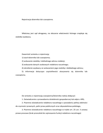 Rejestracja dziennika lub czasopisma. Właściwy jest sąd okręgowy, na obszarze właściwości którego znajduje się siedziba wydawcy. Zawartość wniosku o rejestrację: 1) tytuł dziennika lub czasopisma; 2) wskazanie siedziby i dokładnego adresu redakcji; 3) wskazanie danych osobowych redaktora naczelnego; 4) określenie wydawcy ze wskazaniem jego siedziby i dokładnego adresu; 5) informacje dotyczące częstotliwości ukazywania się dziennika lub czasopisma. Do wniosku o rejestrację czasopisma/dziennika należy dołączyć: 1. Zaświadczenie o prowadzeniu działalności gospodarczej lub odpis z KRS; 2. Pisemne oświadczenie redaktora naczelnego o posiadaniu pełnej zdolności do czynności prawnych, pełni praw publicznych oraz obywatelstwa polskiego, 3. Pisemne oświadczenie redaktora naczelnego w trybie art. 25 ust. 3 ustawy prawo prasowe (brak przeszkód do zajmowania funkcji redaktora naczelnego) 4. Pisemne oświadczenie redaktora naczelnego, że nie korzysta z immunitetu procesowego, a przypadku korzystania przez niego z immunitetu procesowego, do wskazania redaktora, który ponosi odpowiedzialność. Koszt wniosku o rejestrację: 40 złotych. Po wydaniu postanowienia w sprawie rejestracji dziennika lub czasopisma, sąd zakłada osobną księgę rejestrową dla każdego dziennika lub czasopisma, w której umieszcza dane określone we wniosku o rejestrację, późniejsze każdorazowe zmiany tych danych, jak wskazanie redaktora odpowiedzialnego. Postanowienie Sądu Apelacyjnego w Warszawie z 18 stycznia 2013 roku, I ACa 15/13. 1. Rejestr czasopism pełni dwie zasadnicze funkcje: - ma na celu ochronę nazw istniejących już tytułów prasowych, a tym samym ochronę prawa wydawcy do nazwy tytułu prasowego, - ma na celu ochronę interesów potencjalnych odbiorców (czytelników), zapobiegając przed wprowadzeniem ich w błąd co do rzeczywistej tożsamości danego pisma. Z tych względów sąd w postępowaniu rejestrowym ma obowiązek badania z urzędu, czy zgłoszony do rejestracji tytuł prasowy odróżnia się dostatecznie od tytułu już istniejącego oraz czy proponowany tytuł nie będzie mylony z istniejącym. 2. Na rynku prasowym mogą funkcjonować tytuły podobne, jednakże stopień tego podobieństwa nie może wprowadzać przeciętnego czytelnika w błąd. Z tych względów tytuł prasowy podlegający rejestracji nie może być "zbieżny" z tytułem już zarejestrowanym. Zwrot "zbieżny" ma oczywiście szerszy zakres znaczeniowy, aniżeli określenie "identyczny", czy "taki sam". Wydawanie dziennika lub czasopisma można rozpocząć, jeżeli organ rejestracyjny nie rozstrzygnął wniosku o rejestrację w ciągu 30 dni od jego zgłoszenia. Prawa i obowiązki dziennikarzy. Pozyskiwanie informacji: Art. 61 Konstytucji. 1. Obywatel ma prawo do uzyskiwania informacji o działalności organów władzy publicznej oraz osób pełniących funkcje publiczne. Prawo to obejmuje również uzyskiwanie informacji o działalności organów samorządu gospodarczego i zawodowego, a także innych osób oraz jednostek organizacyjnych w zakresie, w jakim wykonują one zadania władzy publicznej i gospodarują mieniem komunalnym lub majątkiem Skarbu Państwa. 2. Prawo do uzyskiwania informacji obejmuje dostęp do dokumentów oraz wstęp na posiedzenia kolegialnych organów władzy publicznej pochodzących z powszechnych wyborów, z możliwością rejestracji dźwięku lub obrazu. 3. Ograniczenie prawa, o którym mowa w ust. 1 i 2, może nastąpić wyłącznie ze względu na określone w ustawach ochronę wolności i praw innych osób i podmiotów gospodarczych oraz ochronę porządku publicznego, bezpieczeństwa lub ważnego interesu gospodarczego państwa. Wyrok Sądu Apelacyjnego w Gdańsku z 24 czerwca 2014 roku, I ACa 206/14 Jeżeli interes obywatela rozumieć, nie jako prawo do posiadania wiedzy o życiu prywatnym i osobistym polityków dla samej satysfakcji ingerowania w ten sposób w ich prywatność, lecz jako wiedzę pozwalającą na weryfikację ich wiarygodności, prawdomówności, konieczną przy dokonywaniu świadomej oceny działalności osoby publicznej w kontekście jej postępowania w życiu prywatnym z prezentowanym publicznie światopoglądem, systemem moralnym i etycznym, dla postrzegania tej osoby przez obywateli, również w kontekście art. 61 Konstytucji RP, to pewne informacje o życiu prywatnym osób publicznych nie tylko mogą, ale wręcz powinny być publikowane. Ostatnio wskazany przepis przyznaje obywatelom RP prawo do uzyskiwania informacji o działalności organów władzy publicznej oraz osób pełniących funkcje publiczne oraz świadomych preferencji wyborczych. Z uzasadnienia: Okolicznością, którą należy wziąć pod uwagę jest Statut partii politycznej, do której należy powód. Otóż z jego art. 3 ust. 1 pkt 4 i pkt 5 oraz ust. 2 wynika, że: celami partii są: umocnienie roli rodziny oraz tworzenie sprzyjających warunków dla jej rozwoju; stanie na straży wartości chrześcijańskich, w szczególności ochrony życia zarówno w wymiarze prawnym, jak i etycznym. Nadto powód w licznych wystąpieniach publicznych, identyfikował się z programem swojej partii, wyrażał stanowisko w omawianej kwestii zgodne z jej stanowiskiem i Statutem. Nie może być wątpliwości, że opinia społeczna ma prawo do weryfikacji, czy głoszone publicznie przez powoda poglądy w przedmiocie umacniania roli rodziny, tworzenia sprzyjających dla jej rozwoju warunków oraz poszanowania wartości chrześcijańskich, do których niewątpliwie należy trwałość i nierozwiązywalność zawartych związków małżeńskich, są tylko sloganami na użytek jego działalności politycznej i podnoszenia popularności wśród wyborców, czy też są jego autentycznymi przekonaniami, które realizuje także w życiu osobistym. Tym samym, czy powód jest osobą wiarygodną, głosząca poglądy rzeczywiście wyznawane i realizowane także w życiu prywatnym, czy tez nie. R