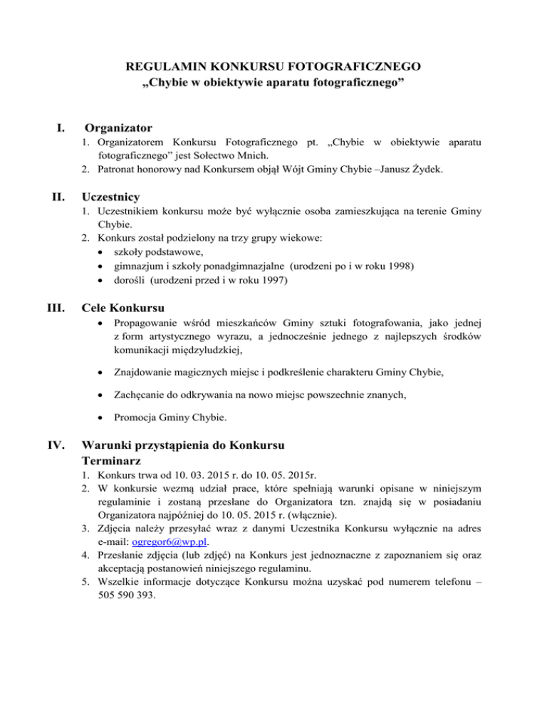 REGULAMIN KONKURSU FOTOGRAFICZNEGO „Chybie w obiektywie aparatu fotograficznego” I. Organizator 1. Organizatorem Konkursu Fotograficznego pt. „Chybie w obiektywie aparatu fotograficznego” jest Sołectwo Mnich. 2. Patronat honorowy nad Konkursem objął Wójt Gminy Chybie –Janusz Żydek. II. Uczestnicy 1. Uczestnikiem konkursu może być wyłącznie osoba zamieszkująca na terenie Gminy Chybie. 2. Konkurs został podzielony na trzy grupy wiekowe: szkoły podstawowe, gimnazjum i szkoły ponadgimnazjalne (urodzeni po i w roku 1998) dorośli (urodzeni przed i w roku 1997) III. IV. Cele Konkursu Propagowanie wśród mieszkańców Gminy sztuki fotografowania, jako jednej z form artystycznego wyrazu, a jednocześnie jednego z najlepszych środków komunikacji międzyludzkiej, Znajdowanie magicznych miejsc i podkreślenie charakteru Gminy Chybie, Zachęcanie do odkrywania na nowo miejsc powszechnie znanych, Promocja Gminy Chybie. Warunki przystąpienia do Konkursu Terminarz 1. Konkurs trwa od 10. 03. 2015 r. do 10. 05. 2015r. 2. W konkursie wezmą udział prace, które spełniają warunki opisane w niniejszym regulaminie i zostaną przesłane do Organizatora tzn. znajdą się w posiadaniu Organizatora najpóźniej do 10. 05. 2015 r. (włącznie). 3. Zdjęcia należy przesyłać wraz z danymi Uczestnika Konkursu wyłącznie na adres e-mail: [email protected]. 4. Przesłanie zdjęcia (lub zdjęć) na Konkurs jest jednoznaczne z zapoznaniem się oraz akceptacją postanowień niniejszego regulaminu. 5. Wszelkie informacje dotyczące Konkursu można uzyskać pod numerem telefonu – 505 590 393. V. Wymagania dotyczące prac Konkursowych 1. Tematem Konkursu jest architektura i przyroda Gminy Chybie. 2. Jeden uczestnik może nadesłać łącznie do pięciu zdjęć. W przypadku nadesłania większej liczby zdjęć przez jednego Uczestnika, Organizator zastrzega sobie prawo do wyboru pięciu zdjęć metodą losową. 3. W konkursie może wygrać tylko jedno zdjęcie danego Uczestnika. 4. Wymogi techniczne fotografii: Zdjęcia zgłaszane do Konkursu mogą być wykonane jedynie w technice kolorowej i muszą być przygotowane według poniższych wymogów: zdjęcie musi być zapisane w formacie jpg, wymiar dłuższego boku zdjęcia musi wynosić min 3000 pikseli, rozdzielczość zdjęcia musi wynosić min 300 dpi, 5. Zdjęcie nie może być poprawiane w programach graficznych. VI. Finał i rozstrzygnięcie Konkursu 1. Rozstrzygnięcie Konkursu nastąpi do dnia 24. 05. 2015 r. 2. Oceny nadesłanych prac dokona i werdykt sformułuje jury w składzie : - Janusz Żydek – Wójt Gminy Chybie - Katarzyna Uchyła - Pocha – Inspektor Urzędu Gminy w Chybiu - Piotr Gmuzdek – Radny Gminy Chybie - Radomił Pudełko – Członek Rady Sołeckiej Mnich - Grzegorz Ochodek – Sołtys Mnicha 3. Jury wybierze po 3 zdjęcia w każdej kategorii , które otrzymają odpowiednio I, II i III miejsce w Konkursie Fotograficznym „Chybie w obiektywie aparatu fotograficznego”. 4. Werdykt jury jest ostateczny. 5. Ogłoszenie wyników odbędzie się w dniu 30 maja 2015 r. podczas festynu sołeckiego w Mnichu. 6. Uczestnicy zostaną powiadomieni telefonicznie lub drogą e-mailową. VII. Nagrody 1. Prace zwycięzców Konkursu zostaną zaprezentowane na pokonkursowej wystawie podczas festynu sołeckiego w Mnichu. Wystawa zaplanowana jest na dzień 30 maja 2015 roku. 2. Każdy z laureatów otrzyma nagrody rzeczowe. VIII. Postanowienia dodatkowe 1. Organizator nie zwraca Uczestnikom żadnych kosztów związanych z ich uczestnictwem w Konkursie. 2. Odpowiedzialność za naruszenie praw osób trzecich do zdjęcia nadesłanego na Konkurs w całości obciąża Uczestnika Konkursu. 3. Organizator zastrzega sobie prawo do wykorzystywania nadesłanych zdjęć (także tych nienagrodzonych) w publikacjach, działaniach promocyjnych, wystawach, na stronach internetowych lub innych profilach, podstronach itp. Organizatora, Urzędu Gminy w Chybiu, Gminnego Ośrodka Kultury w Chybiu, pozostałych sołectw Gminy Chybie itd. bez obowiązku powiadamiania autora zdjęć oraz bez wynagrodzenia dla autora zdjęć za ich wykorzystanie. 4. Uczestnikowi Konkursu nie należy się żadne wynagrodzenie z tytułu prezentacji jego zdjęć na pokonkursowej wystawie oraz późniejszego wykorzystania, o którym mowa w punkcie 3 na co każdy Uczestnik wyraża zgodę zgłaszając się do Konkursu. 5. Wykorzystywanie/publikacja zdjęć będzie opatrzona informacją o autorze. 6. Nadesłane prace przechodzą na własność Organizatora. 7. Organizator na swój koszt wykonuje odbitki, kopie, publikację itp., które stanowią własność Organizatora. 8. Osoba zgłaszająca zdjęcie do Konkursu oświadcza, iż przysługują jej wyłączne i nieograniczone prawa autorskie do nadesłanych fotografii oraz że wszystkie osoby widniejące na fotografiach wyrażają zgodę na ich opublikowanie oraz publiczną ekspozycję. Ponadto oświadcza, że wyraża zgodę na wielokrotne, nieodpłatne publikowanie fotografii oraz opublikowanie imienia, nazwiska, miejscowości zamieszkania uczestnika w materiałach promocyjnych związanych z Konkursem, w wydawnictwach oraz na stronach internetowych Gminy Chybie i Sołectwa Mnich zgodnie z pkt. 3. IX. Postanowienia końcowe 1. Organizator jest uprawniony do zmiany postanowień Regulaminu. 2. Organizator może w każdym terminie unieważnić Konkurs i nie rozstrzygnąć go bez podania przyczyn. 3. Przystąpienie do Konkursu jest dobrowolne. 4. Udział w Konkursie jest równoznaczny z wyrażeniem przez osoby uczestniczące zgody na przetwarzanie ich danych osobowych na potrzeby konkursu oraz w celach marketingowych (ustawa o ochronie danych osobowych z dnia 29.08.1997 r. Dz. U. Nr 133, poz.833 z pózn. zm.)