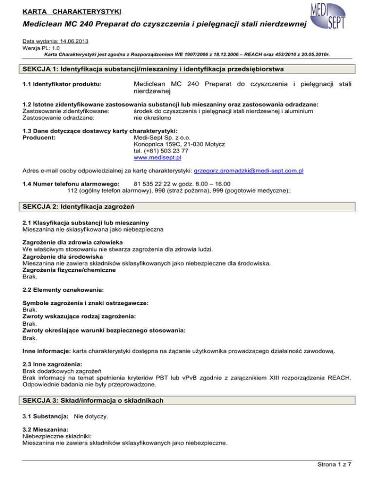 KARTA CHARAKTERYSTYKI Mediclean MC 240 Preparat do czyszczenia i pielęgnacji stali nierdzewnej Data wydania: 14.06.2013 Wersja PL: 1.0 Karta Charakterystyki jest zgodna z Rozporządzeniem WE 1907/2006 z 18.12.2006 – REACH oraz 453/2010 z 20.05.2010r. SEKCJA 1: Identyfikacja substancji/mieszaniny i identyfikacja przedsiębiorstwa 1.1 Identyfikator produktu: Mediclean MC 240 Preparat do czyszczenia i pielęgnacji stali nierdzewnej 1.2 Istotne zidentyfikowane zastosowania substancji lub mieszaniny oraz zastosowania odradzane: Zastosowanie zidentyfikowane: środek do czyszczenia i pielęgnacji stali nierdzewnej i aluminium Zastosowanie odradzane: nie określono 1.3 Dane dotyczące dostawcy karty charakterystyki: Producent: Medi-Sept Sp. z o.o. Konopnica 159C, 21-030 Motycz tel. (+81) 503 23 77 www.medisept.pl Adres e-mail osoby odpowiedzialnej za kartę charakterystyki: [email protected] 1.4 Numer telefonu alarmowego: 81 535 22 22 w godz. 8.00 – 16.00 112 (ogólny telefon alarmowy), 998 (straŜ poŜarna), 999 (pogotowie medyczne); SEKCJA 2: Identyfikacja zagroŜeń 2.1 Klasyfikacja substancji lub mieszaniny Mieszanina nie sklasyfikowana jako niebezpieczna ZagroŜenie dla zdrowia człowieka We właściwym stosowaniu nie stwarza zagroŜenia dla zdrowia ludzi. ZagroŜenie dla środowiska Mieszanina nie zawiera składników sklasyfikowanych jako niebezpieczne dla środowiska. ZagroŜenia fizyczne/chemiczne Brak. 2.2 Elementy oznakowania: Symbole zagroŜenia i znaki ostrzegawcze: Brak. Zwroty wskazujące rodzaj zagroŜenia: Brak. Zwroty określające warunki bezpiecznego stosowania: Brak. Inne informacje: karta charakterystyki dostępna na Ŝądanie uŜytkownika prowadzącego działalność zawodową. 2.3 Inne zagroŜenia: Brak dodatkowych zagroŜeń Brak informacji na temat spełnienia kryteriów PBT lub vPvB zgodnie z załącznikiem XIII rozporządzenia REACH. Odpowiednie badania nie były przeprowadzone. SEKCJA 3: Skład/informacja o składnikach 3.1 Substancja: Nie dotyczy. 3.2 Mieszanina: Niebezpieczne składniki: Mieszanina nie zawiera składników sklasyfikowanych jako niebezpieczne. Strona 1 z 7 KARTA CHARAKTERYSTYKI Mediclean MC 240 Preparat do czyszczenia i pielęgnacji stali nierdzewnej Data wydania: 14.06.2013 Wersja PL: 1.0 Karta Charakterystyki jest zgodna z Rozporządzeniem WE 1907/2006 z 18.12.2006 – REACH oraz 453/2010 z 20.05.2010r. SEKCJA 4: Środki pierwszej pomocy 4.1 Opis środków pierwszej pomocy W przypadku kontaktu ze skórą: NaleŜy zdjąć zanieczyszczone ubranie, umyć zabrudzoną skórę wodą z mydłem, spłukać dokładnie wodą, w przypadku pojawienia się podraŜnienia, rumieni skontaktować się z lekarzem. W przypadku kontaktu z oczami: Przepłukać oczy przez kilkanaście minut (ok. 15) duŜą ilością wody, trzymając powieki szeroko rozwarte. Unikać silnego strumienia, ze względu na niebezpieczeństwo uszkodzenia rogówki, skontaktować się z lekarzem. NaraŜenie inhalacyjne: W razie zawrotów głowy lub nudności wyprowadzić poszkodowanego na świeŜe powietrze, w razie braku szybkiej poprawy zasięgnąć porady lekarza. W przypadku połknięcia: Nie wywoływać wymiotów, przepłukać jamę ustną, w razie braku szybkiej poprawy zasięgnąć porady lekarza. 4.2 NajwaŜniejsze ostre i opóźnione objawy oraz skutki naraŜenia: Układ oddechowy. Brak znanych szkodliwych oddziaływań. Przewód pokarmowy. MoŜe spowodować podraŜnienie błon śluzowych przewodu pokarmowego. Kontakt z oczami: Brak znanych szkodliwych oddziaływań Kontakt ze skórą: Brak znanych szkodliwych oddziaływań 4.3 Wskazania dotyczące wszelkiej natychmiastowej pomocy lekarskiej i szczególnego postępowania z poszkodowanym: Decyzję o sposobie postępowania podejmuje lekarz po ocenie stanu poszkodowanego. SEKCJA 5: Postępowanie w przypadku poŜaru 5.1 Środki gaśnicze: Odpowiednie środki gaśnicze: piana alkoholoodporna lub suche proszki gaśnicze (A,B,C), dwutlenek węgla (gaśnica śniegowa), piasek lub ziemia, mgła wodna. Stosować metody gaśnicze odpowiednie do warunków otoczenia. Niewłaściwe środki gaśnicze: Silny strumień wody. 5.2 Szczególne zagroŜenia związane z substancją lub mieszaniną: Brak. 5.3 Informacje dla straŜy poŜarnej: Pojemniki znajdujące się w strefie poŜaru chłodzić rozproszonym strumieniem wody, o ile jest to moŜliwe usunąć ze strefy zagroŜenia. W przypadku poŜaru w zamkniętym pomieszczeniu naleŜy stosować odzieŜ ochronną i aparat oddechowy na spręŜone powietrze. Nie dopuszczać do przedostania się wody gaśniczej do wód powierzchniowych, gruntowych i kanalizacji. SEKCJA 6: Postępowanie w przypadku niezamierzonego uwolnienia do środowiska 6.1 Indywidualne środki ostroŜności, wyposaŜenie ochronne i procedury w sytuacjach awaryjnych Dla osób nienaleŜących do personelu udzielającego pomocy: zawiadomić o awarii odpowiednie słuŜby. Usunąć z obszaru zagroŜenia osoby niebiorące udziału w likwidacji awarii. Dla osób udzielających pomocy: Zadbać o odpowiednią wentylację, stosować indywidualne środki ochrony. 6.2 Środki ostroŜności w zakresie ochrony środowiska: Zapobiegać rozprzestrzenianiu się oraz przedostaniu do kanalizacji i zbiorników wodnych, poinformować władze lokalne w przypadku niemoŜności zapewnienia ochrony. 6.3 Metody i materiały zapobiegające rozprzestrzenianiu się skaŜenia i słuŜące do usuwania skaŜenia: Zapobiegać rozprzestrzenianiu się i usuwać poprzez zebranie na materiale absorpcyjnym (piasek, trociny, ziemia okrzemkowa, absorbent uniwersalny), zanieczyszczony materiał umieścić w odpowiednio oznakowanych pojemnikach. Zanieczyszczony materiał umieścić w odpowiednio oznakowanych pojemnikach w celu utylizacji zgodnie z obowiązującymi przepisami. Strona 2 z 7 KARTA CHARAKTERYSTYKI Mediclean MC 240 Preparat do czyszczenia i pielęgnacji stali nierdzewnej Data wydania: 14.06.2013 Wersja PL: 1.0 Karta Charakterystyki jest zgodna z Rozporządzeniem WE 1