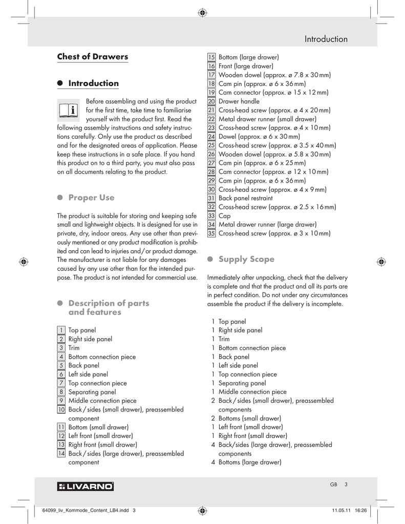 Introduction Chest of Drawers Introduction Before assembling and using the product for the first time, take time to familiarise yourself with the product first. Read the following assembly instructions and safety instructions carefully. Only use the product as described and for the designated areas of application. Please keep these instructions in a safe place. If you hand this product on to a third party, you must also pass on all documents relating to the product. Proper Use The product is suitable for storing and keeping safe small and lightweight objects. It is designed for use in private, dry, indoor areas. Any use other than previously mentioned or any product modification is prohibited and can lead to injuries and / or product damage. The manufacturer is not liable for any damages caused by any use other than for the intended purpose. The product is not intended for commercial use. Description of parts and features 1 2 3 4 5 6 7 8 9 10 11 12 13 14 Top panel Right side panel Trim Bottom connection piece Back panel Left side panel Top connection piece Separating panel Middle connection piece Back / sides (small drawer), preassembled component Bottom (small drawer) Left front (small drawer) Right front (small drawer) Back / sides (large drawer), preassembled component 15 16 17 18 19 20 21 22 23 24 25 26 27 28 29 30 31 32 33 34 35 Bottom (large drawer) Front (large drawer) Wooden dowel (approx. ø 7.8 x 30 mm) Cam pin (approx. ø 6 x 36 mm) Cam connector (approx. ø 15 x 12 mm) Drawer handle Cross-head screw (approx. ø 4 x 20 mm) Metal drawer runner (small drawer) Cross-head screw (approx. ø 4 x 10 mm) Dowel (approx. ø 6 x 30 mm) Cross-head screw (approx. ø 3.5 x 40 mm) Wooden dowel (approx. ø 5.8 x 30 mm) Cam pin (approx. ø 6 x 25 mm) Cam connector (approx. ø 12 x 10 mm) Cam pin (approx. ø 6 x 36 mm) Cross-head screw (approx. ø 4 x 9 mm) Back panel restraint Cross-head screw (approx. ø 2.5 x 16 mm) Cap Metal drawer runner (large drawer) Cross-head screw (approx. ø 3 x 10 mm) Supply Scope Immediately after unpacking, check that the delivery is complete and that the product and all its parts are in perfect condition. Do not under any circumstances assemble the product if the delivery is incomplete. 1 1 1 1 1 1 1 1 1 2 2 1 1 4 4 Top panel Right side panel Trim Bottom connection piece Back panel Left side panel Top connection piece Separating panel Middle connection piece Back / sides (small drawer), preassembled components Bottoms (small drawer) Left front (small drawer) Right front (small drawer) Back/sides (large drawer), preassembled components Bottoms (large drawer) GB 64099_liv_Kommode_Content_LB4.indd 3 3 11.05.11 16:26 Introduction / Safety advice 4 19 10 12 10 10 4 12 2 3 16 12 12 2 12 4 4 12 8 16 1 Fronts (large drawer) Wooden dowels (approx. ø 7.8 x 30 mm) Cam pins (approx. ø 6 x 36 mm) Cam connectors (approx. ø 15 x 12 mm) Drawer handles Cross-head screws (approx. ø 4 x 20 mm) Metal drawer runners (small drawer) Cross-head screws (approx. ø 4 x 10 mm) Dowel (approx. ø 6 x 30 mm) Cross-head screws (approx. ø 3.5 x 40 mm Wooden dowels (approx. ø 5.8 x 30 mm) Cam pins (approx. ø 6 x 25 mm) Cam connectors (approx. ø 12 x 10 mm) Cam pins (approx. ø 6 x 36 mm) Cross-head screws (approx. ø 4 x 9 mm) Back panel restraints Cross-head screws (approx. ø 2.5 x 16 mm) Caps Metal drawer runners (large drawer) Cross-head screws (approx. ø 3 x 10 mm) Assembly instructions Technical data Dimensions: approx. 79 x 80 x 34 cm (W x H x D) Material: MDF, chipboard Max. load: 20 kg for top panel 10 kg per drawer Safety advice KEEP ALL THE SAFETY ADVICE AND INSTRUCTIONS IN A SAFE PLACE FOR FUTURE REFERENCE! RISK OF LOSS OF LIFE OR ACCIDENT TO INFANTS AND CHILDREN! Never leave children unsupervised with the packaging materials. Danger of suffocation. This product is not a toy! CAUTION! RISK OF INJURY! Make sure that all parts are undamaged and assembled correctly. Improper assembly carries a risk of 4 injury. Damaged parts may affect the safety and function of the product. CAUTION! Do not leave children unsupervised! The product is not a climbing frame or a toy! Make sure that nobody, especially a child, climbs on or leans against the product. The wall fastenings could be torn out of the wall and the product could tip over, resulting in injury or damage. DANGER OF ELECTRIC SHOCK! DANGER OF DAMAGE TO PROPERTY! DANGER OF INJURY! Ensure that you do not strike electrical cables, gas or water pipes when you are drilling into the wall. If necessary, check the wall using a suitable detector before you drill. Examine the wall before installation and choose suitable installation fixings. We have supplied fixings suitable for an ordinary solid masonry wall. CAUTION! FIRE HAZARD! Do not position the product near an open fire and / or radiant heaters. Make sure that this product is standing on a solid, level surface. Distribute weight upon this products‘ surface evenly so that it cannot overturn. Regularly check the stability of all connections and retighten the screws. Keep the product away from water and moisture. Otherwise the product may be damaged. The safety of the product can only be ensured if it is properly assembled and all connections are made securely. Check the stability of the product before you use it. CAUTION! Do not lift or move the product if it is supporting any object. CAUTION! RISK OF SHEARING OR CRUSHING INJURY! Please ensure that your fingers do not get themselves between the drawers and the carcass when you are opening or closing the drawers. Do not exceed the allowable maximum loads on the top panel (20 kg) kg or the drawers (10 kg each). Failure to observe this advice may lead to injury and/ or damage to the product. GB 64099_liv_Kommode_Content_LB4.indd 4 11.05.11 16:26 Assembly / Cleaning and Care / Service / Disposal Assembly Note: Assemble the product on a scratch-resistant floor that is sufficiently large. You may have to put a blanket or the like down in