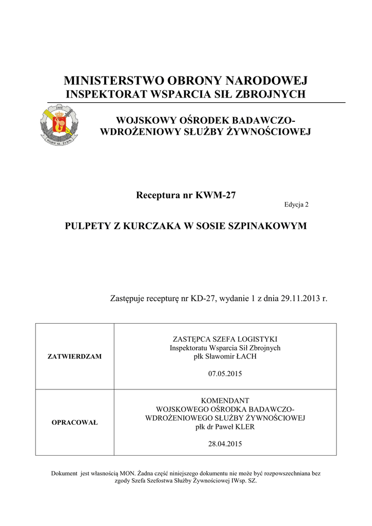 MINISTERSTWO OBRONY NARODOWEJ INSPEKTORAT WSPARCIA SIŁ ZBROJNYCH WOJSKOWY OŚRODEK BADAWCZOWDROŻENIOWY SŁUŻBY ŻYWNOŚCIOWEJ Receptura nr KWM-27 Edycja 2 PULPETY Z KURCZAKA W SOSIE SZPINAKOWYM Zastępuje recepturę nr KD-27, wydanie 1 z dnia 29.11.2013 r. ZATWIERDZAM ZASTĘPCA SZEFA LOGISTYKI Inspektoratu Wsparcia Sił Zbrojnych płk Sławomir ŁACH 07.05.2015 OPRACOWAŁ KOMENDANT WOJSKOWEGO OŚRODKA BADAWCZOWDROŻENIOWEGO SŁUŻBY ŻYWNOŚCIOWEJ płk dr Paweł KLER 28.04.2015 Dokument jest własnością MON. Żadna część niniejszego dokumentu nie może być rozpowszechniana bez zgody Szefa Szefostwa Służby Żywnościowej IWsp. SZ. RECEPTURA NR KWM-27 1. Nazwa handlowa wyrobu Pulpety z kurczaka w sosie szpinakowym 2. Nazwa opisowa wyrobu Określa producent zgodnie z obowiązującym prawem 3. Typ wyrobu wg normy NO-89-A202:2015 Konserwa warzywno-mięsna typu mięsa mielone w sosie, tablica 5. 4. Wsad surowcowy Nie dopuszcza się używania mięsa odkostnionego mechanicznie (MDOM lub MOM). Tabela 1. Wymagania dotyczące pulpetów Nazwa surowca Wymagania dla surowca % (m/m) udział Stosowane składnika na procesy Rozdrobnienie 100 kg pulpetów technologiczne nie mniej niż Pulpety Mięso z kurczaka Mięso z nogi bez skóry, bez kości, niepeklowane Przyprawy i dodatki: Bułka tarta Gotowanie 91,0 sito o średnicy oczek 5 mm - - Minimalna ilość wynikająca z potrzeb procesu technologicznego - - 7,5 - Sól pieprz Masa jajeczna pasteryzowana lub proszek jajeczny - Tabela 2. Wymagania dotyczące sosu Nazwa surowca Wymagania dla surowca % (m/m) udział składnika na 100 kg sosu nie mniej niż Stosowane procesy Rozdrobnienie technologiczne Sos Warzywa: szpinak Mrożony brykiet ze świeżych młodych liści klasy I Ser topiony kremowy Kremowy, śmietankowy, o zawartości tłuszczu do 29%, zaw. s.m. do 43% - 37,8 - - 12,0 - Przyprawy i dodatki: mąka pszenna typ 500 Dopuszcza się Minimalna ilość stosowanie mieszanki wynikająca z aromatycznokoncentratów potrzeb procesu smakowe spożywczych w technologicznego pieprz czarny celu podkreślenia smaku: sosów, mielony rosołków. czosnek suszony mielony - - Ilości użytych do produkcji przypraw i dodatków muszą gwarantować otrzymanie produktu o cechach organoleptycznych i fizykochemicznych spełniających wymagania normy NO-89-A202. W przypadku zakupu gotowych półproduktów i surowców u poddostawców, należy zapewnić i udokumentować skład surowcowy zgodny z niniejszą recepturą. 5. Wymagania dla wyrobu gotowego uzupełniające postanowienia normy NO-89-A202:2015 Konserwy warzywno-mięsne i bezmięsne sterylizowane Charakterystyka organoleptyczna wyrobu Wygląd ogólny: - produkt uformowany z rozdrobnionego mięsa drobiowego w pulpety o kształcie kulistym lekko spłaszczonym, gotowane, zalane sosem z widocznymi cząstkami szpinaku Smak: - wyczuwalny smak szpinaku Zawartość składników mięsnych w stosunku do deklarowanej masy netto % (m/m), nie mniej niż 45 Zawartość tłuszczu wolnego % (m/m), nie więcej niż Liczba pulpetów w opakowaniu, nie mniej niż: 10 - opakowania 300 g - nie normuje się., - inne opakowania - 2 szt. na porcję 6. Metody badań Metody badań jak określono w NO-89-A202:2015. 6.1. Do badania zawartości soli za metody równoważne uznaje się także metody wg: PN-A- 82112:1973+Az1:20021 Mięso i przetwory mięsne - Oznaczanie zawartości soli kuchennej PN-ISO 1841-2:2002 Mięso i przetwory mięsne - Oznaczanie zawartości chlorków - Część 2: Metoda potencjometryczna PN-A-75101-10:19902 Przetwory owocowe i warzywne - Przygotowanie próbek do badań fizykochemicznych - Oznaczenie zawartości chlorków 6.2 Procedury badawcze własne laboratorium oparte na metodykach wskazanych w normie NO-89-A202 lub niniejszej recepturze uznaje się za równoważne. 1 2 Norma wycofana Norma wycofana