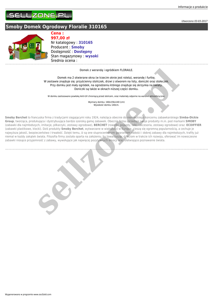 Informacje o produkcie Utworzono 03-03-2017 Smoby Domek Ogrodowy Floralie 310165 Cena : 997,00 zł Nr katalogowy : 310165 Producent : Smoby Dostępność : Dostępny Stan magazynowy : wysoki Średnia ocena : Domek z werandą i ogródkiem FLORAILE. pl Domek ma 2 otwierane okna (w trzecim oknie jest roleta), werandę i furtkę. W zestawie znajduje się: przyścienny stoliczek, drzwi z otworem na listy, doniczki oraz stołeczek. Przy domku jest mały ogródek, na ogrodzeniu którego znajduje się skrzynka na kwiaty. Doniczki są także w oknach niższej części domku. W domku zastosowano powłokę Anti-UV chroniącą przed słońcem, oraz materiały odporne na warunki atmosferyczne. e. Wymiary domku: 160x156x140 (cm) Wysokość domku 140cm. se llz on Smoby Berchet to francuska firma z tradycjami sięgającymi roku 1924, należąca obecnie do niemieckiego koncernu zabawkarskiego Simba-Dickie Group, tworząca, produkująca i dystrybuująca bardzo szeroką gamę zabawek. Obecnie firma sprzedaje swoje produkty m.in. pod markami SMOBY (zabawki dla najmłodszych, imitacje, piłkarzyki, zestawy ogrodowe), BERCHET (rowerki, pojazdy, lalki i akcesoria, zestawy ogrodowe) oraz ECOIFFIER (zabawki plastikowe, klocki). Dziś produkty Smoby Berchet, wytwarzane w większości w Europie, cieszą się ogromną popularnością, a cechuje je najwyższa jakość, bezpieczeństwo i trwałość. Dzięki temu, iż są one stuprocentowym gwarantem radości i dobrej zabawy dla najmłodszych, trafiły już niemal w każdy zakątek świata. Filozofia firmy została oparta na założeniu, by towarzysząc dzieciom w trakcie ich rozwoju, oferować im nowoczesne zabawki niosące przyjemność z zabawy, wywołujące jak najwięcej pozytywnych emocji oraz ułatwiające poznawanie świata. Wygenerowano w programie www.oscGold.com