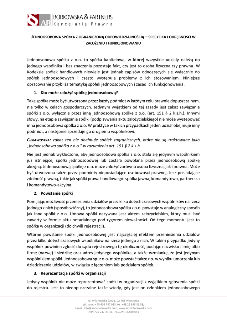 JEDNOOSOBOWA SPÓŁKA Z OGRANICZONĄ ODPOWIEDZIALNOŚCIĄ – SPECYFIKA I ODRĘBNOŚCI W ZAŁOŻENIU I FUNKCJONOWANIU Jednoosobowa spółka z o.o. to spółka kapitałowa, w której wszystkie udziały należą do jednego wspólnika i bez znaczenia pozostaje fakt, czy jest to osoba fizyczna czy prawna. W Kodeksie spółek handlowych niewiele jest jednak zapisów odnoszących się wyłącznie do spółek jednoosobowych i często występują problemy z ich stosowaniem. Niniejsze opracowanie przybliża tematykę spółek jednoosobowych i zasad ich funkcjonowania. 1. Kto może założyć spółkę jednoosobową? Taka spółka może być utworzona przez każdy podmiot w każdym celu prawnie dopuszczalnym, nie tylko w celach gospodarczych. Jedynym wyjątkiem od tej zasady jest zakaz zawiązania spółki z o.o. wyłącznie przez inną jednoosobową spółkę z o.o. (art. 151 § 2 k.s.h.). Innymi słowy, na etapie zawiązania spółki (podpisywania aktu założycielskiego) nie może występować inna jednoosobowa spółka z o.o. W praktyce w takich przypadkach jeden udział obejmuje inny podmiot, a następnie sprzedaje go drugiemu wspólnikowi. CIEKAWOSTKA: zakaz ten nie obejmuje spółek zagranicznych, które nie są traktowane jako „jednoosobowa spółka z o.o.” w rozumieniu art. 151 § 2 k.s.h. Nie jest jednak wykluczone, aby jednoosobowa spółka z o.o. stała się jedynym wspólnikiem już istniejącej spółki jednoosobowej lub została powołana przez jednoosobową spółkę akcyjną. Jednoosobową spółkę z o.o. może założyć zarówno osoba fizyczna, jak i prawna. Może być utworzona także przez podmioty nieposiadające osobowości prawnej, lecz posiadające zdolność prawną, takie jak spółki prawa handlowego: spółka jawna, komandytowa, partnerska i komandytowo-akcyjna. 2. Powstanie spółki Pomijając możliwość przeniesienia udziałów przez kilku dotychczasowych wspólników na rzecz jednego z nich (sposób wtórny), to jednoosobowa spółka z o.o. powstaje w analogiczny sposób jak inne spółki z o.o. Umowa spółki nazywana jest aktem założycielskim, który musi być zawarty w formie aktu notarialnego pod rygorem nieważności. Od tego momentu jest to spółka w organizacji (do chwili rejestracji). Wtórne powstanie spółki jednoosobowej jest najczęściej efektem przeniesienia udziałów przez kilku dotychczasowych wspólników na rzecz jednego z nich. W takim przypadku jedyny wspólnik powinien zgłosić do sądu rejestrowego tę okoliczność, podając nazwisko i imię albo firmę (nazwę) i siedzibę oraz adres jedynego wspólnika, a także wzmiankę, że jest jedynym wspólnikiem spółki. Jednoosobowa sp. z o.o. może powstać także np. w wyniku umorzenia lub dziedziczenia udziałów, w związku z łączeniem lub podziałem spółek. 3. Reprezentacja spółki w organizacji Jedyny wspólnik nie może reprezentować spółki w organizacji z wyjątkiem zgłoszenia spółki do rejestru. Jest to niedopuszczalne także wtedy, gdy jest on członkiem jednoosobowego Al. Wilanowska 9A/31, 02-765 Warszawa tel. kom. + 48 605 787 023, tel. +48 22 898 35 88, e-mail: [email protected], www.AnnaBorkowska.com NIP: 775-247-23-66 REGON: 142105051 zarządu. W takiej sytuacji powinien wyznaczyć osobę uprawnioną do reprezentowania spółki. Zgodnie z art. 162 k.s.h. w imieniu spółki jednoosobowej w organizacji może działać zarząd spółki (jeśli w jego skład nie wchodzi tylko jedyny wspólnik) lub pełnomocnik powołany przez jedynego wspólnika. 4. Stosunki prawne między jedynym członkiem zarządu a spółką 4.1. Składanie oświadczeń woli przez jedynego członka zarządu spółce Jeśli wszystkie udziały w spółce przysługują jedynemu wspólnikowi albo jedynemu wspólnikowi i spółce, wówczas oświadczenie woli takiego wspólnika składane spółce wymaga formy pisemnej pod rygorem nieważności, chyba że ustawa stanowi inaczej (art. 173 § 1 k.s.h.). Powyższa zasada dotyczy oświadczeń składanych spółce, a nie „w” spółce, a zatem nie dotyczy oświadczeń składanych przez wspólnika jako organ spółki (na zgromadzeniu wspólników). 4.2. Dokonywanie czynności prawnych przez wspólnika, jedynego członka zarządu ze spółką W spółce jednoosobowej, w przypadku gdy wspólnik, któremu przysługują wszystkie udziały, lub jeżeli udziały przysługują wyłącznie jemu i spółce, jest zarazem jedynym członkiem zarządu czynność prawna między wspólnikiem, a reprezentowaną przez niego spółką wymaga formy aktu notarialnego. O każdorazowym dokonaniu takiej czynności prawnej notariusz zawiadamia sąd rejestrowy, przesyłając wypis aktu notarialnego (art. 210 § 2 k.s.h.). Niezachowanie przewidzianej formy aktu notarialnego powoduje bezwzględną nieważność dokonanej czynności prawnej. Przepisu tego nie stosuje się zatem w odniesieniu do spółek jednoosobowych o wieloosobowym zarządzie, w skład którego wchodzi także jedyny wspólnik. W takim przypadku znajduje zastosowanie art. 210 § 1 k.s.h. i konieczne jest zawarcie umowy przez radę nadzorczą (jeśli jest ustanowiona) lub wyznaczenie pełnomocnika przez zgromadzenie wspólników spółki. 5. Zatrudnienie wspólnika spółki jednoosobowej w spółce 5.1. Umowa o pracę ze wspólnikiem jednoosobowej spółki z o.o. niebędącym jedynym członkiem jej zarządu Jeżeli jedyny wspólnik nie jest członkiem zarządu spółki, nie ma przeszkód, aby był w spółce zatrudniony na umowę o pracę. Mamy wówczas do czynienia z taką samą sytuacją, jak w przypadku spółki wieloosobowej, w której wspólnik nie jest członkiem zarządu. Spełnione są wtedy wymogi dotyczące cech stosunku pracy, m.in. podporządkowania pracowniczego. Strona Al. Wilanowska 9A/31, 02-765 Warszawa tel. kom. + 48 605 787 023, tel. +48 22 898 35 88, e-mail: [email protected], www.AnnaBorkowska.com NIP: 775-247-23-66 REGON: 142105051 2 CIEKAWOSTKA: Zgodnie z art. 8 ust. 6 pkt 4 ustawy o systemie