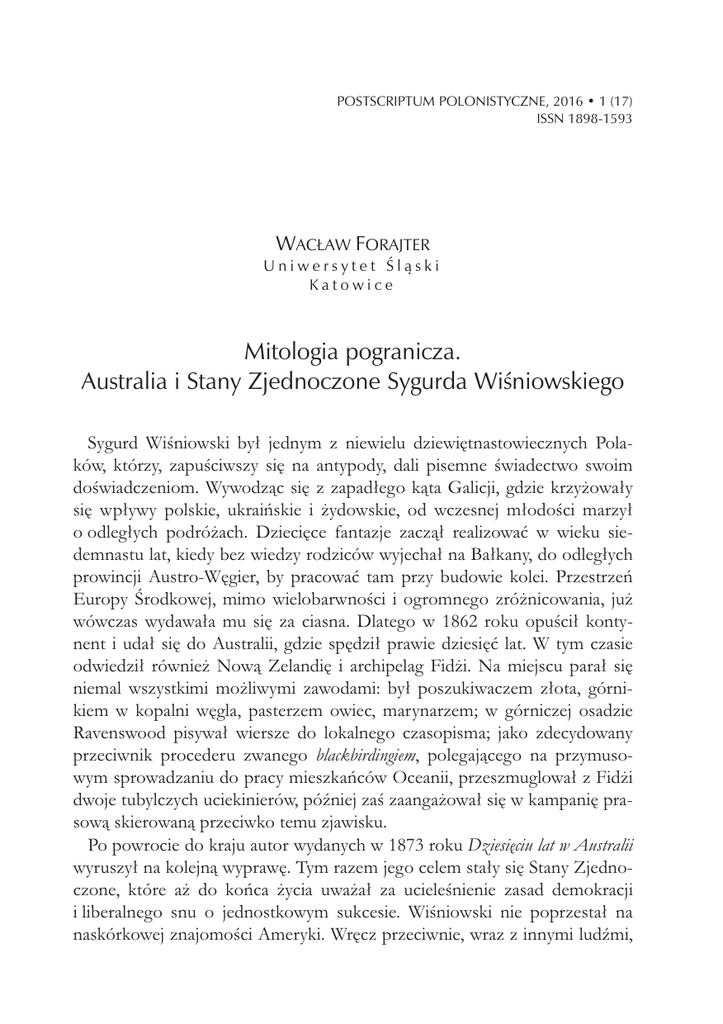 POSTSCRIPTUM POLONISTYCZNE, 2016 • 1 (17) ISSN 1898-1593 WAC AW FORAJTER Uniwersytet !l"ski Katowice Mitologia pogranicza. Australia i Stany Zjednoczone Sygurda Wi#niowskiego Sygurd Wi niowski by! jednym z niewielu dziewi"tnastowiecznych Polaków, którzy, zapu ciwszy si" na antypody, dali pisemne wiadectwo swoim do wiadczeniom. Wywodz#c si" z zapad!ego k#ta Galicji, gdzie krzy$owa!y si" wp!ywy polskie, ukrai%skie i $ydowskie, od wczesnej m!odo ci marzy! o odleg!ych podró$ach. Dzieci"ce fantazje zacz#! realizowa& w wieku siedemnastu lat, kiedy bez wiedzy rodziców wyjecha! na Ba!kany, do odleg!ych prowincji Austro-W"gier, by pracowa& tam przy budowie kolei. Przestrze% Europy 'rodkowej, mimo wielobarwno ci i ogromnego zró$nicowania, ju$ wówczas wydawa!a mu si" za ciasna. Dlatego w 1862 roku opu ci! kontynent i uda! si" do Australii, gdzie sp"dzi! prawie dziesi"& lat. W tym czasie odwiedzi! równie$ Now# Zelandi" i archipelag Fid$i. Na miejscu para! si" niemal wszystkimi mo$liwymi zawodami: by! poszukiwaczem z!ota, górnikiem w kopalni w"gla, pasterzem owiec, marynarzem; w górniczej osadzie Ravenswood pisywa! wiersze do lokalnego czasopisma; jako zdecydowany przeciwnik procederu zwanego blackbirdingiem, polegaj#cego na przymusowym sprowadzaniu do pracy mieszka%ców Oceanii, przeszmuglowa! z Fid$i dwoje tubylczych uciekinierów, pó(niej za zaanga$owa! si" w kampani" prasow# skierowan# przeciwko temu zjawisku. Po powrocie do kraju autor wydanych w 1873 roku Dziesi ciu lat w Australii wyruszy! na kolejn# wypraw". Tym razem jego celem sta!y si" Stany Zjednoczone, które a$ do ko%ca $ycia uwa$a! za uciele nienie zasad demokracji i liberalnego snu o jednostkowym sukcesie. Wi niowski nie poprzesta! na naskórkowej znajomo ci Ameryki. Wr"cz przeciwnie, wraz z innymi lud(mi, 24 POSTSCRIPTUM POLONISTYCZNE, 2016 • 1 (17) pod#$aj#cymi za z!otem i przygod#, wyjecha! na Zachód, czynnie uczestnicz#c w realizacji „Boskiego Przeznaczenia” (ang. Manifest Destiny) – przekonania o konieczno ci zagospodarowania przez bia!ych osadników niezmierzonych, rzekomo pustych obszarów wewn#trz kontynentu. W tym miejscu nale$y wspomnie& o antypatii Polaka do rdzennych mieszka%ców Ameryki, szczególnie za Indian Dakota (Siuksów), b"d#cych, jego zdaniem, uosobieniem fa!szu, g!upoty czy lenistwa i stanowi#cych gigantyczn# przeszkod" w realizacji idei, alegorycznie przedstawionych przez Johna Gasta na s!ynnym obrazie American Progress z 1872 roku (Forajter 2014, 243–291). Pragn#c zapozna& polskiego czytelnika z obcym kontekstem kulturowym, opisywa! swoje do wiadczenia w licznych korespondencjach do „K!osów”, „Kuriera Warszawskiego” czy „W"drowca”. Po powrocie do kraju nawi#za! wspó!prac" ze Stanis!awem Szczepanowskim oraz inwestowa! w pola naftowe podczas boomu na Podkarpaciu. Wszystkie przedsi"wzi"cia Wi niowskiego cechowa!y si" daleko posuni"t# zaradno ci#, sk!onno ci# do ryzyka i nieliczeniem si" z przeszkodami. Cenna w tym kontek cie wydaje si" uwaga krakowskiej badaczki: XIX-wieczny dziennikarz mówi o sobie jak o obywatelu wiata, którego zadaniem jest dawa& wiadectwo obserwowanych wydarze%, ale te$ czynnie w nich uczestniczy&, ustanawia& nowy, lepszy – w jego mniemaniu ) porz#dek (*yrek 2014, 590). W ten sposób globtroter, co wielokrotnie podkre la!, promowa! polsko & jako pozytywny wzorzec to$samo ciowy. Zachowuj#c odpowiedni# ostro$no & wobec licznych przechwa!ek twórcy, maj#cego tendencj" do nieustannego podkre lania w!asnej odwagi i szlachetno ci, musz" wspomnie&, $e w zachowaniach „Big Johna” – bo tak brzmia! pseudonim Wi niowskiego na z!otono nych polach ) cz"sto dochodzi!y do g!osu postszlacheckie (czy wr"cz sarmackie) cechy, których, bez w#tpienia, nie mo$na nazwa& godnymi na ladowania: awanturnictwo, sk!onno & do bójek czy przesadna brawura. Oczywi cie, trudno w tym miejscu rozstrzygn#&, które z nich bohater przywióz! z rodzinnej prowincji, a które wymusi! na nim specyficzny kontekst geograficznych i kulturowych pograniczy, kszta!tuj#cych okre lone wzorce m"sko ci. Na pewno jednak w jego zachowaniach ujawnia!a si" sk!onno & do traktowania $ycia jako gry hazardowej bez zb"dnego obliczania potencjalnych strat i zysków. Swoj# $yciow# w!ócz"g" po antypodach cywilizowanego wiata nazwa! on gr# „milsz#” od rulety (Wi niowski 1873, 330), a o jego WAC AW FORAJTER: Mitologia pogranicza… 25 wyje(dzie do Queenslandu na z!otodajne pola zadecydowa! jeden rzut monet# (Wi niowski 1873, 308). Predylekcja do tak pojmowanego ryzyka mia!a charakter nowoczesny w pe!nym tego s!owa znaczeniu. Jak bowiem pisa! Peter Sloterdijk, podkre laj#c rol" filozofii lepego trafu w procesie kszta!towania si" ekspansywnej podmiotowo ci zachodniej, horyzont „nowo$ytno ci to pole gry, na którym rzucane s# ko ci przypadku” (Sloterdijk 2011, 64). Najcz"stsz# sceneri# wydarze% przedstawionych we wspomnieniach, artyku!ach czy utworach fabularnych Galicjanina jest pogranicze (frontier) ) „ruchoma granica obszaru eksploracji i eksploatacji zasobów naturalnych”, szczególnie istotna dla gospodarki, a pó(niej kultury, nowych angloj"zycznych spo!ecze%stw. Podobnie jak dziewi"tnastowieczna metropolia pogranicze przyci#ga!o zró$nicowane masy ludzkie, co decydowa!o w obu obszarach o p!ynno ci relacji spo!ecznych i statusów: „Kto niczego nie posiada, ale to i owo potrafi, mo$e tu do czego doj &” (Osterhammel 2013, 423). I cho& panowanie nad peryferyjnym pograniczem organizowa!o metropolitarne centrum, to frontier, kszta!tuj#c „szczególne interesy, to$samo ci, wizje $ycia i typy charakterologiczne”, tak$e wywiera!o wp!yw na spo!eczno ci miejskie (Osterhammel 2013, 423; zob. te$ Weaver 1996, 8, 59 i n.). W przypadku Australii chodzi!oby, na przyk!ad, o konflikty interesów wielkich hodowców z rolnikami i mieszka%cami miast, a w Stanach o prowadzony przy wsparciu kapita!u ze Wschodniego Wybrze$a spekulacyjny handel $yzn# ziemi#, która zawsze by!a towarem deficytowym. Z kolei przeds
