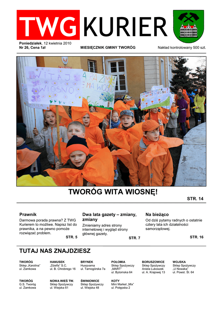ż TWG KURIER Poniedziałek, 12 kwietnia 2010 Nr 26, Cena 1zł MIESIĘCZNIK GMINY TWORÓG Nakład kontrolowany 500 szt. TWORÓG WITA WIOSNĘ! STR. 14 Prawnik Darmowa porada prawna? Z TWG Kurierem to możliwe. Napisz list do prawnika, a na pewno pomoże rozwiązać problem. STR. 5 Dwa lata gazety – zmiany, zmiany Zmieniamy adres strony internetowej i wygląd strony głównej gazety. Na bieżąco Od dziś pytamy radnych o ostatnie cztery lata ich działalności samorządowej. STR. 16 STR. 7 TUTAJ NAS ZNAJDZIESZ TWORÓG Sklep „Karolina” ul. Zamkowa HANUSEK „Dżelfa” S.C. ul. B. Chrobrego 16 BRYNEK Husqvarna ul. Tarnogórska 7a POŁOMIA Sklep Spożywczy „MART” ul. Bytomska 64 TWORÓG G.S. Tworóg ul. Zamkowa NOWA WIEŚ TW. Sklep Spożywczy ul. Wiejska 61 ŚWINIOWICE Sklep Spożywczy ul. Wiejska 48 KOTY Mini Market „Mix” ul. Potępska 2 BORUSZOWICE Sklep Spożywczy Aniela Lukoszek ul. A. Krajowej 13 WOJSKA Sklep Spożywczy „U Nowaka” ul. Powst. Śl. 64 TWG KURIER WSTĘPNIAK Spis treści Od redakcji LISTONOSZHHHH....HH.HHHHHHHH....s.3 Drodzy Mieszkańcy! Zachęcamy do lektury kolejnego miesięcznika, a w nim kilka nowości! SESJAHHHH..H...HHHHHHHHHHHH..s.4 - Niezbędnik Mieszkańca Gminy - Pieniądze unijne dla przedszkoli i szkół - Protest numeru Rozpoczynamy nowe cykle artykułów w poszczególnych działach, i tak nasz Prawnik będzie zajmował się prawem administracyjnym, w związku z czym zwraca się do Was z prośbą o zgłaszanie swoich problemów i wątpliwości w tym zakresie. Zaznaczamy, że porady udzielane poprzez naszą gazetę są darmowe, a autorom listów gwarantujemy anonimowość. PRAWNIKHHHH...HHHHHHHHHHHH..s.5 - Opłata adiacencka GMINA POD LUPĄHHHHHHHHHHHHH.s.6 - Drogie Panie, na zdrowie! - Zmiany, zmiany, zmiany Tworoskie organy W dziale Kulturalnie będziemy w odcinkach poznawać śląskich noblistów, a także zgłębimy historię Żydów, którzy byli mieszkańcami naszej gminy. W dziale Na bieżąco będziemy przeprowadzać krótkie rozmowy z radnymi, którzy podsumują pracę Rady Gminy w kadencji 2006 – 2010. Poza tym, jak zwykle relacje z wydarzeń, które miały miejsce w ostatnim miesiącu oraz porady dla Pań jak żyć zdrowo i pięknie. KULTURALNIEHHHHHHHHHHHHHHHs.9 - Synowie Izraela w Tworogu, cz.1 - Nobliści śląscy - Wyjazd do teatru - Recytację czas zacząć - Balonowe mistrzostwa - Nie miała baba kłopotu, czyli kupujemy aparat, cz.1 - Warto przeczytać - TWG Kobieta - TWG Kurier Poleca Prosimy o zapoznanie się z naszą nową stroną internetową, na której znajdziecie wiele informacji o naszym miesięczniku. NA BIEŻĄCOHHHHHHHHHH...HHH......s.14 - Kolorowa wiosna - Kurs: Przedsiębiorczość - Ogólnopolski Konkurs Wiedzy Pożarniczej - Radni o kadencji Zapraszamy do lektury! www.twg-kurier.pl [email protected] Redakcja Agata Ziaja – Redaktor naczelny Grażyna Chmiel – Redaktor kulturalny Łukasz Frączek – Redaktor prawny Kreacja Łukasz Krain – Dyrektor kreatywny Mecenat Grażyna Chmiel – Dyrektor Gminnego Ośrodka Kultury Gościnnie Piotr Breguła, Anna Frączek, Piotr Gansiniec, s. Tomasza Gorczyca, Hanna Pawełczyk, Hildegarda Sopot, Fryderyk Zgodzaj Wydawca Gminny Ośrodek Kultury w Tworogu, ul. Zamkowa 1, 42-690 Tworóg, tel. (32) 285 74 92 Druk TextPartner 2 TWG KURIER LISTONOSZ SZANOWNA REDAKCJO „LUBISZ DZIAŁAĆ? ROZWIŃ DZIAŁALNOŚĆ” W miesięczniku TWG Kurier z dnia 08.03.2010r. Jest artykuł pt. Scalenie i podział w Boruszowicach. Pomysłodawcą przedsięwzięcia jest radny Piotr Krok. Nie wspomniano kto ma finansować prace i projekty geodezyjne? Są to znaczne koszty. Może pomysłodawca chciałby się wypowiedzieć na ten temat w następnym numerze Kuriera, bardzo prosimy i dziękujemy. Z wyrazami szacunku Grupa mieszkańców z Boruszowic Jesteś osobą zwolnioną lub przewidzianą do zwolnienia z przyczyn niedotyczących pracownika? Nie prowadziłeś działalności w okresie ostatnich 12 miesięcy? gospodarczej Zamierzasz prowadzić własną firmę? Zgłoś się do nas, otrzymasz kompleksowe przygotowanie oraz finansowe środki na otwarcie działalności gospodarczej. Ponieważ decyzja o scaleniu i podziale gruntów w Boruszowicach została podjęta przez organ stanowiący – Radę Gminy Tworóg uchwałą nr LI/536/2010, a wykonawcą uchwały jest Wójt Gminy, z pytaniami mieszkańców Boruszowic zwróciliśmy się do władz gminy. Oferujemy: - bezpłatne szkolenia z zakresu prowadzenia działalności gospodarczej, - opiekę indywidualnego doradcy, - opiekę doradcy zawodowego i psychologa, - wsparcie finansowe na rozwój przedsiębiorczości do 40 000,00 zł, - wsparcie pomostowe podstawowe do 6 miesięcy w wysokości do 1 317,00 zł miesięcznie, w uzasadnionych przypadkach wsparcie pomostowe przedłużone do 12 miesięcy w wysokości do 1 317,00 zł miesięcznie. Wójt Gminy, Eugeniusz Gwóźdź wyjaśnił, iż choć pomysłodawcą stworzenia w Boruszowicach spójnego centrum miejscowości jest radny Piotr Krok, to samą decyzję podjęła Rada Gminy w jednomyślnym głosowaniu. Zadanie to zostanie sfinansowane ze środków budżetu gminy i wyniesie około 20.000,00zł. Wykonawca prac geodezyjnych zostanie wyłoniony na zasadzie wyboru najkorzystniejszej oferty, zgodnie z zarządzeniem Wójta Gminy Tworóg nr 1022/698/2010 w sprawie regulaminu ramowych procedur udzielania zamówień do kwoty 14.000,00 euro w Urzędzie Gminy Tworóg oraz jednostkach Gminy nieposiadających osobowości prawnej. Zgodnie z Ustawą o samorządzie gminnym, zlecenia na wykonanie odpłatnych prac dla gminy nie może przyjąć osoba, która pełni funkcję radnego, jak również nie może prowadzić działalności na majątku gminy. W tej kadencji tych zasad przestrzega się bezwzględnie – podsumowuje Wójt. Projekt „Lubisz działać? Rozwiń działalność” skierowany jest do osób fizycznych mieszkających i/lub pracujących na terenie Powiatu tarnogórskiego, które zostały zwolnione lub są przewi