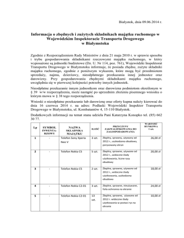 Białystok, dnia 09.06.2014 r. Informacja o zbędnych i zużytych składnikach majątku ruchomego w Wojewódzkim Inspektoracie Transportu Drogowego w Białymstoku Zgodnie z Rozporządzeniem Rady Ministrów z dnia 21 maja 2010 r. w sprawie sposobu i trybu gospodarowania składnikami rzeczowymi majątku ruchomego, w który wyposażone są jednostki budżetowe (Dz. U. Nr 114, poz. 761), Wojewódzki Inspektorat Transportu Drogowego w Białymstoku informuje, że posiada zbędne, zużyte składniki majątku ruchomego, zgodnie z poniższym wykazem, które mogą być przedmiotem sprzedaży, najmu, dzierżawy, nieodpłatnego przekazania innej jednostce oraz darowizny. Przy gospodarowaniu zbędnymi składnikami majątku ruchomego, uwzględnia się w pierwszej kolejności potrzeby innych jednostek. Nieodpłatne przekazanie innym jednostkom oraz darowizna podmiotom określonym w § 39 w/w rozporządzenia, może nastąpić po uprzednim złożeniu pisemnego wniosku o którym mowa w § 38 tego rozporządzenia. Wnioski o nieodpłatne przekazanie lub darowiznę oraz oferty kupna należy kierować do dnia 16 czerwca 2014 r. na adres: Podlaski Wojewódzki Inspektor Transportu Drogowego w Białymstoku, ul. Kombatantów 4, 15-110 Białystok. Dodatkowych informacji na temat stanu udziela Pani Katarzyna Konopko tel. (85) 662 30 77. Lp SYMBOL NAZWA INWENTARZOWY SKŁADNIKA ILOŚĆ MAJĄTKU PRZYCZYNY ZAKWALIFIKOWANIA DO ZAGOSPODAROWANIA WARTOŚĆ RYNKOWA 1 szt. 1 - Telefon Sony Xperia Neo V 3 szt. Zbędny, sprawny, używany od 2012 r., uszkodzona obudowa, porysowany ekran 26,00 zł 2 - Telefon Nokia C5 5 szt. Zbędny, sprawne, używane od 2012 r., widoczne ślady użytkowania, liczne rysy obudowy 20,00 zł 3 - Telefon Nokia C5 2 szt. Zbędne, sprawne, używane od 2012 r., widoczne ślady użytkowania, uszkodzona obudowa 18,00 zł 4 - Telefon Nokia C2-01 3 szt. Zbędne, sprawne, nieużywane, folia ochronna na ekranie 24,00 zł 5 - Telefon Nokia C2-01 13 szt. Zbędne, sprawne, używane od 2012 r. widoczne ślady użytkowania w postaci rys na ekranie 10,00 zł 6 - Telefon Nokia C2-01 9 szt. Zbędne, sprawne, używane od 2014 r., uszkodzona obudowa 8,00 zł 7 - Telefon Nokia C2-01 2 szt. Zbędne, sprawne, używane od 2012 r., do wymiany obudowa, uszkodzone gniazdo ładowania 5,00 zł 8 - Samsung Solid B2100 4 szt. Zbędne, sprawne, używane od 2010 r., do wymiany obudowa 5,00 zł 9 WITD/25/12 8A/03 Skaner Canon CanoScan LiDE 20 1 szt. Zbędny, sprawny, przestarzały technicznie 8,00 zł 10 WITD-PST491-2/10 Komputer stacjonarny 1 szt. Zbędny, sprawny, wyposażony w system Windows XP oraz Pakiet Office 2007 90,00 zł