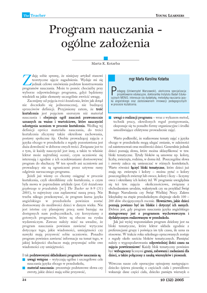 The Teacher YOUNG LEARNERS Program nauczania ogólne założenia Marta K. Kotarba Z dajê sobie sprawê, ¿e niniejszy artyku³ stanowi teoretyczne ujêcie zagadnienia. Wydaje mi siê jednak celowe omówienia podstaw konstruowania programów nauczania. Mo¿e to pomóc chocia¿by przy wyborze odpowiedniego programu, gdy¿ bêdziemy wiedzieli na jakie elementy szczególnie zwróciæ uwagê. Zacznijmy od pojêcia treœci kszta³cenia, które jak dot¹d nie doczeka³o siê jednoznacznej, nie budz¹cej sprzeciwów definicji. Przyjmiemy zatem, ¿e treœæ kszta³cenia jest pojêciem szerszym ni¿ materia³ nauczania i obejmuje ogó³ znaczeñ prawomocnie uznanych za wa¿ne i wartoœciowe, które nauczyciel udostêpnia uczniom w procesie kszta³cenia. Wed³ug tej definicji oprócz materia³u nauczania, do treœci kszta³cenia zliczymy tak¿e okreœlone zachowania, postawy spo³eczne itp. Osobie prowadz¹cej zajêcia z jêzyka obcego w przedszkolu z regu³y pozostawiona jest du¿a dowolnoœæ w doborze owych treœci. Zwi¹zane jest to z tym, i¿ ka¿dy nauczyciel jest inny, a tak¿e to w³aœnie lektor mo¿e najtrafniej oceniæ, czym uczniowie siê interesuj¹ i zgodnie z ich oczekiwaniami dostosowywaæ program do s³uchaczy. W ten sposób ani uczniowie ani prowadz¹cy nie s¹ ograniczeni przez sztywne ramy odgórnie narzuconego programu. Je¿eli ju¿ wiemy co chcemy osi¹gn¹æ w procesie kszta³cenia, czyli okreœliliœmy cele kszta³cenia, o czym by³a mowa w poprzednim artykule (por. Cele kszta³cenia jêzykowego w przedszkolu [w:] The Teacher nr 8-9 (31) 2005), to najwy¿szy czas zaplanowaæ nasz¹ pracê. Nie trzeba nikogo przekonywaæ, ¿e program kursu jêzyka angielskiego w przedszkolu powinien zostaæ dostosowany do mo¿liwoœci dzieci w danym wieku. Nie jest istotne czy planujemy pracê sami bazuj¹c na dostêpnych nam podrêcznikach, czy korzystamy z gotowych programów, które s¹ obecne na rynku wydawniczym. Zawsze nale¿y mieæ na uwadze, ¿e program nauczania powinien zawieraæ wytyczne dotycz¹ce tego, jakie wiadomoœci, umiejêtnoœci czy nawyki maj¹ przyswoiæ sobie uczniowie. Ponadto program powinien zawieraæ informacje na temat tego, w jakiej kolejnoœci s³uchacze maj¹ przyswajaæ sobie owe wiadomoœci czy umiejêtnoœci. I tak podstawowymi sk³adnikami programów nauczania s¹: uwagi wstêpne – wytyczaj¹ ogólne i szczegó³owe cele nauczania jêzyka obcego w przedszkolu, materia³ nauczania: prezentuje podstawowe s³owa czy zwroty, jakie dzieci maj¹ sobie przyswoiæ, mgr Marta Karolina Kotarba P edagog (Uniwersytet Warszawski), ukończona specjalizacja: projektowanie edukacyjne, doktorantka Instytutu Badań Edukacyjnych MENiS; interesuje się dydaktyką, metodyką nauczania języka angielskiego oraz zastosowaniem innowacji pedagogicznych w procesie kształcenia. uwagi o realizacji programu – wraz z wykazem metod, technik pracy, okreœlonych regu³ postêpowania, eksponuje siê tu ponadto formy organizacyjne i œrodki umo¿liwiaj¹ce efektywne prowadzenie zajêæ. Warto podkreœliæ, ¿e realizowane tematy zajêæ z jêzyka obcego w przedszkolu mog¹ ulegaæ zmianie, w zale¿noœci od zainteresowañ oraz mo¿liwoœci dzieci. Generalnie jednak dzieci poznaj¹ s³owa, które mo¿na sklasyfikowaæ w tzw. bloki tematyczne. Tytu³y bloków s¹ umowne np. kolory, liczby, zwierzêta, rodzina, w domu itd. Poszczególne s³owa i zwroty zaleca siê umieszczaæ w ró¿nych kontekstach. Warto równie¿ ³¹czyæ bloki tematyczne, które dzieci ju¿ znaj¹ np. zwierzêta i kolory – mo¿na pytaæ o kolory poszczególnych zwierz¹t lub owoce, kolory i liczy – liczymy owce i okreœlamy ich kolory itd. W programie uwzglêdnia siê te¿ tzw. zajêcia okolicznoœciowe, zwi¹zane z obchodzeniem urodzin, walentynek czy na przyk³ad Œwi¹t Bo¿ego Narodzenia czy Œwi¹t Wielkiej Nocy. Zakres leksykalny na etapie przedszkolnym obejmuje oko³o 100 – 200 s³ów obcojêzycznych rocznie. S³ownictwo, jakie dzieci poznaj¹ powinno byæ im bliskie i dotyczyæ ich samych. Dobrze jest, gdy program nauczania jêzyka angielskiego zintegrowany jest z programem wychowawczym i dydaktycznym realizowanym w przedszkolu. Jak ju¿ wy¿ej wspomnia³am program dzielony jest na bloki tematyczne, które lektor uk³ada zgodnie z preferencjami grupy i poœwiêca im tyle czasu, ile uzna za stosowne. W trakcie roku szkolnego opracowanych zostaje z regu³y oko³o szeœciu bloków tematycznych. Pamiêtaæ nale¿y o wygospodarowaniu odpowiedniej iloœci czasu na zajêcia powtórzeniowe! Ka¿dy blok tematyczny powinien byæ wzbogacany licznymi grami, zabawami i zadaniami dla dzieci, a tak¿e po³¹czony z nauk¹ wierszyków i piosenek. 24 Wówczas nasze cele operacyjne opisujemy nastêpuj¹co: dziecko œpiewa piosenkê o czêœciach cia³a i prawid³owo wskazuje dane czêœci cia³a, dziecko pamiêta wierszyk o 10 (32) 2005 The Teacher YOUNG LEARNERS kolorach itd. Ze starszymi grupami mo¿na realizowaæ tematy bardziej szczegó³owe np. W ³azience, Na wycieczce itp. Mo¿emy wówczas nadbudowaæ znane dzieciom s³owa z danego bloku tematycznego o kolejne, trudniejsze, o wy¿szym stopniu z³o¿onoœci. W trakcie zajêæ lektorzy powinni zapewniaæ dzieciom maksimum kontaktu z jêzykiem angielskim poprzez stosownie: clasroom language oraz social languag. Przyk³ady bloków tematycznych operacjonalizacji celów kszta³cenia: wraz z prób¹ Zwierzêta Dziecko potrafi pytaæ o ró¿ne przedmioty w jêzyku obcym stosuj¹c proste konstrukcje (zdanie pytaj¹ce) – what is this? Dziecko potrafi udzieliæ odpowiedzi w jêzyku obcym na pytanie What is it? Zaczynaj¹c wypowiedŸ od This is... Dziecko prawid³owo wskazuje dane zwierzê domowe lub dzikie na obrazku na polecenie nauczyciela wydane w jêzyku obcym Dziecko potrafi w jêzyku obcym podaæ nazwy zwierz¹t domowych i dzikich widzianych na obrazkach Dziecko pamiêta nazwy zwierz¹t domowych i dzikich w jêzyku obcym i samodzielnie je stosuje Liczby Dziecko potraf