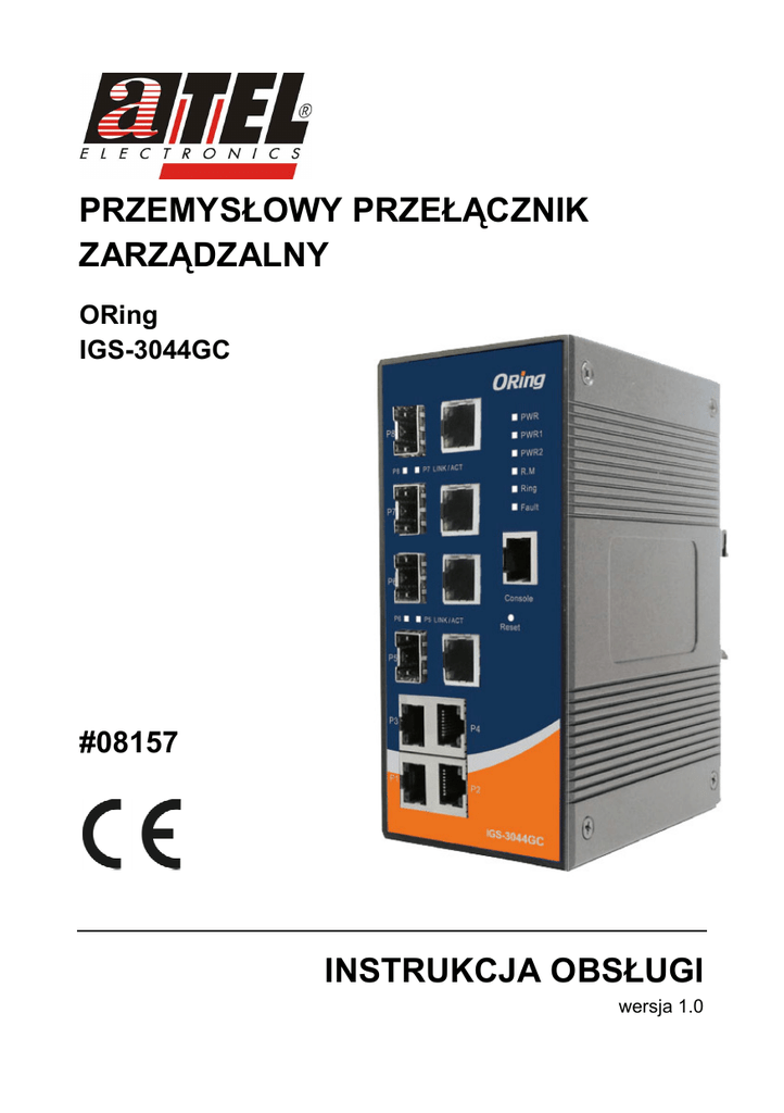 PRZEMYSŁOWY PRZEŁĄCZNIK ZARZĄDZALNY ORing IGS-3044GC #08157 Nie moŜna wy świetlić obrazu. Na k omputerze moŜe brak ować pamięci do otwarcia obrazu lub obraz moŜe by ć uszk odzony . Uruchom ponownie k omputer, a następnie otwórz plik ponownie. Jeśli czerwony znak x nadal będzie wy świetlany , k onieczne moŜe by ć usunięcie obrazu, a następnie ponowne wstawienie go. INSTRUKCJA NSTRUKCJA OBSŁUGI wersja 1.0 IGS-3044GC SPIS TREŚCI Wstęp ....................................................................................................................... 3 Właściwości .............................................................................................................. 3 Bezpieczeństwo uŜytkowania ................................................................................... 3 1. Zawartość opakowania ......................................................................................... 4 2. Zasady bezpieczeństwa........................................................................................ 4 3. Budowa urządzenia .............................................................................................. 5 3.1 Zasilanie .......................................................................................................... 5 3.2 Panele urządzenia ........................................................................................... 5 3.3 Diody LED ....................................................................................................... 6 4. Instalacja............................................................................................................... 7 4.1 MontaŜ na szynie ............................................................................................. 7 4.2 MontaŜ na ścianie ............................................................................................ 7 4.3 Podłączenie urządzenia................................................................................... 8 5. Konfiguracjia ......................................................................................................... 8 6. Opcjie zarządzania ............................................................................................... 8 7. Konserwacja ......................................................................................................... 8 8. Składowanie zuŜytego sprzętu ........................................................................... 10 9. Parametry techniczne ......................................................................................... 11 2 IGS-3044GC Wstęp Seria przełączników niezarządzanych IGS-3044GS została stworzona do zastosowania w przemysłowych sieciach Ethernet, a zwłaszcza do urządzeń pracujących w cięŜkich warunkach, toleruje szeroki zakres temperatur, zawiera ochronę przepięciową. Urządzenia umoŜliwiają ciągłą pracę dzięki moŜliwości podłączenia 2 niezaleŜnych źródeł zasilania. Szybki przepływ informacji o awarii pozwala zdiagnozować i naprawić usterkę, Przełączniki z serii IGS-3044GS to najlepszy wybór do pracy np. w fabrykach, telekomunikacji, transporcie i tam gdzie potrzebna jest najwyŜsza ochrona danych wraŜliwych, które wymagają niezawodnego i bezpiecznego połączenia Ethernet. Właściwości Praca w 4x10/100/10000Base-T(X) i 4xporty Gigabit Przystosowany do montaŜu na szynie lub ścianie; Technologia redundantne Open-Ring SNMP v1/v2c/v3, serwer http, telnet- obsługa serwera Powiadomienia przez Syslog, e-mail i pułapek SNMP Wsparcie dla protokołu STP, RSTP, MSTP, Wsparcie dla klienta PTP – synchronizacja zegara, IGNP filtrowanie i zarządzanie grupami multicastowymi RMON – monitorowanie ruchu 8 gigabitowych portów Autoryzacja po adresach MAC Konfiguracja przez Web-based i narzędzi Windows(Open-Vision) Praca w temperaturze -40÷70°C; Podwójne wejście zasilania DC; Obudowa spełnia wymagania standardu ochrony IP-30. Obsługa protokołu LLDP Obsługa DDM diagnostyka urządzenia Bezpieczeństwo uŜytkowania Urządzenie zostało zaprojektowane i wyprodukowane z najwyŜszą starannością o bezpieczeństwo osób instalujących i uŜytkujących. Dla zapewnienia bezpieczeństwa pracy, naleŜy stosować się do wszelkich wskazań zawartych w tej instrukcji jak i instrukcjach obsługi urządzeń towarzyszących (np. komputera PC). Przed przystąpieniem do instalacji urządzenia naleŜy dokładnie przeczytać całość tej instrukcji, w szczególności zaś punkty poświęcone bezpieczeństwu. NaleŜy zapewnić bezpieczne warunki pracy urządzenia (np. uŜywać tylko ekranowanych przewodów do połączenia z komputerem lub innym urządzeniem peryferyjnym). Dokonanie przez uŜytkownika jakichkolwiek własnych zmian w urządzeniu moŜe spowodować utratę moŜliwości jego legalnego uŜytkowania. 3 IGS-3044GC Urządzenie zostało poddane obowiązkowej ocenie zgodności i spełnia zasadnicze wymagania zawarte w europejskich Dyrektywach Nowego Podejścia. Produkt jest oznakowany znakiem CE. 1. Zawartość opakowania przełącznik IGS-3044GC zestaw montaŜowy, płyta CD, skrócona instrukcja obsługi w języku angielskim, niniejsza instrukcja obsługi. Podczas dostawy naleŜy upewnić się, Ŝe opakowanie nie jest uszkodzone. W przypadku stwierdzonych uszkodzeń naleŜy niezwłocznie skontaktować się z dostawcą. Prosimy równieŜ o sprawdzenie zgodności zawartości opakowania z powyŜej zamieszczoną listą. 2. Zasady bezpieczeństwa Urządzenie jest zgodne z przepisami w zakresie bezpieczeństwa uŜytkowania urządzeń elektrycznych. NaleŜy przestrzegać następujących zaleceń: − − − − − − − − − gniazdo sieciowe musi być uziemione zgodnie z obowiązującymi przepisami, przed przeniesieniem lub wykonywaniem innych operacji technicznych urządzenie naleŜy odłączyć od zasilania, nie stosować uszkodzonych lub zuŜytych przewodów zasilania, gdyŜ powodują one znaczne za