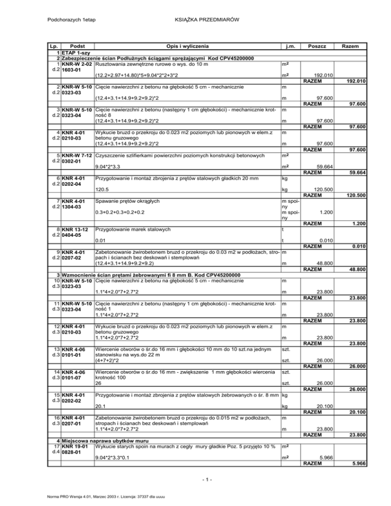 Podchorazych 1etap Lp. 1 2 1 d.2 KSIĄŻKA PRZEDMIARÓW Podst Opis i wyliczenia ETAP 1-szy Zabezpieczenie ścian Podłużnych ściągami sprężającymi Kod CPV45200000 KNR-W 2-02 Rusztowania zewnętrzne rurowe o wys. do 10 m 1603-01 (12.2+2.97+14.80)*5+9.04*2*2+3*2 j.m. m2 m 3 KNR-W 5-10 Cięcie nawierzchni z betonu (następny 1 cm głębokości) - mechanicznie krotd.2 0323-04 ność 8 (12.4+3.1+14.9+9.2+9.2)*2 m 4 KNR 4-01 d.2 0210-03 m m m m 5 KNR-W 7-12 Czyszczenie szlifierkami powierzchni poziomych konstrukcji betonowych d.2 0302-01 9.04*2*3.3 m2 6 KNR 4-01 d.2 0202-04 Przygotowanie i montaż zbrojenia z prętów stalowych gładkich 20 mm kg 120.5 kg Spawanie prętów okrągłych m spoiny m spoiny 7 KNR 4-01 d.2 1304-03 0.3+0.2+0.3+0.2+0.2 8 KNR 13-12 d.2 0404-05 9 KNR 4-01 d.2 0207-02 m2 Przygotowanie marek stalowych t 0.01 t Zabetonowanie żwirobetonem bruzd o przekroju do 0.03 m2 w podłożach, stro- m pach i ścianach bez deskowań i stemplowań (12.4+3.1+14.9+9.2+9.2) m 3 Wzmocnienie ścian prętami żebrowanymi fi 8 mm B. Kod CPV45200000 10 KNR-W 5-10 Cięcie nawierzchni z betonu na głębokość 5 cm - mechanicznie d.3 0323-03 1.1*4+2.0*7+2.7*2 m m 12 KNR 4-01 d.3 0210-03 Wykucie bruzd o przekroju do 0.023 m2 poziomych lub pionowych w elem.z betonu gruzowego 1.1*4+2.0*7+2.7*2 m Wiercenie otworów o śr.do 16 mm i głębokości 10 mm do 10 szt.na jednym stanowisku na wys.do 22 m (4+7+2)*2 szt. Wiercenie otworów o śr.do 16 mm - zwiększenie 1 mm głębokości wiercenia krotność 100 26 szt. 14 KNR 4-06 d.3 0101-07 15 KNR 4-01 d.3 0202-02 16 KNR 4-01 d.3 0207-01 192.010 RAZEM 192.010 97.600 RAZEM 97.600 97.600 RAZEM 97.600 97.600 RAZEM 97.600 59.664 RAZEM 59.664 120.500 RAZEM 120.500 1.200 RAZEM 1.200 0.010 RAZEM 0.010 48.800 RAZEM 48.800 23.800 RAZEM 23.800 23.800 RAZEM 23.800 23.800 RAZEM 23.800 26.000 RAZEM 26.000 26.000 RAZEM 26.000 20.100 RAZEM 20.100 23.800 RAZEM 23.800 5.966 RAZEM 5.966 m 11 KNR-W 5-10 Cięcie nawierzchni z betonu (następny 1 cm głębokości) - mechanicznie krotd.3 0323-04 ność 1 1.1*4+2.0*7+2.7*2 13 KNR 4-06 d.3 0101-01 Razem m2 2 KNR-W 5-10 Cięcie nawierzchni z betonu na głębokość 5 cm - mechanicznie d.2 0323-03 (12.4+3.1+14.9+9.2+9.2)*2 Wykucie bruzd o przekroju do 0.023 m2 poziomych lub pionowych w elem.z betonu gruzowego (12.4+3.1+14.9+9.2+9.2)*2 Poszcz m m szt. szt. Przygotowanie i montaż zbrojenia z prętów stalowych żebrowanych o śr. 8 mm kg 20.1 kg Zabetonowanie żwirobetonem bruzd o przekroju do 0.015 m2 w podłożach, stropach i ścianach bez deskowań i stemplowań 1.1*4+2.0*7+2.7*2 m 4 Miejscowa naprawa ubytków muru 17 KNR 19-01 Wykucie starych spoin na murach z cegły mury gładkie Poz. 5 przyjęto 10 % d.4 0828-01 9.04*2*3.3*0.1 -1- Norma PRO Wersja 4.01, Marzec 2003 r. Licencja: 37337 dla uuuu m m2 m2 Podchorazych 1etap Lp. Podst 18 KNR 19-01 d.4 0310-02 KSIĄŻKA PRZEDMIARÓW Opis i wyliczenia j.m. Uzupełnienie i naprawa ścian z cegły budowlanej o pow. do 3 m2 o gr. 1/2 ceg- m2 ły na zaprawie cementowo-wapiennej. Analogia Poz.17 9.04*2*3.3*0.1 m2 5 Kanalizacja Deszczowa CPV 45232130-2 19 KNR 4-04 Rozebranie podłoża z betonu żwirowego o grub. do 5 cm d.5 0301-01 (3.0*13.92+(12.2+2.97)*0.5+6.2*0.5)*0.05 20 KNNR 1 d.5 0210-02 21 KNNR 1 d.5 0307-03 22 KNNR 4 d.5 1411-02 23 KNR 2-01 d.5 0320-01 24 KNNR 1 d.5 0214-01 25 KNNR 1 d.5 0206-04 26 KNNR 1 d.5 0208-02 27 KNNR 4 d.5 1308-02 28 KNNR 4 d.5 1308-03 29 KNNR 4 d.5 1424-01 30 KNR 2-31 d.5 0606-01 31 KNNR 4 d.5 1413-03 32 KNNR 4 d.5 1321-03 33 KNNR 4 d.5 1321-02 34 KNNR 4 d.5 1321-03 35 KNNR 4 d.5 0215-01 m3 m3 Wykopy liniowe o szerokości 0,8-2,5 m i głębokości do 3,0 m o ścianach pionowych w gruntach suchych kat. I-II (1.2*1.2*3.14)*3.45 m3 Podłoża pod kanały i obiekty z materiałów sypkich grub. 15 cm m3 (1.1+5.0+7.6+4.8+13.6+2.5+0.6*0.6*3.14)*0.15 m3 Obsypka ręczna rurociągów piaskiem drobnym do wysokości 30 cm ponad wierzch wraz z kosztami zakupu (1.1+5.0+7.6+4.8+13.6)*0.3 m3 m3 m3 m3 Zasypanie wykopów .fund.podłużnych,punktowych,rowów,wykopów obiektom3 wych spycharkami z zagęszcz.mechanicznym spycharkami (gr.warstwy w stanie luźnym 30 cm) - kat.gr. I-II (1.1+5.0+7.6+4.8+13.6+2.5)*0.55+(0.6*0.6*3.14)*3.0 m3 Odwóz gruzu i nadmiaru gruntu i transp.urobku na odl. 1 km sam.samowyład. m3 ( studnia obsypki rur ) (34.6+16.891)-(22.421+5.36+9.63+0.6*0.6*3.14*3)+2.62 m3 Dodatek za każdy rozp. 1 km transportu ziemi samochodami samowyładowczymi po drogach o nawierzchni utwardzonej(kat.gr. I-IV) Krotność 9 13.309 m3 Kanały z rur PVC łączonych na wcisk o śr. zewn. 160 mm m (1.1+5.0+7.6+4.8+2.5) m Kanały z rur PVC łączonych na wcisk o śr. zewn. 200 mm m 13 m Wpust deszczowy z rusztem o śr.500 mm szt. 1 szt. Ścieki z pref.betonowych o grub. 15 cm na podsypce piaskowej m 2.5 m Studnia chłonna z kręgów betonowych o śr. 1200 mm w gotowym wykopie o głębok. 3m 1 stud. Trójnik kanalizacyjny PVC o śr. zewn. 200/160 mm szt 2 szt Tuleja ochronna PVC śr. zewn. 160 mm szt 2 szt Tuleja ochronna PVC o śr. zewn. 200 mm szt 2 szt Montaż rur deszczowych żeliwnych o śr. 150 mm szt. 4 szt. Norma PRO Wersja 4.01, Marzec 2003 r. Licencja: 37337 dla uuuu Razem 5.966 RAZEM 5.966 2.622 RAZEM 2.622 34.600 RAZEM 34.600 15.600 RAZEM 15.600 5.360 RAZEM 5.360 9.630 RAZEM 9.630 22.421 RAZEM 22.421 13.309 RAZEM 13.309 13.309 RAZEM 13.309 21.000 RAZEM 21.000 13.000 RAZEM 13.000 1.000 RAZEM 1.000 2.500 RAZEM 2.500 1.000 RAZEM 1.000 2.000 RAZEM 2.000 2.000 RAZEM 2.000 2.000 RAZEM 2.000 4.000 RAZEM 4.000 m3 Wykopy oraz przekopy o głęb.do 3.0 m wyk.na odkład koparkami podsiębiernymi o poj.łyżki 0.25 - 0.60 m3 w gr.kat. I-II (1.1+5.0+7.6+4.8+13.6+2.5)*1.0 -2- Poszcz m3 stud. Podchorazych 1etap Lp. Podst 36 KNNR 4 d.5 0220-04 37 KNR 4-01 d.5 0213-01 38 KNR 2-25 d.5 0407-01 39 KNR 2-25 d.5 0407-02 40 KNR 2-25 d.5 0407-03 KSIĄŻKA PRZEDMIARÓW Opis i wyliczenia Czyszczaki żeliwne kanalizacyjne o śr. 150 mm j.m. szt. 4 szt. Wykonanie opaski betonowej o szer. 50 c