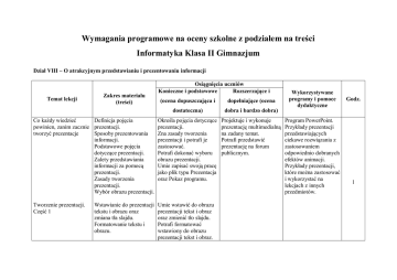 Wymagania programowe na oceny szkolne z podziałem na treści Informatyka Klasa II Gimnazjum Dział VIII – O atrakcyjnym przedstawianiu i prezentowaniu informacji Temat lekcji Zakres materiału (treści) Osiągnięcia uczniów Konieczne i podstawowe Rozszerzające i (ocena dopuszczająca i dopełniające (ocena dostateczna) dobra i bardzo dobra) Co każdy wiedzieć Definicja pojęcia powinien, zanim zacznie prezentacji. tworzyć prezentacje Sposoby prezentowania informacji. Podstawowe pojęcia dotyczące prezentacji. Zalety przedstawiania informacji za pomocą prezentacji. Zasady tworzenia prezentacji. Wybór obrazu prezentacji. Określa pojęcia dotyczące prezentacji. Zna zasady tworzenia prezentacji i potrafi je zastosować. Potrafi dokonać wyboru obrazu prezentacji. Umie zapisać swoją pracę jako plik typu Prezentacja oraz Pokaz programu. Projektuje i wykonuje prezentację multimedialną na zadany temat. Potrafi przedstawić prezentację na forum publicznym. Tworzenie prezentacji. Część 1 Umie wstawić do obrazu prezentacji tekst i obraz oraz zmienić tło slajdu. Potrafi formatować wstawiony do obrazu prezentacji tekst i obraz. Wstawianie do prezentacji tekstu i obrazu oraz zmiana tła slajdu. Formatowanie tekstu i obrazu. Wykorzystywane programy i pomoce dydaktyczne Program PowerPoint. Przykłady prezentacji przedstawiających ciekawe rozwiązania z zastosowaniem odpowiednio dobranych efektów animacji. Przykłady prezentacji, które można zastosować i wykorzystać na lekcjach z innych przedmiotów. Godz. 1 Tworzenie prezentacji. Część 2 Zastosowania animacji do elementów obrazu prezentacji. Wprowadzanie wykresu i jego formatowanie. Potrafi dodać animację do slajdów. Wie, jak wstawić wykres do obrazu prezentacji i jak go formatować. Potrafi dodać, usunąć lub zmienić slajd. Dodawanie, usuwanie i zmiana miejsca slajdu w prezentacji. Automatyczne przejścia slajdów w prezentacji. Prezentacja z zastosowaniem hiperłącza. Co każdy wiedzieć Korzyści z przedstawiania powinien, zanim zacznie informacji na stronach tworzyć własną stronę WWW. WWW Podstawowe pojęcia związane ze strukturą tworzonego dokumentu. Konstrukcja nagłówka dokumentu, głównej jego części. Język HTML – tworzenie stron WWW. Określa korzyści z przedstawiania informacji za pomocą stron WWW. Określa pojęcia związane ze strukturą tworzonego dokumentu (elementy, tagi i znaczniki). Potrafi konstruować nagłówek dokumentu (sekcja; Head, Title oraz Meta). Określa zasady tworzenia głównej części dokumentu (sekcja Body). Programuje pokaz w odpowiednim odstępie czasowym. Potrafi wykonać prezentację z wykorzystaniem hiperłącza między poszczególnymi jej obrazami. Potrafi wstawić na stronę plik dźwiękowy (bgsound src...). Potrafi wstawić na stronę plik wideo (bgsound src...). Projektuje stronę WWW na wskazany temat. 1 Program Notatnik. Program Internet Explorer. Przykłady ciekawych rozwiązań dotyczących właściwej budowy i konstrukcji stron WWW (własne propozycje oraz adresy internetowe). 1 Komendy języka HTML. Komendy zmieniające tło Część 1 dokumentu. Komendy formatujące wstawiony tekst. Komendy zmieniające marginesy. Komendy zmieniające położenie obiektu na stronie. Komendy budujące odsyłacze. Komendy zmieniające kolor odsyłaczy. Potrafi zmienić tło Umie zmienić kolor dokumentu (bgcolor, odsyłaczy (a link, v link). background). Potrafi wstawić i formatować tekst (font size, color, face, b, i, u...). Potrafi zmienić marginesy strony (left–right–top– bottommargin). Potrafi zmienić położenie obiektu na stronie (palign–center–left–right). Potrafi zbudować odsyłacze (a href...). Komendy języka HTML. Komendy animujące Część 2 obiekty. Komendy wstawiające linie. Komendy tworzące listy numerowane. Komendy tworzące listy wypunktowane. Wprowadzanie pliku dźwiękowego. Wprowadzanie pliku wideo. Umie animować obiekty (marquee...). Potrafi wstawić i formatować linie (hr size– color...). Potrafi wstawić i formatować listy numerowane (ol, li). Potrafi wstawić i formatować listy wypunktowane (ul, li). Komendy języka HTML. Komendy wstawiające Część 3 obraz. Komendy wstawiające Potrafi wstawić i formatować obraz (img src). 1 Potrafi wstawić plik dźwiękowy. Potrafi wstawić plik wideo. 1 1 tabele. Komendy języka HTML. Zasady i konstruowanie Część 4 dokumentów złożonych. Komendy języka HTML. Komendy tworzące Część 5 pływające ramki. Komendy tworzące formularze. Materiały multimedialne Nagrywanie dźwięku, –Rejestrator dźwięku odtwarzanie dźwięku, systemu Windows modyfikacja plików dźwiękowych, wstawianie plików dźwiękowych do dokumentów. Materiały multimedialne – program Windows Wybór klipów, Movie Maker wprowadzenie przejść i efektów wideo, wprowadzanie napisów, wprowadzanie pliku audio. Potrafi wstawić i formatować tabele (table, tr, td...). Umie zastosować hiperłącza bez budowy stron w tzw. układzie ramki. Potrafi wstawić do strony WWW podstawowe elementy wchodzące w skład formularza. Wie, jak konstruować dokumenty złożone – ramki (frameset, frame src...). Wie, jak stworzyć pływające ramki (i frame...). Wie, jak budować formularze (form, input, select name...). Potrafi nagrać i odtwarzać Potrafi miksować dźwięk przy pomocy dźwięki. programu. Potrafi wprowadzać do Umie dokonać pokazu plik dźwiękowy. modyfikacji dźwięku. Wie, jak wstawić plik dźwiękowy do różnych dokumentów. Potrafi wybrać i zaimportować do programu właściwe pliki graficzne. Potrafi wprowadzić i zastosować odpowiednie przejścia pomiędzy obrazami. Umie wprowadzić napisy początkowe i końcowe. Sprawdzenie poziomu opanowania przez uczniów wiadomości i umiejętności. 1 1 Rejestrator dźwięku systemu Windows. Program Windows Movie M aker.. Własne projekty plików wideo. Obrazy i fotografie do tworzenia plików wideo. 1 1 Dział IX – O tworzeniu i obróbc