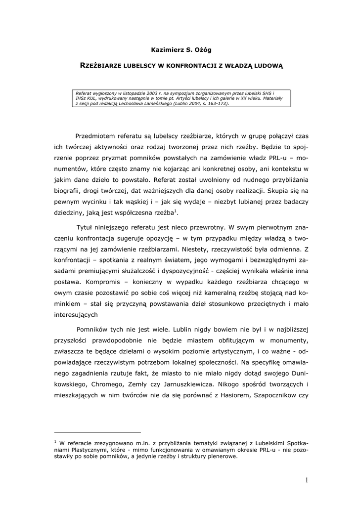 Kazimierz S. OŜóg RZEŹBIARZE LUBELSCY W KONFRONTACJI Z WŁADZĄ LUDOWĄ Referat wygłoszony w listopadzie 2003 r. na sympozjum zorganizowanym przez lubelski SHS i IHSz KUL, wydrukowany następnie w tomie pt. Artyści lubelscy i ich galerie w XX wieku. Materiały z sesji pod redakcją Lechosława Lameńskiego (Lublin 2004, s. 163-173). Przedmiotem referatu są lubelscy rzeźbiarze, których w grupę połączył czas ich twórczej aktywności oraz rodzaj tworzonej przez nich rzeźby. Będzie to spojrzenie poprzez pryzmat pomników powstałych na zamówienie władz PRL-u – monumentów, które często znamy nie kojarząc ani konkretnej osoby, ani kontekstu w jakim dane dzieło to powstało. Referat został uwolniony od nudnego przybliŜania biografii, drogi twórczej, dat waŜniejszych dla danej osoby realizacji. Skupia się na pewnym wycinku i tak wąskiej i – jak się wydaje – niezbyt lubianej przez badaczy dziedziny, jaką jest współczesna rzeźba1. Tytuł niniejszego referatu jest nieco przewrotny. W swym pierwotnym znaczeniu konfrontacja sugeruje opozycję – w tym przypadku między władzą a tworzącymi na jej zamówienie rzeźbiarzami. Niestety, rzeczywistość była odmienna. Z konfrontacji – spotkania z realnym światem, jego wymogami i bezwzględnymi zasadami premiującymi słuŜalczość i dyspozycyjność - częściej wynikała właśnie inna postawa. Kompromis – konieczny w wypadku kaŜdego rzeźbiarza chcącego w owym czasie pozostawić po sobie coś więcej niŜ kameralną rzeźbę stojącą nad kominkiem – stał się przyczyną powstawania dzieł stosunkowo przeciętnych i mało interesujących Pomników tych nie jest wiele. Lublin nigdy bowiem nie był i w najbliŜszej przyszłości prawdopodobnie nie będzie miastem obfitującym w monumenty, zwłaszcza te będące dziełami o wysokim poziomie artystycznym, i co waŜne - odpowiadające rzeczywistym potrzebom lokalnej społeczności. Na specyfikę omawianego zagadnienia rzutuje fakt, Ŝe miasto to nie miało nigdy dotąd swojego Dunikowskiego, Chromego, Zemły czy Jarnuszkiewicza. Nikogo spośród tworzących i mieszkających w nim twórców nie da się porównać z Hasiorem, Szapocznikow czy 1 W referacie zrezygnowano m.in. z przybliŜania tematyki związanej z Lubelskimi Spotkaniami Plastycznymi, które - mimo funkcjonowania w omawianym okresie PRL-u - nie pozostawiły po sobie pomników, a jedynie rzeźby i struktury plenerowe. 1 Abakanowicz. Środowisko rzeźbiarzy było przez cały ten okres (i zresztą jest nadal) nieliczne, zaś w skali Polski praktycznie nieznane2. Jak juŜ zostało zauwaŜone wcześniej – relacja między władzą a rzeźbiarzem jest najlepiej widoczna w rzeźbie pomnikowej. Rzeźba pomnikowa, bardziej niŜ architektura i malarstwo była, jest i będzie tubą propagandową3. Warto więc na początek pokrótce przypomnieć sobie znaczenie i specyfikę pomnika; zwłaszcza tę dotyczącą relacji wiąŜących go z zamawiającym, władzą, jak równieŜ wpływem otoczenia historycznego i aktualnej otoczki kulturowej na jego kształt i wydźwięk. Pomnik – struktura architektoniczno – rzeźbiarska – jest organizmem przechowującym pamięć – o zdarzeniu bądź postaci historycznej waŜnej dla konkretnej społecznością bądź grupy społecznej4. Będąc przypomnieniem jednocześnie jest napomnieniem - swoistym drogowskazem, „wyznaniem wiary” społeczeństwa w danej chwili. Jego przeznaczeniem jest trwanie, niezmienność – dla której konieczna jest „szczerość ideowa” pomnika. W fałszu i zakłamaniu – mogącym przejawiać się zarówno w postaci skrajnej (pomniki tyranów – np. Hitlera czy Stalina), jak i łagodniejszej (pomniki upamiętniające zdarzenia „premiowane” przez aktualny system propagandy) – naleŜy szukać przyczyn ich spadania z cokołów. Zniszczenie (np. przez okupanta) pomnika waŜnego dla lokalnej społeczności na pewno spotka się ze sprzeciwem – nawet pomimo surowych restrykcji5. Odwrotnie jest w przypadku pomników społecznie obojętnych – nie niosących dla oglądających je mieszkańców Ŝadnych waŜnych treści. W powszechnym odbiorze funkcjonują jako rzeźby plenerowe – lepsze bądź gorsze, ale wyłącznie ozdobniki skwerów, placów. Stąd dla prawidłowego funkcjonowania w powszechnej świadomości waŜna jest droga i sposób, w jaki pomnik powstaje. Skąd bierze się pomysł jego wystawienia, do kogo i jak zostało skierowane zamówienia, jaka otoczka towarzyszyła całemu przedsięwzięciu? Sławomir Mieleszko, Jerzy Kierski, Tadeusz Skwarczyński i Witold Marcewicz łączą się w luźną grupę. Czynnikiem integrującym jest ich twórczość - zlokalizowana na terenie miasta Lublina rzeźba monumentalna oraz zamieszkiwanie samych 2 Tadeusz Palacz, Ośrodek rzeźbiarski i plenery orońskie, „Rzeźba Polska”, 1987, s. 176-201. W omawianym przez autora okresie czasu Orońsko odwiedziło 236 rzeźbiarzy z Polski, z czego jedynie cztery osoby z Lublina. 3 Por. Andrzej Jakimowicz, Polska rzeźba współczesna, Warszawa 1956, s. 14. Hanna Kozłowska – Bareja, Polska rzeźba współczesna, Warszawa 1974, s. 14. Irena Grzesiuk – Olszewska, Polska rzeźba pomnikowa w latach 1945 – 1995, Warszawa 1995, s. 11-12. 4 I. Grzesiuk – Olszewska, dz. cyt. 5 Roman Peske, Tu bije serce miasta. Pomnik Niepodległości w Pabianicach 1928 – 1998, Pabianice 1999, s. 49. 2 rzeźbiarzy w mieście bądź jego bezpośrednich okolicach – w kaŜdym razie ich bezpośredni związek z Lublinem. To tłumaczy dlaczego w skład omawianego zespołu wchodzi pochodzący z Bydgoszczy Kierski, czy teŜ mieszkający w BełŜycach Witold Marcewicz. Pomimo 45 lat istnienia PRL-u referat ten czasowo obejmuje jedynie dwie ostatnie dekady - do końca lat 60-tych środowisko rzeźbiarzy lubelskich było na polu rzeźby monumentalnej niemal całkowicie bierne. Świadectwem tego jest choćby efekt konkursu na Łuk Wyzwolenia z roku 1954. Na zakoń