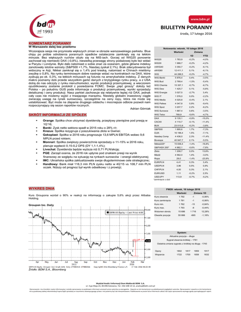BIULETYN PORANNY środa, 17 lutego 2016 KOMENTARZ PORANNY W Warszawie dalej bez przełomu Wczorajsza sesja nie przyniosła większych zmian w obrazie warszawskiego parkietu. Blue chipy po próbie odrobienia porannych spadków ostatecznie zamknęły się na lekkim minusie. Bez większych ruchów obyło się na MiS-iach. Gorzej od WIG20 ponownie zachował się niemiecki DAX (-0,8%), niewielką przewagę strony podażowej było też widać w Paryżu i Londynie. Byki dało natomiast o sobie znać za oceanem, gdzie główne indeksy zanotowały istotne wzrosty (S&P500 +1,7%, Nasdaq zyskał 2,1%). Brak zdecydowania był widoczny w Azji, Nikkei zamknął się o 1,4% pod kreską, natomiast w Chinach mieliśmy zwyżkę o 0,8%. Na rynku terminowym dobre nastroje widać na kontraktach na DAX, które zyskują po ok. 0,3%, na lekkich minusach są futures na amerykańskie indeksy. Z danych makro poznamy dziś przede wszystkim garść danych z brytyjskiego rynku pracy, a z USA dotrą do nas odczyty z rynku nieruchomości, wyniki produkcji przemysłowej, a wieczorem opublikowany zostanie protokół z posiedzenia FOMC. Swoje „pięć groszy” dołoży też Polska – po południu GUS poda informacje o produkcji przemysłowej, wyniki sprzedaży detalicznej i ceny produkcji. Nasz parkiet zachowuje się relatywnie lepiej niż DAX, jednak cały czas nie możemy wyjść z trwającego marazmu. Niestety globalni inwestorzy ciągle zwracają uwagę na rynek surowcowy, szczególnie na ceny ropy, która nie może się ustabilizować. Być może na złapanie drugiego oddechu i mocniejsze odbicie pozwoli nam rozpoczynający się sezon raportów rocznych. Adrian Górniak SKRÓT INFORMACJI ZE SPÓŁEK Orange: Spółka chce utrzymać dywidendę, przepływy pieniężne pod presją w 1Q’16; Banki: Zysk netto sektora spadł w 2015 roku o 28% r/r; Krezus: Spółka rezygnuje z poszukiwania złota w Gwinei; Gekoplast: Spółka w 2016 roku prognozuje 13,6 MPLN EBITDA wobec 9,6 MPLN przed rokiem; Monnari: Spółka zwiększy powierzchnie sprzedaży o 11-15% w 2016 roku, planuje wypłacić 0,15-0,2 DPS (DY 1,1-1,4%); Livechat: Dywidenda będzie wyższa niż 0,71 PLN/akcję; PGE: Zarząd ocenia, że 2016 rok upłynie pod znakiem presji na wynik finansowy ze względu na sytuację na rynkach surowców i energii elektrycznej; IMC: Ukraińska spółka zaktualizowała swoje długoterminowe cele strategiczne; Handlowy: Bank miał 118,3 mln PLN zysku netto w 4Q’15 vs 108,7 mln PLN oczek. Niższy od prognoz był wynik odsetkowy i z prowizji; Notowania: wtorek, 16 lutego 2016 Wartość Zmiana 1D YTD WIG20 1 783,9 -0,2% -4,0% WIG30 1 988,7 -0,2% -4,2% mWIG40 3 350,7 -0,2% -6,1% sWIG80 12 411,1 0,1% -6,1% WIG 44 288,5 -0,2% -4,7% WIG Banki 5 876,4 0,4% -3,5% WIG Bud 2 769,4 -1,5% -5,4% WIG Chemia 15 357,1 -0,7% -6,7% WIG Dew 1 425,7 0,1% -5,8% WIG Energia 3 027,5 -2,7% 3,4% WIG IT 1 576,0 0,0% -2,2% WIG Media 4 025,8 -0,4% 2,1% WIG Paliwa 4 047,8 0,9% -9,4% WIG Spoż 3 207,7 2,2% -6,2% WIG Surowce 1 887,4 0,6% -3,5% 769,9 -5,6% -4,7% 9 135,1 -0,8% -15,0% CAC40 4 110,7 -0,1% -11,4% BUX 23 013,9 -0,2% -3,8% S&P500 1 895,6 1,7% -7,3% DJIA 16 196,4 1,5% -7,1% Nasdaq Comp 4 436,0 2,3% -11,4% Bovespa 40 947,7 2,1% -5,5% Nikkei225* 15 836,4 -1,4% -16,8% S&P/ASX 200* 4 882,1 -0,6% -7,8% Złoto 1 208,7 0,0% 13,8% Miedź 4 562,0 1,4% -3,0% Ropa 29,0 -1,4% -23,9% EUR/PLN 4,41 0,3% 3,4% USD/PLN 3,96 0,5% 0,9% CHF/PLN 4,00 0,3% 2,1% EUR/USD 1,11 -0,2% 2,5% USD/JPY 113,9 -0,7% -5,2% WIG Telco DAX *zamknięcie z dziś WYKRES DNIA FW20: wtorek, 16 lutego 2016 Kurs Groupona wzrósł o 90% w reakcji na informację o zakupie 5,6% akcji przez Alibaba Holding. Groupon Inc. Daily Wartość Zmiana 1D Kurs otwarcia 1 792 -1 -0,06% Kurs zamknięcia 1 781 -1 -0,06% Kurs min. 1 762 -15 -0,84% Kurs max. 1 793 -8 -0,44% Wolumen obrotu 15 686 1 716 12,28% Otwarte pozycje 55 866 -665 -1,18% System: Aktualna pozycja – długa Sygnał otwarcia krótkiej – 1761 Ostatnia zmiana sygnału z krótkiej na długą - 1743 Opory 1802 1817 1859 1917 Wsparcia 1722 1700 1658 1632 Źródło: BDM S.A., Bloomberg Wydział Analiz i Informacji Dom Maklerski BDM S.A. ul. 3-go Maja 23, 40-096 Katowice, Tel.: 032 208 14 12, [email protected] Opracowanie ma charakter czysto informacyjny i zostało opracowany na podstawie informacji uznanych przez autorów za wiarygodne . Zawarte w nim komentarze są subiektywnymi poglądami autorów. Opracowanie i zawarte w nim komentarze nie są podstawą żadnej rekomendacji kupna bądź sprzedaży w rozumieniu obowiązującego prawa i nie powinny być tak interpretowane. Publikowanie w prasie lub w Internecie całości lub części opracowania wymaga zgody sporządzających raport. BIULETYN PORANNY środa, 17 lutego 2016 GPW PODSUMOWANIE FW20 (1,792.00, 1,793.00, 1,762.00, 1,781.00, -1.00000) Indeksy GPW: wtorek, 16 lutego 2016 2250 2200 2150 2100 2050 Open Low High Close WIG20 1 788,1 1 765,5 1 791,3 1 783,9 -0,2% 438 WIG30 1 995,1 1 969,9 1 996,4 1 988,7 -0,2% 469 mWIG40 3 365,7 12 324,3 12 432,8 3 350,7 -0,2% 73 sWIG80 12 421,0 3 331,8 3 369,6 12 411,1 0,1% 11 WIG-PL 44 909,1 44 909,1 45 213,3 45 213,3 -0,2% 521 WIG 44 437,7 43 971,1 44 468,3 44 288,5 -0,2% 527 2000 WIG20 Cena Mkt Cap Alior 59,45 1850 1800 1750 1700 YTD 4 322 -0,4% -10,6% Asseco PL 56,85 4 719 0,8% 0,1% BZ WBK 268,90 26 684 1,5% -5,3% CCC 124,00 4 762 -1,8% -10,5% Cyfrowy P. 21,87 13 987 -0,5% 4,7% Enea 11,30 4 988 -2,0% 0,0% Energa 13,85 5 735 -0,6% 9,6% Eurocash 54,46 7 562 1,8% 12,3% KGHM 60,84 12 168 0,9% -4,2% LPP 5 089,1 9 340 1,0% -8,4% mBANK 333,35 14 080 0,9% 6,2% Orange 6,03 7 914 -7,8% -8,1% Pekao 146,80 38 531 2,0% 2,3% PGE 13,82 25 840 -3,2% 8,1% PGNIG 5,05 29 795 -1,0% -1,8% PKN Orlen 58,91 25 196 1,7% -13,2% PKOBP 24,78 30 975 -1,2% -9,3% PZU 31,85 27 503 -1,1% -6,4% Synthos 3,92 5 187 2,1% 2,9% 2100 Tauron 2,67 4 679 -4,6% -7,3% 2050 mWIG40 Cena Mkt Cap Amica 160,70 Apator Azoty 1650 3 10 August 17 24 31 7 14 September 21 28 5 12 October 19 26 2 9 16 November 23 3