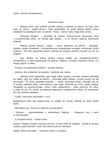 Autor: Kamila Chrapkiewicz „Samotny lisek” Madzia przez cały tydzień prosiła mamę o pójście na spacer do lasu, lecz było za zimno i padał deszcz. Tata powiedział, że jeżeli będzie ładnie przez weekend to pojadą do lasu na piknik. Teraz i mama i tata maja dużo pracy. Wstawaj Madziu! – obudziła ją mama. Dziewczynka otworzyła oczy i przypomniała sobie, że dzisiaj jest sobota , a za oknem piękna, słoneczna pogoda. Madzia szybko wstała z łóżka. – Hura! Jedziemy na piknik! – zawołała. Szybko zjadła śniadanie i zniecierpliwiona pospieszała swojego młodszego brata Kubusia. Do lasu pojechali autem, jednak na miejsce pikniku musieli już iść na nogach. Gdy dotarli na leśną polanę mama zajęła się rozpakowywaniem smakołyków, a tata zaczął grać na gitarze. Madzia z bratem zapytali mamę, czy mogą zagrać w piłkę. - Proszę, nie pójdziemy daleko – prosiła Madzia. - Dobrze. Ale zostańcie na polanie– zgodziła się mama. Zabawa była wspaniała, gdy nagle piłka wpadła w krzaki. Madzia pobiegła po piłkę i gdy już miała ją zabrać… usłyszała jakiś szelest i krzaki przed nią się poruszyły. Po cichu zawołała Kubusia i razem rozsunęli krzaki. Okazało się, że w środku siedział mały, wystraszony rudy lisek. Skomlał po cichu, jakby płakał. Wyglądał na opuszczonego. Dzieci stały zaskoczone i tylko patrzyły na liska, a lisek na nie. Po chwili, ku jeszcze większemu zaskoczeniu dzieci, lis przemówił do nich ludzkim głosem: - Cześć, nazywam się Rudek, a wy? Rodzeństwo było tak zaskoczone, że odjęło im mowę. Widząc to lisek mówił dalej: - Nie bójcie się. Chcę być waszym przyjacielem. - Dobrze – odpowiedziała z uśmiechem Madzia. – Pobawisz się z nami w chowanego? - Z przyjemnością – odparł lisek. Kubuś i Madzia chowali się jako pierwsi, a lisek miał ich znaleźć. Zrobił to bardzo szybko, gdyż potrafił tropić tak dobrze jak to robi pies. Nagle mama zawołała: - Chodźcie dzieci, wracajcie. Dzieci zastanawiały się, co zrobić z nowym przyjacielem. Nie chciały zostawić liska samego w lesie. Postanowiły, że zabiorą Rudka do swojego domu. - A czy mama nie będzie się gniewać? – zapytał Kubuś. Madzia szybko schowała liska pod sweter i powiedziała Kubusiowi, że to będzie ich tajemnica. Kiedy wrócili już do domu, Madzia szybko pobiegła z liskiem na strych i wsadziła go do koszyka po ich starych zabawkach. - Teraz to będzie również twój dom – powiedziała z uśmiechem. Lisek również się uśmiechnął i powiedział: - Dziękuję. Już wcale nie jestem samotny. Madzia nagle usłyszała dziwny dzwonek. Był długi i coraz głośniejszy. Otworzyła oczy, i zobaczyła przed sobą Kubusia z budzikiem w ręce. - Gdzie jest lisek? – zapytała zdziwiona Madzia. - Jaki lisek? – Kubuś również się zdziwił. – Wstawaj szybko bo dziś jest sobota i jedziemy na piknik! Madzia zrozumiała, że to był tylko sen. Jednak postanowiła rozglądać się po lesie w poszukiwaniu małego samotnego liska.