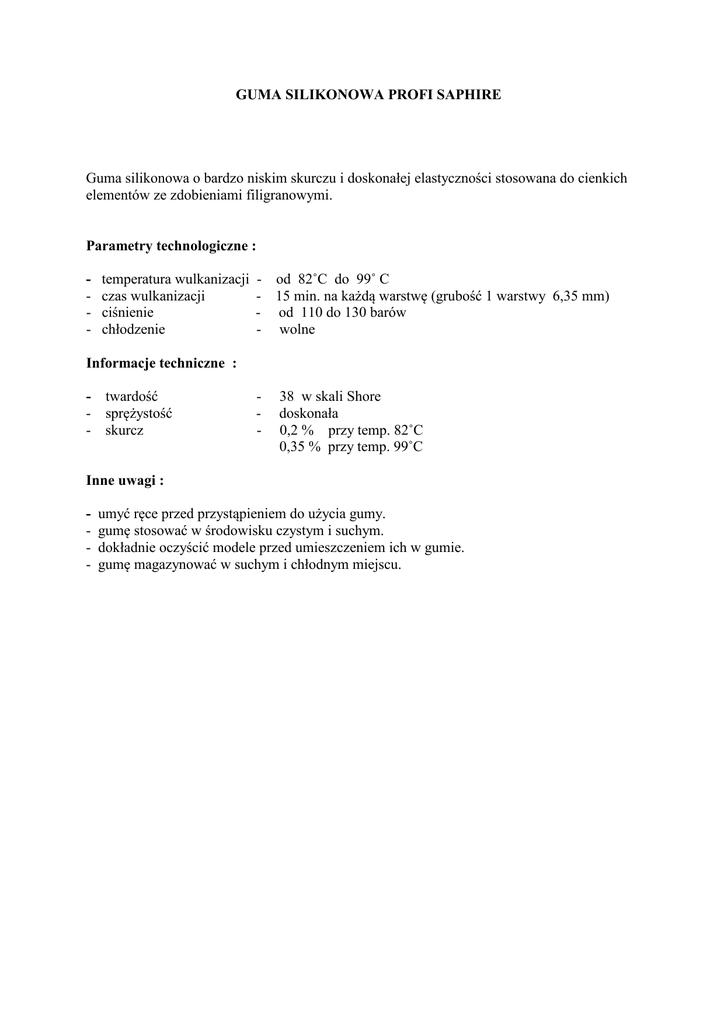 GUMA SILIKONOWA PROFI SAPHIRE Guma silikonowa o bardzo niskim skurczu i doskonałej elastyczności stosowana do cienkich elementów ze zdobieniami filigranowymi. Parametry technologiczne : - temperatura wulkanizacji czas wulkanizacji ciśnienie chłodzenie - od 82˚C do 99˚ C - 15 min. na każdą warstwę (grubość 1 warstwy 6,35 mm) - od 110 do 130 barów - wolne Informacje techniczne : - twardość - sprężystość - skurcz - 38 w skali Shore doskonała 0,2 % przy temp. 82˚C 0,35 % przy temp. 99˚C Inne uwagi : - umyć ręce przed przystąpieniem do użycia gumy. gumę stosować w środowisku czystym i suchym. dokładnie oczyścić modele przed umieszczeniem ich w gumie. gumę magazynować w suchym i chłodnym miejscu.