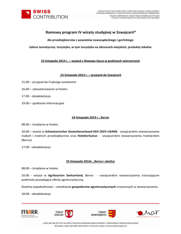 Ramowy program IV wizyty studyjnej w Szwajcarii* dla przedsiębiorców z powiatów nowosądeckiego i gorlickiego Zakres tematyczny: turystyka, w tym turystyka na obszarach wiejskich, produkty lokalne 22 listopada 2014 r. – wyjazd z Nowego Sącza w godzinach wieczornych 23 listopada 2014 r. – przyjazd do Szwajcarii 15.00 – przyjazd do Fryburga autokarem 16.00 – zakwaterowanie w hotelu 17.00 - obiadokolacja 19.00 – spotkanie informacyjne 24 listopada 2014 r., Berno 08.00 – śniadanie w hotelu 10.00 – wizyta w Schweizerischer Gewerbeverband SGV (SGV-USAM) - szwajcarskim stowarzyszeniu małych i średnich przedsiębiorstw oraz HotelierSuisse - szwajcarskim stowarzyszeniu hotelarskim (Berno) 17.00 - obiadokolacja 25 listopada 2014r., Berno i okolice 08.00 – śniadanie w hotelu 10.00 - wizyta w Agritourism Switzerland, Berno podmioty posiadające ofertę agroturystyczną. - szwajcarskim stowarzyszeniu zrzeszającym Godziny popołudniowe – zwiedzanie gospodarstw agroturystycznych zrzeszonych w stowarzyszeniu. 18.00 - obiadokolacja 26 listopada 2014 r., Fryburg 08.00 – śniadanie w hotelu, wykwaterowanie 10.00 - wizyta w Produits du Terroir du Pays de Fribourg – regionalnym stowarzyszeniu promującym produkty lokalne i ich producentów /do potwierdzenia/ 14.00 – wizyta w Union fribourgeoise du tourisme - stowarzyszeniu promującym turystykę w regionie /do potwierdzenia/ 17.00 – obiadokolacja 19.00 – wyjazd do Polski 27 listopada 2014 r., – powrót do Nowego Sącza *Program może ulec zmianom w zależności od dostępności i rzeczywistego czasu trwania spotkań w poszczególnych instytucjach lub innych czynników zaistniałych w trakcie organizacji i/lub realizacji wizyty.