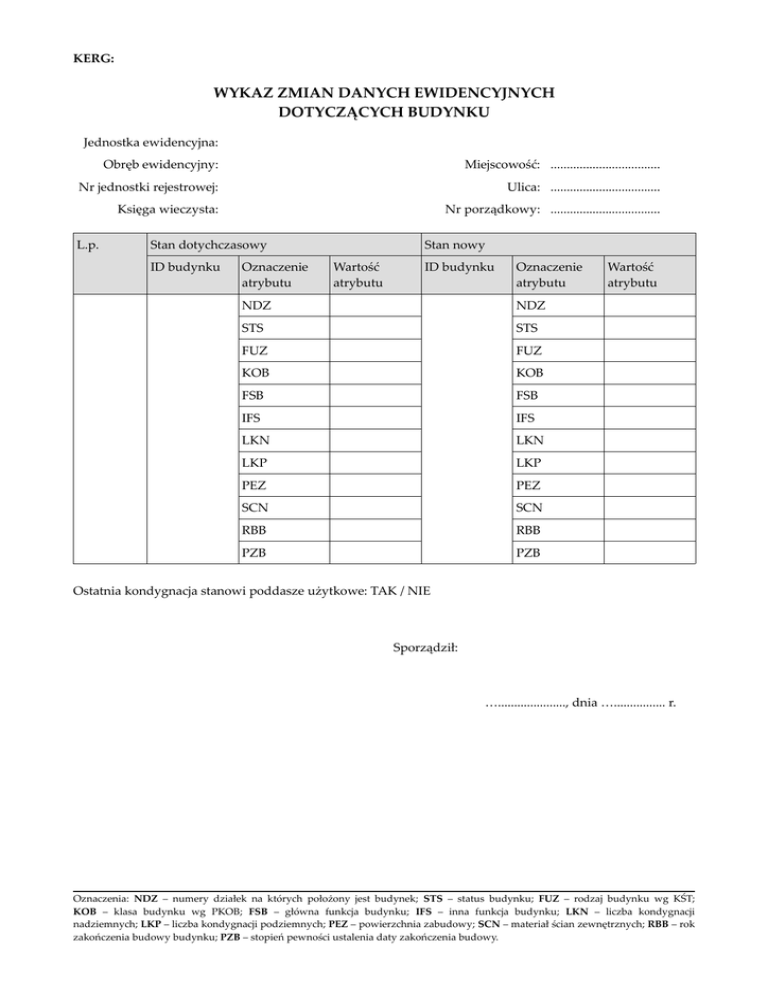 KERG: WYKAZ ZMIAN DANYCH EWIDENCYJNYCH DOTYCZĄCYCH BUDYNKU Jednostka ewidencyjna: Obręb ewidencyjny: Miejscowość: .................................. Nr jednostki rejestrowej: Ulica: .................................. Księga wieczysta: Nr porządkowy: .................................. L.p. Stan dotychczasowy ID budynku Oznaczenie atrybutu Stan nowy Wartość atrybutu ID budynku Oznaczenie atrybutu NDZ NDZ STS STS FUZ FUZ KOB KOB FSB FSB IFS IFS LKN LKN LKP LKP PEZ PEZ SCN SCN RBB RBB PZB PZB Wartość atrybutu Ostatnia kondygnacja stanowi poddasze użytkowe: TAK / NIE Sporządził: …....................., dnia …................ r. Oznaczenia: NDZ – numery działek na których położony jest budynek; STS – status budynku; FUZ – rodzaj budynku wg KŚT; KOB – klasa budynku wg PKOB; FSB – główna funkcja budynku; IFS – inna funkcja budynku; LKN – liczba kondygnacji nadziemnych; LKP – liczba kondygnacji podziemnych; PEZ – powierzchnia zabudowy; SCN – materiał ścian zewnętrznych; RBB – rok zakończenia budowy budynku; PZB – stopień pewności ustalenia daty zakończenia budowy.