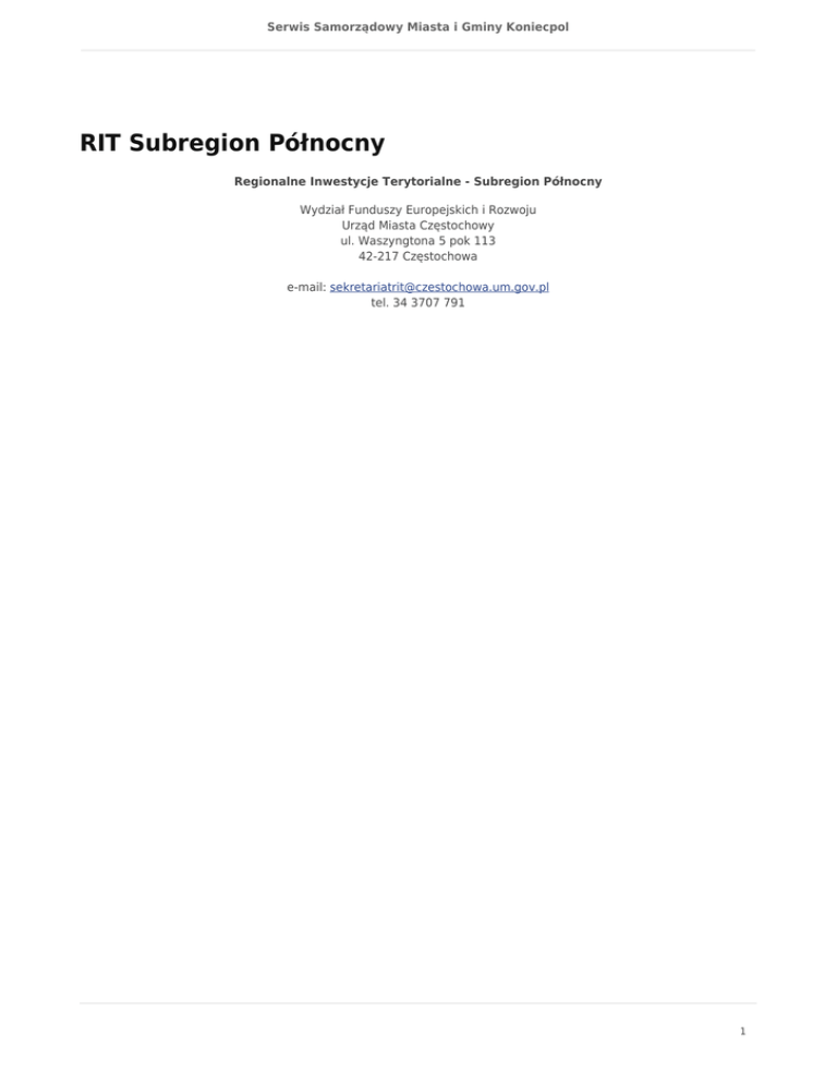Serwis Samorządowy Miasta i Gminy Koniecpol RIT Subregion Północny Regionalne Inwestycje Terytorialne - Subregion Północny Wydział Funduszy Europejskich i Rozwoju Urząd Miasta Częstochowy ul. Waszyngtona 5 pok 113 42-217 Częstochowa e-mail: [email protected] tel. 34 3707 791 1
