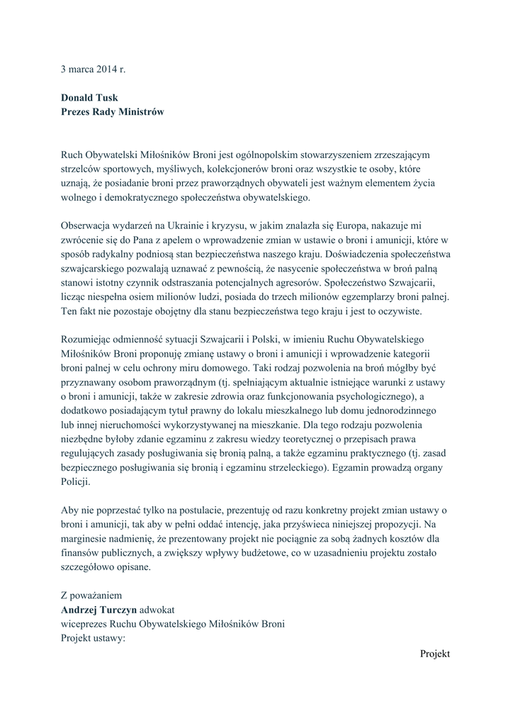3 marca 2014 r. Donald Tusk Prezes Rady Ministrów Ruch Obywatelski Miłośników Broni jest ogólnopolskim stowarzyszeniem zrzeszającym strzelców sportowych, myśliwych, kolekcjonerów broni oraz wszystkie te osoby, które uznają, że posiadanie broni przez praworządnych obywateli jest ważnym elementem życia wolnego i demokratycznego społeczeństwa obywatelskiego. Obserwacja wydarzeń na Ukrainie i kryzysu, w jakim znalazła się Europa, nakazuje mi zwrócenie się do Pana z apelem o wprowadzenie zmian w ustawie o broni i amunicji, które w sposób radykalny podniosą stan bezpieczeństwa naszego kraju. Doświadczenia społeczeństwa szwajcarskiego pozwalają uznawać z pewnością, że nasycenie społeczeństwa w broń palną stanowi istotny czynnik odstraszania potencjalnych agresorów. Społeczeństwo Szwajcarii, licząc niespełna osiem milionów ludzi, posiada do trzech milionów egzemplarzy broni palnej. Ten fakt nie pozostaje obojętny dla stanu bezpieczeństwa tego kraju i jest to oczywiste. Rozumiejąc odmienność sytuacji Szwajcarii i Polski, w imieniu Ruchu Obywatelskiego Miłośników Broni proponuję zmianę ustawy o broni i amunicji i wprowadzenie kategorii broni palnej w celu ochrony miru domowego. Taki rodzaj pozwolenia na broń mógłby być przyznawany osobom praworządnym (tj. spełniającym aktualnie istniejące warunki z ustawy o broni i amunicji, także w zakresie zdrowia oraz funkcjonowania psychologicznego), a dodatkowo posiadającym tytuł prawny do lokalu mieszkalnego lub domu jednorodzinnego lub innej nieruchomości wykorzystywanej na mieszkanie. Dla tego rodzaju pozwolenia niezbędne byłoby zdanie egzaminu z zakresu wiedzy teoretycznej o przepisach prawa regulujących zasady posługiwania się bronią palną, a także egzaminu praktycznego (tj. zasad bezpiecznego posługiwania się bronią i egzaminu strzeleckiego). Egzamin prowadzą organy Policji. Aby nie poprzestać tylko na postulacie, prezentuję od razu konkretny projekt zmian ustawy o broni i amunicji, tak aby w pełni oddać intencję, jaka przyświeca niniejszej propozycji. Na marginesie nadmienię, że prezentowany projekt nie pociągnie za sobą żadnych kosztów dla finansów publicznych, a zwiększy wpływy budżetowe, co w uzasadnieniu projektu zostało szczegółowo opisane. Z poważaniem Andrzej Turczyn adwokat wiceprezes Ruchu Obywatelskiego Miłośników Broni Projekt ustawy: Projekt USTAWA z dnia o zmianie ustawy o broni i amunicji Art. 1. W ustawie z dnia 21 maja 1999 r. o broni i amunicji (t.j. Dz. U. z 2012 r. poz. 576, z późn. zm.) wprowadza się następujące zmiany: 1) w art. 10 ust. 2 dodaje się punkt 9) w brzmieniu: „9). ochrony miru domowego”; 2) w art. 10 ust. 3 dodaje się punkt 8) w brzmieniu: „8). posiadanie tytułu prawnego do lokalu mieszkalnego, domu jednorodzinnego lub innej nieruchomości wykorzystywanej na celemieszkaniowe – dla pozwolenia na broń do ochrony miru domowego.” 3) art. 10 ust. 4 dodaje się punkt 8) w brzmieniu: „8). do celów ochrony miru domowego - broni, o którejmowa w pkt 1, pkt 2 lit b), d) i w pkt. 4) lit. a) – c)” 4) art. 10 ust. 8 otrzymuje brzmienie: „8. Zabrania się noszenia broni posiadanej na podstawie pozwolenia do celów kolekcjonerskich, pamiątkowych lub do ochrony miru domowego bez zgody właściwego organu Policji.” Art. 2. Ustawa wchodzi w życie po upływie 14 dni od dnia ogłoszenia. uzasadnienie 1. Potrzeba i cel wydania ustawy. Ustawa z 1999 r. o broni i amunicji, znowelizowana w istotnym zakresie w 2011 roku, wymaga dalszego dostosowania do dynamicznie rozwijających się wydarzeń na arenie międzynarodowej. Wydarzenia na Ukrainie i zaistnienie zagrożenia naszego kraju, co podkreśla kierownictwo Biura Bezpieczeństwa Narodowego, nakazują wprowadzić realne możliwości obrony dla obywateli. Idąc za przykładem Szwajcarii, kraju bardzostabilnego i bezpiecznego, należy wskazać na jedną z przyczyn tego stanu rzeczy. Liczba ludności Szwajcarii liczy blisko osiem milionów. W rękach Szwajcarów jest blisko trzy miliony egzemplarzy broni palnej. Ten fakt nie pozostaje bez znaczenia dla zapewnienia bezpieczeństwa Szwajcarii. W Polsce nie da się odtworzyć wzorów szwajcarskich, jednak należy do nich nawiązywać, zważając na uwarunkowania polskie. Uznając oczywistość taką, że o zdolności obronnej Polski nie stanowią wyłącznie Siły Zbrojne i zawarte sojusze, ale także zdolności samoobronne społeczeństwa, proponuje się wprowadzić zmiany w projekcie ustawy. Dla zapewnienia bezpieczeństwa polskich rodzin proponuje się wprowadzenie kolejnej kategorii pozwolenia na broń, dla ochrony miru domowego. W tym celu projektuje się nowy punkt 9) w art. 10 ust 2 ustawy o broni i amunicji. Ważną przyczyną uzasadniającą wydanie pozwolenia w tym celu byłoby posiadanie tytułu prawnego do lokalu mieszkalnego, domu lub innej nieruchomości wykorzystywanej na cele mieszkaniowe. Ta ważna przyczyna została wyrażona w projektowanym art. 10 ust 3 pkt 8) ustawy o broni i amunicji. Tytuł prawny to nie wyłącznie prawo własności, ale także np. prawo najmu. Utrata tytułu prawnego uzasadniać może cofnięcie pozwolenia na broń (art. 18 ust 4 ustawy o broni i amunicji). Charakterystyczną cechą tego rodzaju pozwolenia byłoby to, że broń posiadana na jego podstawie objęta będzie zakazem noszenia w stanie załadowanym. W tym celu projektowane jest nowe brzmienie art. 10 ust 8 ustawy o broni i amunicji. To konsekwencja pozwolenia, którego celem jest ochrona miru domowego, a nie ochrona indywidualna. Uzyskanie pozwolenia wymagało będzie zdania egzaminu przed organem właściwym dla wydania pozwolenia na broń (art. 16 ust 1 ustawy o broni i amunicji). Egzamin dla tego rodzaju pozwolenia będzie obejmował egzamin teoretyczny oraz praktyczny. Ten ostatni będzie składał się z egzaminu w przedmiocie zasad bezpiecznego posługiwania się bronią oraz z egzaminu strzeleckiego. Zasady 