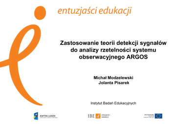 Zastosowanie teorii detekcji sygnałów do analizy rzetelności systemu obserwacyjnego ARGOS Michał Modzelewski Jolanta Pisarek Instytut Badań Edukacyjnych Aplikacja komputerowa ARGOS przygotowana w oparciu o systemy CLASS oraz inCLASS umożliwia przeprowadzenie trzech rodzajów obserwacji: skoncentrowanej na nauczycielu skoncentrowanej na uczniu dydaktycznej (pozwalającej na analizę metod i form pracy stosowanych przez nauczyciela) w dwóch pierwszych trybach obserwacji została zastosowana metodologia próbek czasowych po zakończonych obserwacjach dane w postaci pliku xml są przesyłane za pośrednictwem panelu webowego, stworzonego specjalnie na potrzeby projektu. IV etap badania szkolnych uwarunkowań efektywności kształcenia Badanie I - pilotażowe (III-IV 2013) • Etap I • 20 oddziałów klas III • 8 godzin obserwacji zajęć zintegrowanych • Etap II • 20 oddziałów klas V • 10 godzin obserwacji Badanie II (IV-VI 2013) • Klasy V • 69 oddziałów • 15 godzin obserwacji Cel: oszacowanie rzetelności narzędzia -> procedura podwójnego kodowania Badanie pilotażowe Spotkania fokusowe • etap 1: 60 godzin x 2 obserwatorów • etap 2: 120 godzin x 2 obserwatorów • 3 lekcje • 34 - 42 obserwatorów • 3 etapy badania Trudności w określaniu rzetelności metody obserwacyjnej Różne źródła błędów: aplikacja (różne tryby obserwacyjne i zachowania w obrębie poszczególnych trybów, stabilności działania samej aplikacji) obserwatorzy (różnice w kompetencjach, efekt obserwatora) lekcje (różne przedmioty czy pory lekcji, na których odbywały się obserwacje) Metodologia zastosowana w celu analizy rzetelności narzędzia CLASS i inCLASS – teoria uniwersalizacji Teoria Detekcji Sygnałów ma zastosowanie w każdej sytuacji, w której dane wejściowe są niejednoznaczne zadaniem odbiorcy bodźców jest dokonanie wyboru pomiędzy opcjami: “tak, jest sygnał” i “nie, to tylko szum” pozwala odpowiedzieć na pytanie, czy dana osoba jest czulszym detektorem, czy też z różnych względów preferuje konkretne odpowiedzi uwzględnia dwa rodzaje błędów, które mogą zostać popełnione w trakcie podejmowania decyzji Płaszczyzna ROC wywodzi się z teorii detekcji sygnałów ilustruje związek pomiędzy czułością, czyli zdolnością odbiorcy do wykrycia sygnałów, a jego specyficznością, czyli zdolnością odbiorcy do unikania błędnych decyzji w przypadku sytuacji, gdy obiekt, który podlega analizie przez odbiorcę opisywany jest przy pomocy zmiennej ciągłej, możliwe jest wyrysowanie na płaszczyźnie ROC krzywej, która dostarcza informacji o efektywności klasyfikatora przy różnych wartościach progu. Argos a TDS – podstawowe pojęcia Sygnał = pojedyncze zachowanie dowolnej kategorii w danej próbce czasu Odbiorca = obserwator, który za pomocą aplikacji Argos odnotowuje w danej próbce czasu wszystkie zaobserwowane przez siebie zachowania Sygnały: uczeń ściąga lub uczeń zgłasza się do odpowiedzi Macierz klasyfikacji OBSERWATOR WZORZEC ZACHOWANIE WYSTĄPIŁO ZACHOWANIE NIE WYSTĄPIŁO PRAWDZIWIE POZYTYWNE WSKAZANIE FAŁSZYWIE POZYTYWNE WSKAZANIE ZACHOWANIE FAŁSZYWIE NIE WYSTĄPIŁO NEGATYWNE WSKAZANIE PRAWDZIWIE NEGATYWNE WSKAZANIE ZACHOWANIE WYSTĄPIŁO Z czym mieliśmy problem? Obserwator dostarcza informacji tylko o tym czy w danej próbce czasu wystąpiło konkretne zachowanie Obserwator nie zaznacza w programie informacji, że dane zachowanie nie wystąpiło (to samo dotyczy wzorca) Obserwator miał nie tylko zaznaczyć jakie zachowanie wystąpiło, ale też ile razy Potrzebne było określenie maksymalnej liczby zdarzeń każdego typu, które mogły wystąpić w danej próbce i dołączenie ich jako negatywnych wskazań do wzorca. Rozwiązanie najmniej arbitralne: określenie tego maksimum na podstawie fałszywie pozytywnych wskazań obserwatorów, tzn. tych zachowań, które według obserwatorów wystąpiły w danej próbce, ale nie wystąpiły we wzorcu Dla każdej próbki stworzyliśmy zestawienie poszczególnych zliczeń zachowań zaobserwowanych w danej próbce przez wszystkich obserwatorów lub obecnych dla danej próbki we wzorcu Dla każdego obserwatora odnieśliśmy wskazania dla tak określonego zbioru zachowań w danej próbce do wskazań obecnych we wzorcu Dysponujemy dla każdego obserwatora informacjami umożliwiającymi wyliczenie czułości i specyficzności i możemy każdego obserwatora umieścić na płaszczyźnie ROC. Dla każdego obserwatora w ramach danej próbki zapełniliśmy macierz klasyfikacji i zsumowaliśmy je po próbkach. Czułość mówi o odsetku wskazań zgodnych ze wzorcem spośród wszystkich zachowań obecnych we wzorcowej obserwacji niska czułość obserwatorów może świadczyć o niskim stopniu przyswojenia założeń systemu obserwacyjnego informacja o wysokiej czułości nie jest wystarczająca do pozytywnej oceny jakości pracy obserwatora (łatwo ją zmaksymalizować, zaznaczając liczne wystąpienia dużej liczby kategorii w próbce) W efekcie może się zdarzyć, że obserwator z dużą czułością to obserwator, który zbyt łatwo ulega wrażeniu, że jakieś zachowanie wystąpiło w próbce ->specyficzność Specyficzność mówi o tym, na ile obserwator powstrzymuje się od raportowania “falszywych alarmów”, tj. zachowań, które nie są obecne we wzorcu. przekształcenie tego wskaźnika, poprzez odjęcie go od jedności (1specyficzność), które widzimy na wykresie, umożliwia odpowiedź na pytanie o to, za jaki odsetek błędnych wskazań zachowań (tj. zachowań niewystępujących we wzorcu) dla wszystkich próbek odpowiada dany obserwator. Wykres płaszczyzny ROC z naniesionymi zestawieniami czułości i specyficzności obserwatorów dla jednej lekcji z języka polskiego w klasie V. Tryb obserwacji nauczyciela 1 0,9 0,8 Czułość 0,7 0,6 0,5 0,4 0,3 0,2 0,1 0 0 0,1 0,2 0,3 0,4 0,5 0,6 1 - Specyficzność 0,7 0,8 0,9 1 Wyniki obserwatorzy są znaczn