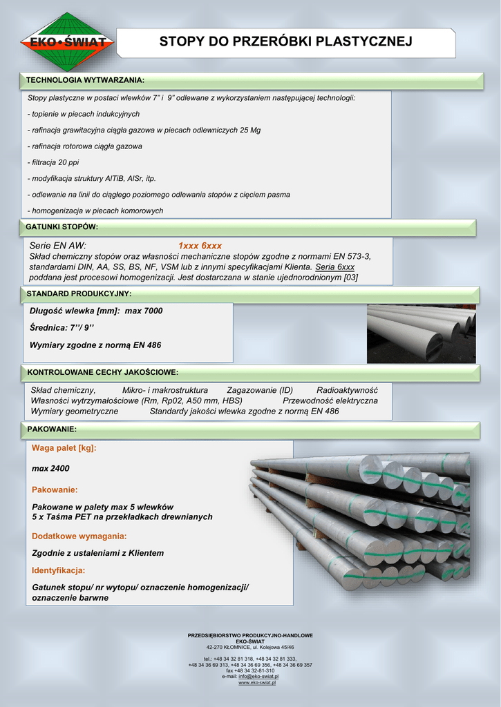 STOPY DO PRZERÓBKI PLASTYCZNEJ TECHNOLOGIA WYTWARZANIA: Stopy plastyczne w postaci wlewków 7” i 9” odlewane z wykorzystaniem następującej technologii: - topienie w piecach indukcyjnych - rafinacja grawitacyjna ciągła gazowa w piecach odlewniczych 25 Mg - rafinacja rotorowa ciągła gazowa - filtracja 20 ppi - modyfikacja struktury AlTiB, AlSr, itp. - odlewanie na linii do ciągłego poziomego odlewania stopów z cięciem pasma - homogenizacja w piecach komorowych GATUNKI STOPÓW: Serie EN AW: 1xxx 6xxx Skład chemiczny stopów oraz własności mechaniczne stopów zgodne z normami EN 573-3, standardami DIN, AA, SS, BS, NF, VSM lub z innymi specyfikacjami Klienta. Seria 6xxx poddana jest procesowi homogenizacji. Jest dostarczana w stanie ujednorodnionym [03] STANDARD PRODUKCYJNY: Długość wlewka [mm]: max 7000 Średnica: 7’’/ 9’’ Wymiary zgodne z normą EN 486 KONTROLOWANE CECHY JAKOŚCIOWE: Skład chemiczny, Mikro- i makrostruktura Zagazowanie (ID) Radioaktywność Własności wytrzymałościowe (Rm, Rp02, A50 mm, HBS) Przewodność elektryczna Wymiary geometryczne Standardy jakości wlewka zgodne z normą EN 486 PAKOWANIE: Waga palet [kg]: max 2400 Pakowanie: Pakowane w palety max 5 wlewków 5 x Taśma PET na przekładkach drewnianych Dodatkowe wymagania: Zgodnie z ustaleniami z Klientem Identyfikacja: Gatunek stopu/ nr wytopu/ oznaczenie homogenizacji/ oznaczenie barwne PRZEDSIĘBIORSTWO PRODUKCYJNO-HANDLOWE EKO-ŚWIAT 42-270 KŁOMNICE, ul. Kolejowa 45/46 tel.: +48 34 32 81 318, +48 34 32 81 333, +48 34 36 69 313, +48 34 36 69 356, +48 34 36 69 357 fax +48 34 32-81-310 e-mail: [email protected] www.eko-swiat.pl