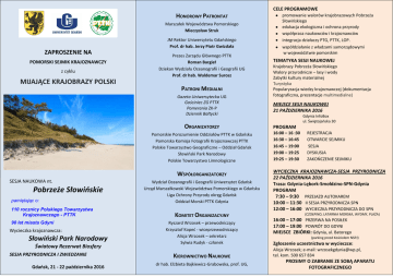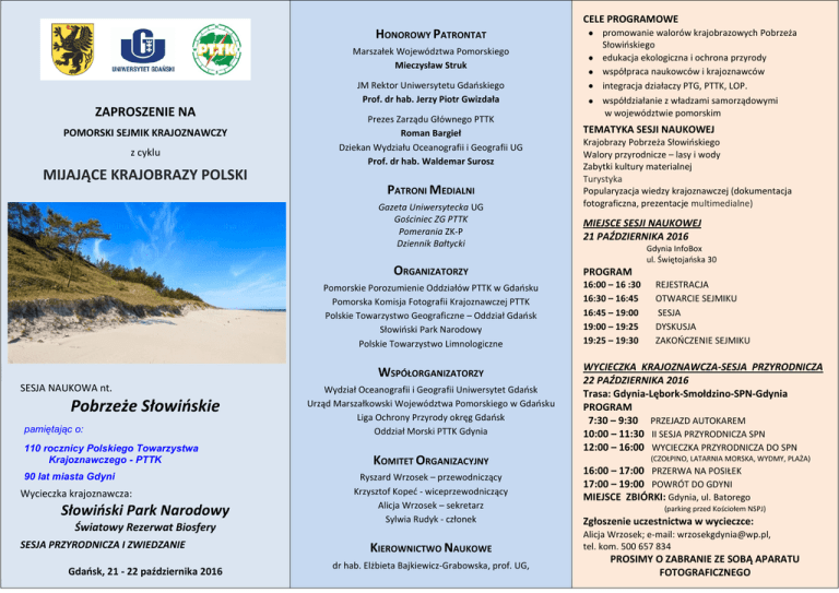 CELE PROGRAMOWE HONOROWY PATRONTAT Marszałek Województwa Pomorskiego Mieczysław Struk JM Rektor Uniwersytetu Gdaoskiego Prof. dr hab. Jerzy Piotr Gwizdała ZAPROSZENIE NA POMORSKI SEJMIK KRAJOZNAWCZY z cyklu MIJAJĄCE KRAJOBRAZY POLSKI Prezes Zarządu Głównego PTTK Roman Bargieł Dziekan Wydziału Oceanografii i Geografii UG Prof. dr hab. Waldemar Surosz PATRONI MEDIALNI Gazeta Uniwersytecka UG Gościniec ZG PTTK Pomerania ZK-P Dziennik Bałtycki ORGANIZATORZY Pomorskie Porozumienie Oddziałów PTTK w Gdaosku Pomorska Komisja Fotografii Krajoznawczej PTTK Polskie Towarzystwo Geograficzne – Oddział Gdaosk Słowioski Park Narodowy Polskie Towarzystwo Limnologiczne WSPÓŁORGANIZATORZY SESJA NAUKOWA nt. Pobrzeże Słowińskie pamiętając o: 110 rocznicy Polskiego Towarzystwa Krajoznawczego - PTTK 90 lat miasta Gdyni Wycieczka krajoznawcza: Słowiński Park Narodowy Światowy Rezerwat Biosfery SESJA PRZYRODNICZA I ZWIEDZANIE Gdaosk, 21 - 22 października 2016 Wydział Oceanografii i Geografii Uniwersytet Gdaosk Urząd Marszałkowski Województwa Pomorskiego w Gdaosku Liga Ochrony Przyrody okręg Gdaosk Oddział Morski PTTK Gdynia KOMITET ORGANIZACYJNY Ryszard Wrzosek – przewodniczący Krzysztof Koped - wiceprzewodniczący Alicja Wrzosek – sekretarz Sylwia Rudyk - członek KIEROWNICTWO NAUKOWE dr hab. Elżbieta Bajkiewicz-Grabowska, prof. UG, promowanie walorów krajobrazowych Pobrzeża Słowioskiego edukacja ekologiczna i ochrona przyrody współpraca naukowców i krajoznawców integracja działaczy PTG, PTTK, LOP. współdziałanie z władzami samorządowymi w województwie pomorskim TEMATYKA SESJI NAUKOWEJ Krajobrazy Pobrzeża Słowioskiego Walory przyrodnicze – lasy i wody Zabytki kultury materialnej Turystyka Popularyzacja wiedzy krajoznawczej (dokumentacja fotograficzna, prezentacje multimedialne) MIEJSCE SESJI NAUKOWEJ 21 PAŹDZIERNIKA 2016 Gdynia InfoBox ul. Świętojaoska 30 PROGRAM 16:00 – 16 :30 16:30 – 16:45 16:45 – 19:00 19:00 – 19:25 19:25 – 19:30 REJESTRACJA OTWARCIE SEJMIKU SESJA DYSKUSJA ZAKOOCZENIE SEJMIKU WYCIECZKA KRAJOZNAWCZA-SESJA PRZYRODNICZA 22 PAŹDZIERNIKA 2016 Trasa: Gdynia-Lębork-Smołdzino-SPN-Gdynia PROGRAM 7:30 – 9:30 PRZEJAZD AUTOKAREM 10:00 – 11:30 II SESJA PRZYRODNICZA SPN 12:00 – 16:00 WYCIECZKA PRZYRODNICZA DO SPN (CZOŁPINO, LATARNIA MORSKA, WYDMY, PLAŻA) 16:00 – 17:00 PRZERWA NA POSIŁEK 17:00 – 19:00 POWRÓT DO GDYNI MIEJSCE ZBIÓRKI: Gdynia, ul. Batorego (parking przed Kościołem NSPJ) Zgłoszenie uczestnictwa w wycieczce: Alicja Wrzosek; e-mail: [email protected], tel. kom. 500 657 834 PROSIMY O ZABRANIE ZE SOBĄ APARATU FOTOGRAFICZNEGO