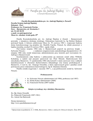 Parafia Rzymskokatolicka pw. św. Jadwigi Śląskiej w Żorach1 Parafia Świętej Jadwigi Śląskiej Dekanat: Żory Proboszcz: ks. Franciszek Pawlas Żory – Baranowice, ul. Strażacka 3 tel: 32 435 50 99 e-mail: [email protected] Msza św. szkolna: środa godz. 800 Parafia Rzymskokatolicka pw. św. Jadwigi Śląskiej w Żorach – Baranowicach powstała z inicjatywy dziekana żorskiego. Ordynariusz katowicki ks. bp Herbert Bednorz poświęcił barak, w którym celebrowano Msze św. W czerwcu 1983 r. rozpoczęto budowę domu katechetycznego wg projektu inż. Rudolfa Fojcika. Pomysł, by obiekt poszerzyć o kaplicę mszalną, uzyskał 22 czerwca 1986 r. zgodę władz. Pod koniec sierpnia 1984 roku w Baranowicach pojawił się pierwszy ksiądz – Sylwester Niesyto z zadaniem zorganizowania samodzielnego duszpasterstwa i 24. sierpnia 1986 roku został mianowany administratorem przy kościele pod wezwaniem św. Jadwigi w Baranowicach. Koordynatorem całej budowy i jednocześnie jej mistrzem został sołtys Wilhelm Kołodziej, a nadzór nad pracami sprawował inż. Piotr Mirecki. Budowniczymi byli mieszkańcy Baranowic. 15. października 1986 roku kościół w stanie surowym wraz z salkami katechetycznymi w obecności duchowieństwa dekanalnego oraz księży pochodzących z Baranowic, w tym ks. dyr. Alojzego Orszulika, a także zaproszonych gości i parafian został poświęcony przez ordynariusza katowickiego ks. bp dr. Damiana Zimonia. Parafia została erygowana 1. stycznia 1987 r., a jej proboszczem został ks. Sylwester Niesyto. Proboszczowie ks. Sylwester Niesyto administrator (od 1986), proboszcz (od 1987) ks. Stefan Kalisz administrator (2006) ks. Franciszek Pawlas (2007-nadal) Księża wywodzący się z dzielnicy Baranowice Ks. Bp Alojzy Orszulik Ks. Palarczyk Franciszek (1887-1961) Ks. Antoni Jan Bartoszek Strona internetowa: http://www.parafiabaranowice.pl/ 1 Opracowano na podstawie: Z. J. Orlik, Baranowice. Szkice z dalszych i bliższych dziejów, Żory 2012