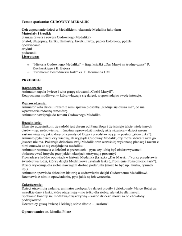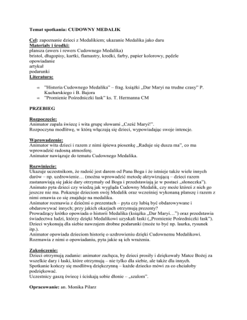 Temat spotkania: CUDOWNY MEDALIK Cel: zapoznanie dzieci z Medalikiem; ukazanie Medalika jako daru Materiały i środki: plansza (awers i rewers Cudownego Medalika) bristol, długopisy, kartki, flamastry, kredki, farby, papier kolorowy, pędzle opowiadanie artykuł podarunki Literatura: • • ”Historia Cudownego Medalika” – frag. książki „Dar Maryi na trudne czasy” P. Kucharskiego i B. Bajora ”Promienie Pośredniczki łask” ks. T. Hermanna CM PRZEBIEG Rozpoczęcie: Animator zapala świecę i wita grupę słowami „Cześć Maryi!”. Rozpoczyna modlitwę, w którą włączają się dzieci, wypowiadając swoje intencje. Wprowadzenie: Animator wita dzieci i razem z nimi śpiewa piosenkę „Raduje się dusza ma”, co ma wprowadzić radosną atmosferę. Animator nawiązuje do tematu Cudownego Medalika. Rozwinięcie: Ukazuje uczestnikom, że radość jest darem od Pana Boga i że istnieje także wiele innych darów – np. uzdrowienie… (można wprowadzić metodę aktywizującą – dzieci razem zastanawiają się jakie dary otrzymały od Boga i przedstawiają je w postaci „słoneczka”). Animato pyta dzieci czy wiedzą jak wygląda Cudowny Medalik, czy może któreś z nich go jeszcze nie ma. Pokazuje dzieciom swój Medalik oraz wcześniej wykonaną planszę i razem z nimi omawia co się znajduje na medaliku. Animator rozmawia z dziećmi o prezentach – pyta czy lubią być obdarowywane i obdarowywać innych; przy jakich okazjach otrzymują prezenty? Prowadzący krótko opowiada o historii Medalika (książka „Dar Maryi…”) oraz przedstawia świadectwa ludzi, którzy dzięki Medalikowi uzyskali łaski („Promienie Pośredniczki łask”). Dzieci wykonują dla siebie nawzajem drobne podarunki (może to być np. laurka, rysunek itp.). Animator opowiada dzieciom historię o uzdrowieniu dzięki Cudownemu Medalikowi. Rozmawia z nimi o opowiadaniu, pyta jakie są ich wrażenia. Zakończenie: Dzieci otrzymują zadanie: animator zachęca, by dzieci prosiły i dziękowały Matce Bożej za wszelkie dary i łaski, które otrzymują – nie tylko dla siebie, ale także dla innych. Spotkanie kończy się modlitwą dziękczynną – każde dziecko mówi za co chciałoby podziękować. Uczestnicy gaszą świecę i ściskają sobie dłonie – „szalom”. Opracowanie: an. Monika Pilarz