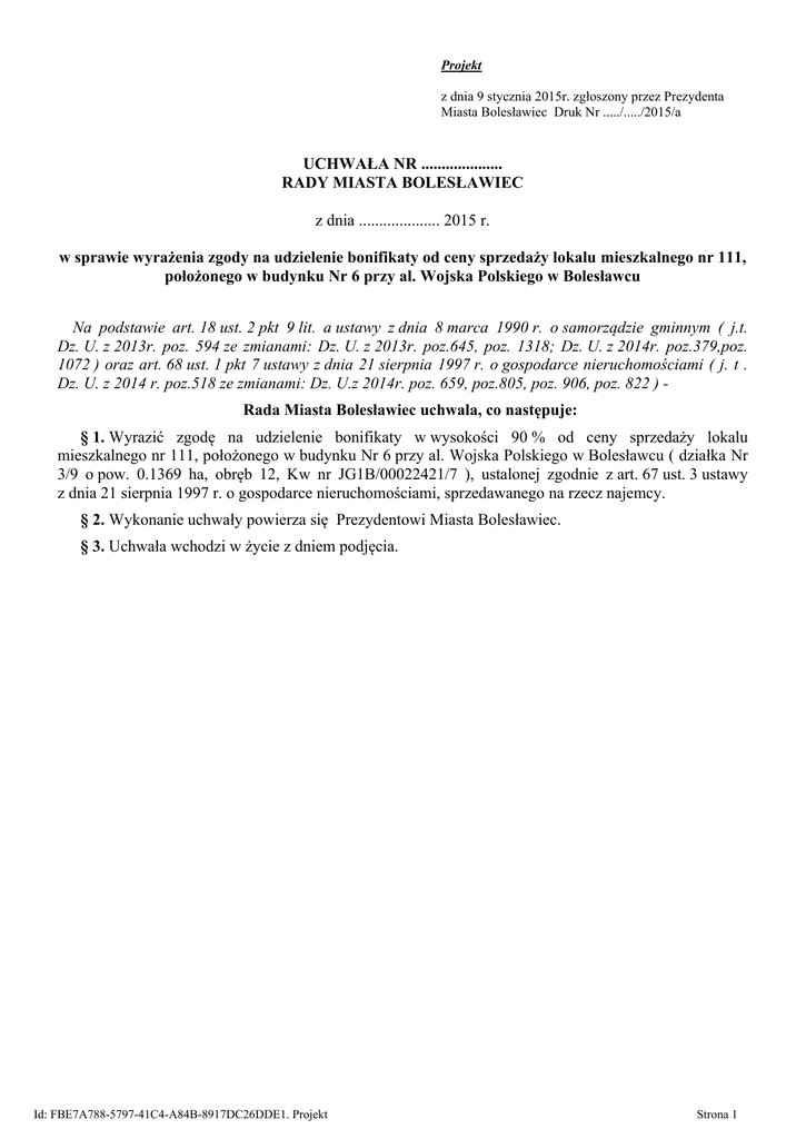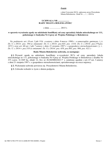 Projekt z dnia 9 stycznia 2015r. zgłoszony przez Prezydenta Miasta Bolesławiec Druk Nr ...../...../2015/a UCHWAŁA NR .................... RADY MIASTA BOLESŁAWIEC z dnia .................... 2015 r. w sprawie wyrażenia zgody na udzielenie bonifikaty od ceny sprzedaży lokalu mieszkalnego nr 111, położonego w budynku Nr 6 przy al. Wojska Polskiego w Bolesławcu Na podstawie art. 18 ust. 2 pkt 9 lit. a ustawy z dnia 8 marca 1990 r. o samorządzie gminnym ( j.t. Dz. U. z 2013r. poz. 594 ze zmianami: Dz. U. z 2013r. poz.645, poz. 1318; Dz. U. z 2014r. poz.379,poz. 1072 ) oraz art. 68 ust. 1 pkt 7 ustawy z dnia 21 sierpnia 1997 r. o gospodarce nieruchomościami ( j. t . Dz. U. z 2014 r. poz.518 ze zmianami: Dz. U.z 2014r. poz. 659, poz.805, poz. 906, poz. 822 ) Rada Miasta Bolesławiec uchwala, co następuje: § 1. Wyrazić zgodę na udzielenie bonifikaty w wysokości 90 % od ceny sprzedaży lokalu mieszkalnego nr 111, położonego w budynku Nr 6 przy al. Wojska Polskiego w Bolesławcu ( działka Nr 3/9 o pow. 0.1369 ha, obręb 12, Kw nr JG1B/00022421/7 ), ustalonej zgodnie z art. 67 ust. 3 ustawy z dnia 21 sierpnia 1997 r. o gospodarce nieruchomościami, sprzedawanego na rzecz najemcy. § 2. Wykonanie uchwały powierza się Prezydentowi Miasta Bolesławiec. § 3. Uchwała wchodzi w życie z dniem podjęcia. Id: FBE7A788-5797-41C4-A84B-8917DC26DDE1. Projekt Strona 1 UZASADNIENIE Uchwałą nr XVII/146/07 Rady Miasta Bolesławiec z dnia 28 grudnia 2007 r. o zmianie uchwały nr XLVII/400/02 Rady Miejskiej w Bolesławcu z dnia 26 lutego 2002 r. w sprawie zasad gospodarowania nieruchomościami stanowiącymi własność Gminy Miejskiej Bolesławiec została zniesiona bonifikata w wysokości 90%, udzielana przy sprzedaży komunalnych lokali mieszkalnych na rzecz ich najemców. W myśl zapisów uchwały bonifikata może być przyznana tylko tym najemcom, którzy złożyli wnioski o wykup mieszkań w terminie do dnia 31 grudnia 2008 r. Sprzedaż lokali mieszkalnych na wnioski najemców złożone po tej dacie - może być dokonana wyłącznie za jednorazową zapłatą całości ceny sprzedaży, przed zawarciem aktu notarialnego. W dniu 29 lipca 2014 r. najemczyni lokalu mieszkalnego nr 111 w budynku przy al. Wojska Polskiego Nr 6 w Bolesławcu wystąpiła do Prezydenta Miasta Bolesławiec z prośbą o wyrażenie zgody na wykup najmowanego mieszkania za 10% jego wartości. Przedmiotowy lokal mieszkalny został przydzielony wnioskodawczyni w drodze zamiany lokali z urzędu, na podstawie umowy najmu z dnia 12.02.2013 r. Wcześniej najemczyni wraz z 2 członkami rodziny zajmowała lokal mieszkalny nr 1 w budynku przy ul. Obrońców Helu Nr 8b w Bolesławcu, składający się z 4 pokoi, kuchni, przedpokoju i łazienki o łącznej pow. 98,75 m2. W dniu 02.02.2006 r. złożyła wniosek o jego wykup. Wówczas najemczyni miała możliwość nabycia mieszkania z zastosowaniem 90 procentowej bonifikaty od ceny sprzedaży. Jednakże w 2008 r. najemczyni zrezygnowała z wykupu tego lokalu, ze względu na jego zły stan techniczny. W związku z koniecznością przeprowadzenia remontu w nieruchomości przy ul. Obrońców Helu 8, 8a, 8b, Miejski Zakład Gospodarki Mieszkaniowej w Bolesławcu - na czas jego trwania - dokonał wykwaterowania 3 osobowej rodziny najemczyni z lokalu nr 1 przy ul. Obrońców Helu 8b i skierował do zasiedlenia na czas oznaczony do lokalu zamiennego nr 111 w budynku Nr 6 przy al. Wojska Polskiego. Ponieważ przydzielone 2-pokojowe mieszkanie o łącznej pow. 37,28 m2 ( dużo mniejsze niż poprzednio zamieszkiwane ) w pełni zaspakajało potrzeby mieszkaniowe 3 - osobowej rodziny, najemczyni nie chcąc wracać do poprzedniego mieszkania przy ul. Obrońców Helu Nr 8b ( po dokonanym remoncie ), które było dla jej rodziny za duże do utrzymania, zwróciła się z prośbą do Prezydenta Miasta o przydzielenie lokalu nr 111 przy al. Wojska Polskiego Nr 6 na stałe, tj. na czas nieoznaczony. Przychylając się do tego wniosku, MZGM w imieniu Prezydenta Miasta w dniu 12.02.2013 r. zawarł z wnioskodawczynią - w drodze zamiany z urzędu - umowę najmu przedmiotowego lokalu mieszkalnego. Dzięki temu Gmina Miejska pozyskała wolny lokal nr 1 przy ul. Obrońców Helu Nr 8b o dużej powierzchni użytkowej ( 98,75 m2), w którym zasiedliła 9osobową rodzinę przekwaterowaną z budynku przy ul. Pomorskiej 1 w Bolesławcu. Działania Gminy Miejskiej wynikały z racjonalnej polityki gospodarowania zasobem mieszkaniowym, gdzie za priorytetowe należy uznać zamiany z urzędu, zgłaszane przez mniej liczną rodzinę, posiadającą w zasobach Miasta duży lokal, w zamian za lokal mniejszy, tak jak to było w tym przypadku. W dniu 04 listopada 2014 r. najemczyni lokalu mieszkalnego nr 111 w budynku przy al. Wojska Polskiego Nr 6 w Bolesławcu złożyła do Prezydenta Miasta Bolesławiec formalny wniosek o nabycie na własność najmowanego mieszkania z udzieleniem 90 - procentowej bonifikaty przy sprzedaży tego lokalu. Udzielenie bonifikaty od ceny sprzedaży lokalu mieszkalnego, zgodnie z art. 68 ust. pkt 7 ustawy z dnia 21 sierpnia 1997 r. o gospodarce nieruchomościami, wymaga zgody Rady Miasta. Biorąc pod uwagę powyższe - przyznanie najemczyni bonifikaty w wysokości 90% od ceny sprzedaży mieszkania jest uzasadnione. MK/MK Id: FBE7A788-5797-41C4-A84B-8917DC26DDE1. Projekt Strona 1