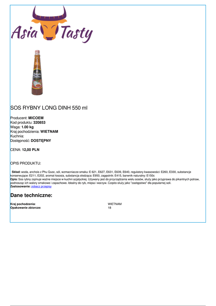 SOS RYBNY LONG DINH 550 ml Producent: MICOEM Kod produktu: 320853 Waga: 1.00 kg Kraj pochodzienia: WIETNAM Kuchnia: Dostępność: DOSTĘPNY CENA: 12,00 PLN OPIS PRODUKTU: Skład: woda, anchois z Phu Quoc, sól, wzmacniacze smaku: E 621, E627, E631, E639, E640, regulatory kwasowości: E260, E330, substancje konserwujące: E211, E202, aromat łososia, substancja słodząca: E950, zagęstnik: E415, barwnik naturalny: E150c Opis: Sos rybny zajmuje ważne miejsce w kuchni azjatyckiej. Używany jest do przyrządzania wielu sosów, służy jako przyprawa do pikantnych potraw, podnosząc ich walory smakowe i zapachowe. Idealny do ryb, mięsa i warzyw. Często służy jako "zastępstwo" dla popularnej soli. Zastosowanie: zobacz przepisy Dane techniczne: Kraj pochodzenia: Opakowanie zbiorcze: Powered by TCPDF (www.tcpdf.org) WIETNAM 18