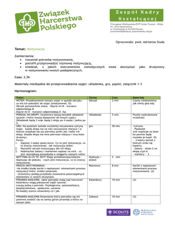 Opracowała: pwd. Adrianna Siuda Temat: Motywacja Zamierzenia: rozumiał potrzebę motywowania, potrafił przeprowadzić rozmowę motywującą, wiedział, z jakich instrumentów metodycznych w motywowaniu swoich podopiecznych, może skorzystać jako drużynowy Czas: 2,5h Materiały niezbędne do przeprowadzenia zajęć: układanka, gra, papier, załącznik 1-3 Harmonogram: Treści WSTĘP: Przedstawienie tematu zajęć w sposób okrzyku – co ma ich pobudzić do zajęć (zmotywować :D) Okrzyk powszechnie znany – Dajcie mi M – kursanci odpowiadają M Dajcie mi O – kursanci odpowiadają O itp. PODZIAŁ NA GRUPY: Uczestnicy losują kawałek układanki (puzzle ) które muszą dopasować do innych części. Układanek będą 3 więc będą 2 ekipy po 4 osoby i jedna po 5. GRA: Na puzzlach została wcześniej narysowana cytryną mapa – każda ekipa ma na niej narysowane miejsce i w którym znajduje się jej pierwszy punkt jak i kolor ich ekipy. (Każda ekipa ma inne pierwsze miejsce i inny kolor drużyny). Punty: 1. Zapytaj 3 osoby spoza kursu –Co to jest motywacja, co to znaczy motywować. Jak motywują siebie. 2. Wymyślić okrzyk motywujący dla ich ekipy 3. Nadmuchać balony i markerem napisać na nich – co jest największą przeszkodą w osiąganiu naszych celów MOTYWACJA CO TO JEST? Ekipy przedstawiają kolejno – dopisując do plakatu – czym jest motywacja, co to znaczy motywować. PROCES MOTYWOWANIA: -Na środku kładę kartki z napisanymi elementami procesu motywacji które krótko omawiam. - Uczestnicy podają przykłady stosowania poszczególnych elementów w swoich drużynach. PIRAMIDA MASLOWA: Jakie potrzeby mają nasi harcerze? Kalambury mogą pokazywać bądź rysować. Losują jedną z potrzeb- fizjologiczna, samorealizacji, bezpieczeństwa, społeczne, uznania. Po każdej scence omawiamy co i jak. PIRAMIDA MASLOWA Omawianie która potrzeba wg ich powinna znaleźć się na samej górze piramidy a która na samym dole. Forma Okrzyk Czas 2 min Materiały Czysty nieskazitelny jak nimfy głos Ady Układanka 5 min. Puzzle wydrukowane wcześniej gra 30 min -Cytryna - Pędzelek (nie wypisuje za dużo bo pewnie będę musiała je kupić :D) - 3 kolory kartek z których zrobi się koperty - balony – około 2 na ekipę czyli 6 - markery - 3 Dyskusja + plakat 5 min Rozmowa 8 min Kartki z napisanymi elementami procesu motywowania. (2) Kalambury 10 min (3) Zabawa 10 min (3) Zadaniem ekipy jest stworzyć z siebie bądź z elementów znajdujących się w Sali piramidę z odpowiednio dopasowanymi potrzebami. INSTRUMENTY METODYCZNE Szybka powtórka z instrumentów metodycznych z których zajęcia również mieli ze mną. W ekipach których byli ustawiają się w rzędach. Ostatniej osobie pokazuje kartę na której napisane jest np. pionierka Ostatnia osoba przekazuje informacje kolejnej i tak jak działa głuchy telefon. Pierwsza osoba w rzędzie biegnie do butelki do której stara się wsadzić długopis wiszący na sznurku który mają przywiązany do tyłu spodni. Ekipa której reprezentant jako pierwszy wsadził długopis do butelki odpowiada na pytanie. W połowie zamiana rekwizytu zamiast butelki przebijanie balona tyłkiem. INSTRUMENTY METODYCZNE Podsumowanie – do czego służą instrumenty metodyczne? Jak ich odpowiednio używać? Jak wygląda to u nich w drużynach, czy każdy ma indywidualną próbę czy każdy taką samą. NASZA MOTYWACJA Pierwsze prawo motywacji – osoba motywująca musi być zmotywowana. Wyciągają balony po których pisali na grze. Po kolei puszczam w obieg balon- jeżeli znajdziemy rozwiązanie problemu – skreślamy go z balonu. Kiedy wszystkie problemy znikną balon przebijamy. ROZMOWY MOTYWACYJNE Wstęp – jak powinna wyglądać rozmowa motywacyjna ROZMOWY MOTYWACYJNE Praca w podzielonych wcześniej grupach. Przedstawienie 4 różnych sytuacji hipotetycznych w życiu drużyny/ gromady z podaniem wieku osoby przedstawionej. Ekipy losują osobę i ich zadaniem jest przeprowadzić rozmowę motywującą z tą osobą. Jedna osoba z nich jest osobą motywującą druga motywowaną. Wskazane użycie instrumentów metodycznych. ZAKOŃCZENIE ZAJĘĆ Każdy kto chcę dzieli się swoim celem na przyszłość – obojętnie czy to harcerski cel czy prywatny. Tworzymy motywatory dla siebie ( wytłumaczenie dla Ciebie Frota – jest taka strona de motywatory możesz zerknąć – ale teraz robimy motywatory :D) 15 min 3 3 3 9 puste butelki sznurki długopisy balonów 5 min 10 min 5 min 10 min na przygotowanie + po 7 min na prezentacje i omówienie (4) tematy rozmów 30 min 15 min Gazety Kartki papieru Klej Nożyczki Pisaki Załącznik 1 Proces motywowania Poznanie osobowości, potrzeb, zainteresowań i aspiracji harcerzy Wyznaczenie zadań w sposób umożliwiający samokontrolę postępu Dobra wewnętrzna komunikacja (przepływ informacji) Ustalenie zasad nagradzania Stosowanie środków motywacji Okresowe oceny postępów dokonanych przez harcerzy Jakiś brak – potrzeba- chęć zaspokojenia potrzeby – określony cel – motywacja do osiągnięcia celu – osiągnięcie celu Załącznik 2 ZUCH Zosia ma 9 lat jest zawsze wesoła i uśmiechnięta, grupa bardzo ją lubi, ale Zosia szybko traci zapał do zabawy ponieważ większość rzeczy jej się nie udaje i wtedy szybko się poddaje. Chcielibyśmy aby Zosia uwierzyła w siebie. HARCERZ Jacek ma 11 lat, jest bardzo energiczny i żywiołowy, przychodzi raczej często na zbiórki chyba, że spotka kogoś po drodze i nie będzie mu się chciało. Chłopacy w drużynie bardzo go lubią i robią wszystko co wymyśli. Jacek przeszkadza nam na zbiórkach swoimi wygłupami namawiając do nich innych harcerzy. Chcielibyśmy aby Jacek nam pomagał i chcemy wykorzystać jego zdolności przywódcze HARCERZ STARSZY Maciej ma 14 lat, jest bardzo nieśmiały i małomówny ale zarazem inteligentny. Regularnie przychodzi na zbiórki i wyjazdy, bardzo lubi czytać. Chcielibyśmy aby Maciek był bardziej aktywny na