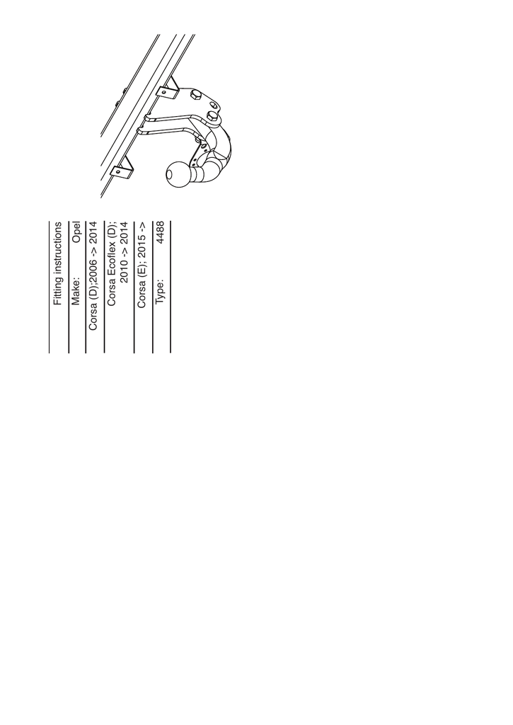 Opel Type: 4488 Corsa (E); 2015 -> Corsa Ecoflex (D); 2010 -> 2014 Corsa (D);2006 -> 2014 Make: Fitting instructions Couplingsclass: A50-X euro tested Approved Approved 94/20/EC e11 00-6341 M10 17 46 Nm M12 19 71Nm (self-locking) Approved Max. mass trailer : 1300 kg Max. vertical load : 50 kg D-Value: 7,5 kN 8.8 10.9 8 10 1000km 0km + © 448870/15-01-2015/1 © 448870/15-01-2015/13 ø25x10,5 L=4 40x40 L=5 B M10x40 Existing Flange nut (10) 71 Nm 16 A M10x40 Existing clips X 4488/4 C 448880 M12 (Self-locking) ø25x10,5 L=4 9520092 40x40 L=5 9530902 C M12x65 Existing Flange nut (10) M10x40 ø25x10,5 L=4 M10x40 71 Nm 16 A B © 448870/15-01-2015/2 NL MONTAGEHANDLEIDING: 1. Demonteer de bumper inclusief de stalen stootbalk van het voertuig, de stootbalk wordt niet meer gebruikt. (Zie figuur 1). 2. Monteer deel X aan de trekhaak. (Zie figuur 2). 3. Plaats de trekhaak in het chassis. 4. Bevestig de trekhaak t.p.v. de punten A, B en C. 5. Draai alle bouten en moeren overeenkomstig tabel vast. 6. Corsa (D);2006-2014 + Corsa (D)Ecoflex;2010-2014 : Zaag in het midden aan de onderzijde van de bumper een deel van 66 mm breed en 95 mm diep uit. Corsa (E);2015: Zaag in het midden aan de onderzijde van de bumper een deel van 70 mm breed en 110 mm diep uit. 7. Monteer het verwijderde. 8. Monteer de kogelstang inclusief stekkerplaat. 9. Draai alle bouten en moeren overeenkomstig tabel vast. Raadpleeg voor demontage en montage van voertuig onderdelen het werkplaats handboek. Raadpleeg voor montage en bevestigingsmiddelen de schets. BELANGRIJK: * Voor eventueel noodzakelijke aanpassing(en) “van het voertuig” dient men de dealer te raadplegen. * Indien op de bevestigingspunten een bitumen of anti-dreunlaag aanwezig is, dient deze verwijderd te worden. * Voor de max. toegestane massa, welke uw auto mag trekken, dient u uw dealer te raadplegen. * Bij het boren dient men er zorg voor te dragen, dat electriciteits-, rem- en brandstofleidingen niet worden geraakt. * Verwijder "indien aanwezig" de plastik dopjes uit de puntlasmoeren. * Deze handleiding dient na montage bij de voertuigpapieren gevoegd te worden. GB FITTING INSTRUCTIONS: 1. Remove the bumper and the steel buffer beam from the vehicle. The buffer beam will no longer be needed. (See figure 1). 2. Attach part X to the tow bar. (See figure 2). 3. Position the tow bar in the chassis. 4. Attach the tow bar at points A, B and C. 5. Tighten all nuts and bolts to the torque indicated in the table. 6. Corsa (D);2006-2014 + Corsa (D)Ecoflex;2010-2014 : On the underside of the middle of the bumper, saw out a portion measuring 66 mm wide and 95 mm deep. Corsa (E);2015: On the underside of the middle of the bumper, saw out a portion measuring 70 mm wide and 110 mm deep. 7. Fit the section removed. 8. Fit the ball hitch, including socket plate. 9. Tighten all nuts and bolts to the torque indicated in the table. For dismantling and fitting the vehicle parts, see the site handbook. For fitting instructions and attachment method, see drawing. NOTE: * Should this installation process entail the cutting of the bumper – conformation MUST be obtained by the installation engineer of the customer’s acceptance prior to completion. Brink International do not accept responsibility for any matters arising as a result of this miscommunication. * The dealer should be consulted for possible necessary adjustment(s) "of the vehicle". * Remove the insulating material from the contact area of the fitting points. * Consult your dealer for the maximum tolerated pull weight and ball hitch pressure of your vehicle. * Do not drill through electrical-, brake- or fuellines. * Remove (if present) the plastic caps from the spot welding nuts. * This fitting instruction has to be enclosed in the vehicle documents after fitting the towbar. © 448870/15-01-2015/3 X Fig.2 X © 448870/15-01-2015/12 X X D Fig.1-2 D MONTAGEANLEITUNG: 1. Die Stoßstange einschließlich des stählernen Stoßbalkens vom Fahrzeug abmontieren. Der Stoßbalken wird nicht mehr benötigt. (Siehe Abbildung 1). 2. Teil X an die Anhängervorrichtung montieren. (Siehe Abbildung 2). 3. Die Anhängervorrichtung in das Langsträger einsetzen. 4. Die Anhängervorrichtung bei den Punkten A, B und C anbringen. 5. Alle Schrauben und Muttern gemäß den Angaben in der Tabelle festdrehen. 6. Corsa (D);2006-2014 + Corsa (D)Ecoflex;2010-2014: Auf der Unterseite der Stoßstange in der Mitte einen 66 mm breiten und 95 mm tiefen Teil herausschneiden. Corsa (E);2015: Auf der Unterseite der Stoßstange in der Mitte einen 70 mm breiten und 110 mm tiefen Teil herausschneiden. 7. Das Entfernte montieren. 8. Die Kugelstange einschließlich Steckdosenplatte montieren. 9. Alle Schrauben und Muttern gemäß den Angaben in der Tabelle festdrehen. Für die Demontage und Montage von Fahrzeugteilen das WerkstattHandbuch zu Rate ziehen. Für die Montage und die Befestigungsmittel die Skizze zu Rate ziehen. HINWEISE: * Für (eine) eventuell erforderliche Anpassung(en) "des Fahrzeugs" ist der Händler zu Rate zu ziehen. * Im Bereich der Anlageflächen muß Unterbodenschutz, Hohlraumkonservierung (Wachs) und Antidröhnmaterial entfernt werden. * Vor dem Bohren prüfen, daß keine, dort eventuell vorhandene Leitungen beschädigt werden können. * Alle Bohrspäne entfernen und gebohrte Löcher gegen Korrosion schützen. * Entfernen Sie "falls vorhanden", die Plastikkappen von den Punktschweißmuttern. © 448870/15-01-2015/11 * Für das höchstzulässige Zuggewicht und der erlaubte Kugeldruck Ihres Fahrzeugs ist IhrHändler zu befragen. * Die Quetschmuttern müssen nach einem späteren lösen der Muttern gegen neue ausgetauscht werden, da ansonsten die Sicherungswirkung nicht mehr garantiert ist! F INSTRUCTIONS DE MONTAGE: 1. Déposer le pare-chocs du véhicule y compris la traverse en acier la traverse ne sera plus utilisée. (Voir la figure 1). 2. Monter la partie X sur l’attelage. (Voir la figure 2). 3. Positionner l’attache-remorque dans le châssi