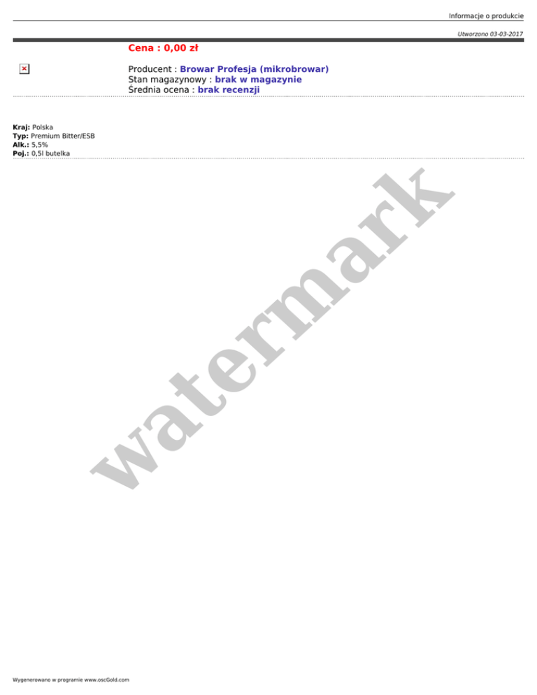 Informacje o produkcie Utworzono 03-03-2017 Cena : 0,00 zł Producent : Browar Profesja (mikrobrowar) Stan magazynowy : brak w magazynie Średnia ocena : brak recenzji w at er m ar k Kraj: Polska Typ: Premium Bitter/ESB Alk.: 5,5% Poj.: 0,5l butelka Wygenerowano w programie www.oscGold.com