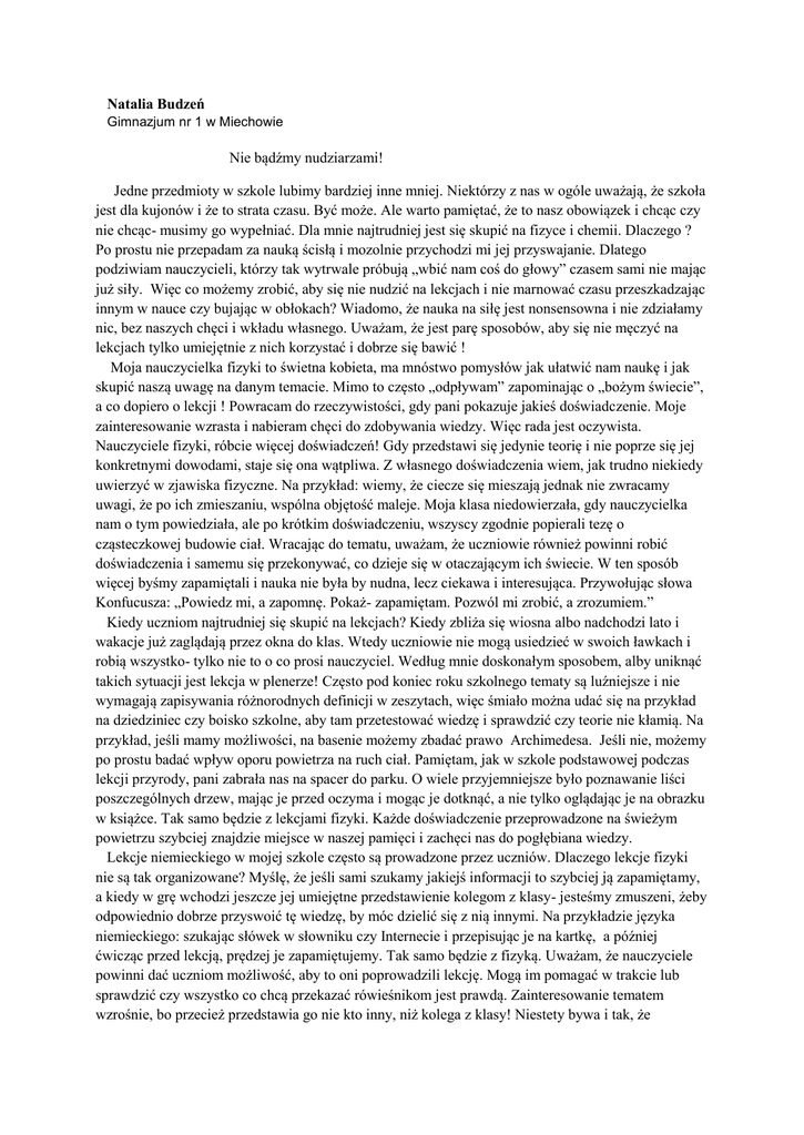 Natalia Budzeń Gimnazjum nr 1 w Miechowie Nie bądźmy nudziarzami! Jedne przedmioty w szkole lubimy bardziej inne mniej. Niektórzy z nas w ogóle uważają, że szkoła jest dla kujonów i że to strata czasu. Być może. Ale warto pamiętać, że to nasz obowiązek i chcąc czy nie chcąc- musimy go wypełniać. Dla mnie najtrudniej jest się skupić na fizyce i chemii. Dlaczego ? Po prostu nie przepadam za nauką ścisłą i mozolnie przychodzi mi jej przyswajanie. Dlatego podziwiam nauczycieli, którzy tak wytrwale próbują „wbić nam coś do głowy” czasem sami nie mając już siły. Więc co możemy zrobić, aby się nie nudzić na lekcjach i nie marnować czasu przeszkadzając innym w nauce czy bujając w obłokach? Wiadomo, że nauka na siłę jest nonsensowna i nie zdziałamy nic, bez naszych chęci i wkładu własnego. Uważam, że jest parę sposobów, aby się nie męczyć na lekcjach tylko umiejętnie z nich korzystać i dobrze się bawić ! Moja nauczycielka fizyki to świetna kobieta, ma mnóstwo pomysłów jak ułatwić nam naukę i jak skupić naszą uwagę na danym temacie. Mimo to często „odpływam” zapominając o „bożym świecie”, a co dopiero o lekcji ! Powracam do rzeczywistości, gdy pani pokazuje jakieś doświadczenie. Moje zainteresowanie wzrasta i nabieram chęci do zdobywania wiedzy. Więc rada jest oczywista. Nauczyciele fizyki, róbcie więcej doświadczeń! Gdy przedstawi się jedynie teorię i nie poprze się jej konkretnymi dowodami, staje się ona wątpliwa. Z własnego doświadczenia wiem, jak trudno niekiedy uwierzyć w zjawiska fizyczne. Na przykład: wiemy, że ciecze się mieszają jednak nie zwracamy uwagi, że po ich zmieszaniu, wspólna objętość maleje. Moja klasa niedowierzała, gdy nauczycielka nam o tym powiedziała, ale po krótkim doświadczeniu, wszyscy zgodnie popierali tezę o cząsteczkowej budowie ciał. Wracając do tematu, uważam, że uczniowie również powinni robić doświadczenia i samemu się przekonywać, co dzieje się w otaczającym ich świecie. W ten sposób więcej byśmy zapamiętali i nauka nie była by nudna, lecz ciekawa i interesująca. Przywołując słowa Konfucusza: „Powiedz mi, a zapomnę. Pokaż- zapamiętam. Pozwól mi zrobić, a zrozumiem.” Kiedy uczniom najtrudniej się skupić na lekcjach? Kiedy zbliża się wiosna albo nadchodzi lato i wakacje już zaglądają przez okna do klas. Wtedy uczniowie nie mogą usiedzieć w swoich ławkach i robią wszystko- tylko nie to o co prosi nauczyciel. Według mnie doskonałym sposobem, alby uniknąć takich sytuacji jest lekcja w plenerze! Często pod koniec roku szkolnego tematy są luźniejsze i nie wymagają zapisywania różnorodnych definicji w zeszytach, więc śmiało można udać się na przykład na dziedziniec czy boisko szkolne, aby tam przetestować wiedzę i sprawdzić czy teorie nie kłamią. Na przykład, jeśli mamy możliwości, na basenie możemy zbadać prawo Archimedesa. Jeśli nie, możemy po prostu badać wpływ oporu powietrza na ruch ciał. Pamiętam, jak w szkole podstawowej podczas lekcji przyrody, pani zabrała nas na spacer do parku. O wiele przyjemniejsze było poznawanie liści poszczególnych drzew, mając je przed oczyma i mogąc je dotknąć, a nie tylko oglądając je na obrazku w książce. Tak samo będzie z lekcjami fizyki. Każde doświadczenie przeprowadzone na świeżym powietrzu szybciej znajdzie miejsce w naszej pamięci i zachęci nas do pogłębiana wiedzy. Lekcje niemieckiego w mojej szkole często są prowadzone przez uczniów. Dlaczego lekcje fizyki nie są tak organizowane? Myślę, że jeśli sami szukamy jakiejś informacji to szybciej ją zapamiętamy, a kiedy w grę wchodzi jeszcze jej umiejętne przedstawienie kolegom z klasy- jesteśmy zmuszeni, żeby odpowiednio dobrze przyswoić tę wiedzę, by móc dzielić się z nią innymi. Na przykładzie języka niemieckiego: szukając słówek w słowniku czy Internecie i przepisując je na kartkę, a później ćwicząc przed lekcją, prędzej je zapamiętujemy. Tak samo będzie z fizyką. Uważam, że nauczyciele powinni dać uczniom możliwość, aby to oni poprowadzili lekcję. Mogą im pomagać w trakcie lub sprawdzić czy wszystko co chcą przekazać rówieśnikom jest prawdą. Zainteresowanie tematem wzrośnie, bo przecież przedstawia go nie kto inny, niż kolega z klasy! Niestety bywa i tak, że uczniowie nie chcą prowadzić lekcji, należy ich wtedy odpowiednio zachęcić, może jakąś dobrą oceną… Kończąc swoje rozważania na temat lekcji fizyki i urozmaicania ich, pragnę przypomnieć, nam uczniom, że to nie tylko nauczyciel ma się starać. Przede wszystkim, to my powinniśmy wyjść z inicjatywą zmiany stylu lekcji do nauczyciela. Jeśli się zgodzi, lekcje nie będą monotonne, a my dowiemy się więcej, zapamiętamy więcej i z pewnością zyskamy lepsze oceny!