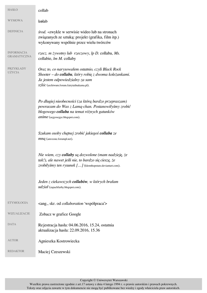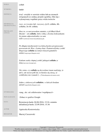 HASŁO collab WYMOWA kolab DEFINICJA środ. «zwykle w serwisie wideo lub na stronach związanych ze sztuką: projekt (grafika, film itp.) wykonywany wspólnie przez wielu twórców» INFORMACJA GRAMATYCZNA rzecz. m żywotny lub rzeczowy, lp D. collaba, Ms. collabie, lm M. collaby PRZYKŁADY UŻYCIA Oraz to, co narysowałem ostatnio, czyli Black Rock Shooter – do collabu, który robię z dwoma koleżankami. Ja jestem odpowiedzialny za sam szkic (archiwum.forum.fairytailnakama.pl). Po długiej nieobecności (za którą bardzo przepraszam) powracam do Was z Lamą-chan. Postanowiłyśmy zrobić blogowego collaba na temat różnych gatunków anime (aegyosegye.blogspot.com). Szukam osoby chętnej zrobić jakiegoś collaba ze mną (amvzone.forumpl.net). Nie wiem, czy collaby są dozwolone (mam nadzieję, że tak!), ale nawet jeśli nie, to bardzo się cieszę, że zrobiłyśmy ten rysunek […] (klemthepotato.deviantart.com). Jeden z ciekawszych collabów, w których brałam udział (zapachfarby.blogspot.com). ETYMOLOGIA WIZUALIZACJE <ang., skr. od collaboration ‘współpraca’> Zobacz w grafice Google DATA Rejestracja hasła: 04.06.2016, 15.24, ostatnia aktualizacja hasła: 22.09.2016, 15.36 AUTOR Agnieszka Kostrowiecka REDAKTOR Maciej Czeszewski Copyright © Uniwersytet Warszawski Wszelkie prawa zastrzeżone zgodnie z art.17 ustawy z dnia 4 lutego 1994 r. o prawie autorskim i prawach pokrewnych. Teksty oraz zdjęcia zawarte w tym dokumencie nie mogą być publikowane bez wiedzy i zgody właściciela praw autorskich. Powered by TCPDF (www.tcpdf.org)