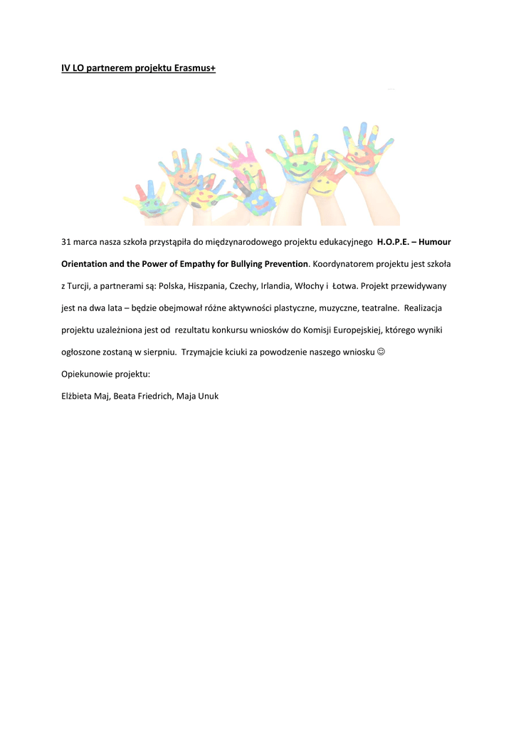 IV LO partnerem projektu Erasmus+ 31 marca nasza szkoła przystąpiła do międzynarodowego projektu edukacyjnego H.O.P.E. – Humour Orientation and the Power of Empathy for Bullying Prevention. Koordynatorem projektu jest szkoła z Turcji, a partnerami są: Polska, Hiszpania, Czechy, Irlandia, Włochy i Łotwa. Projekt przewidywany jest na dwa lata – będzie obejmował różne aktywności plastyczne, muzyczne, teatralne. Realizacja projektu uzależniona jest od rezultatu konkursu wniosków do Komisji Europejskiej, którego wyniki ogłoszone zostaną w sierpniu. Trzymajcie kciuki za powodzenie naszego wniosku Opiekunowie projektu: Elżbieta Maj, Beata Friedrich, Maja Unuk
